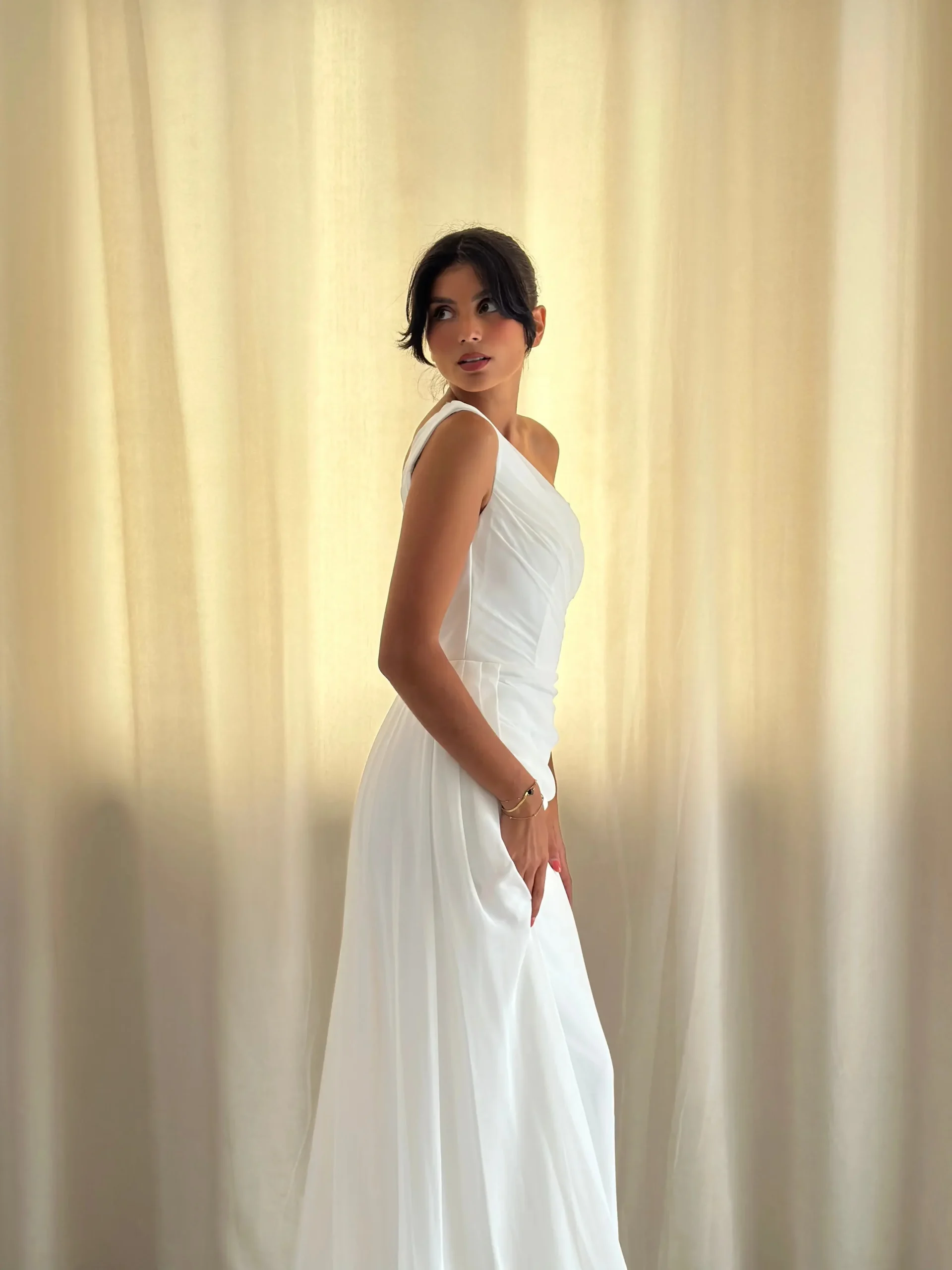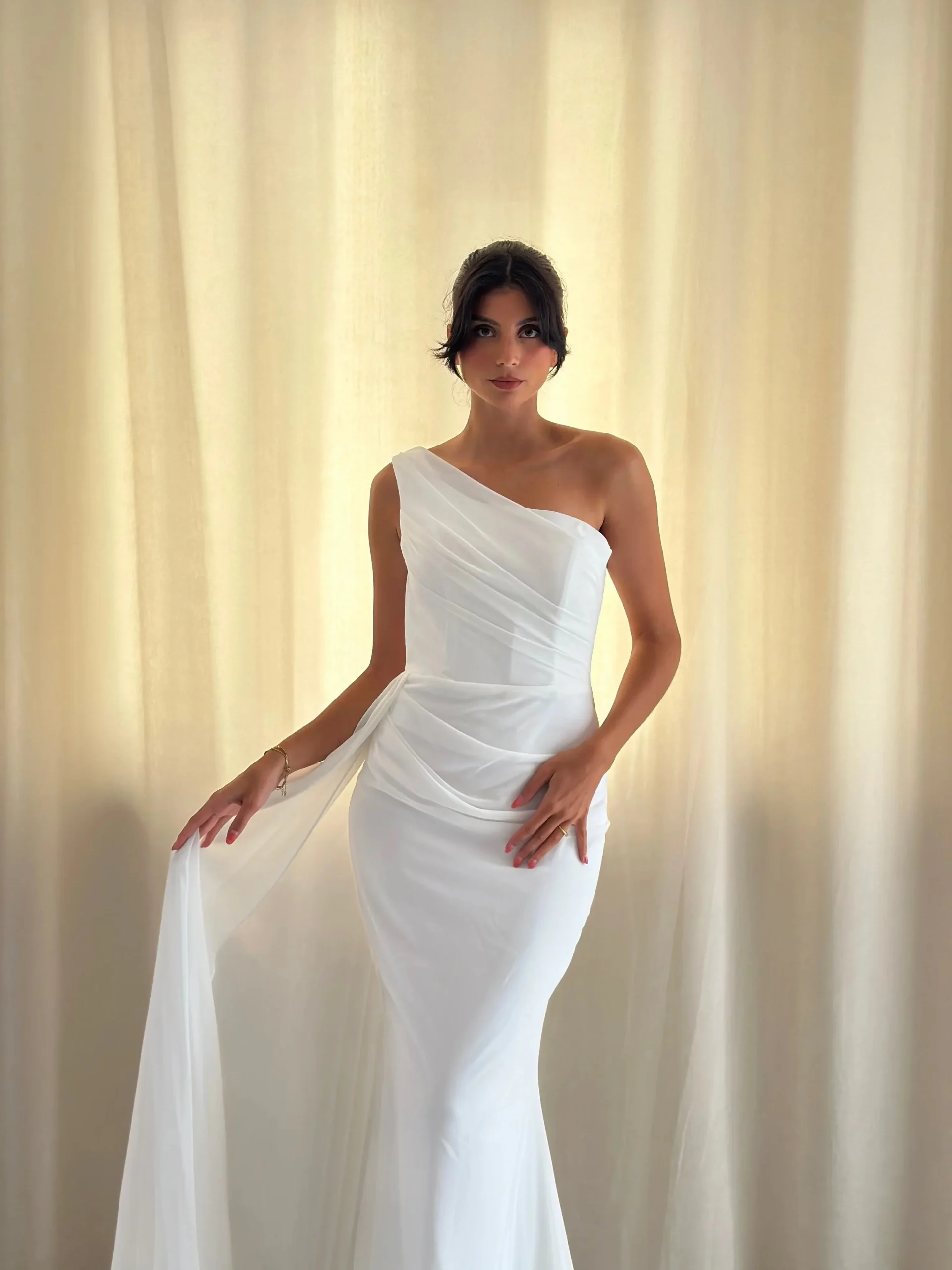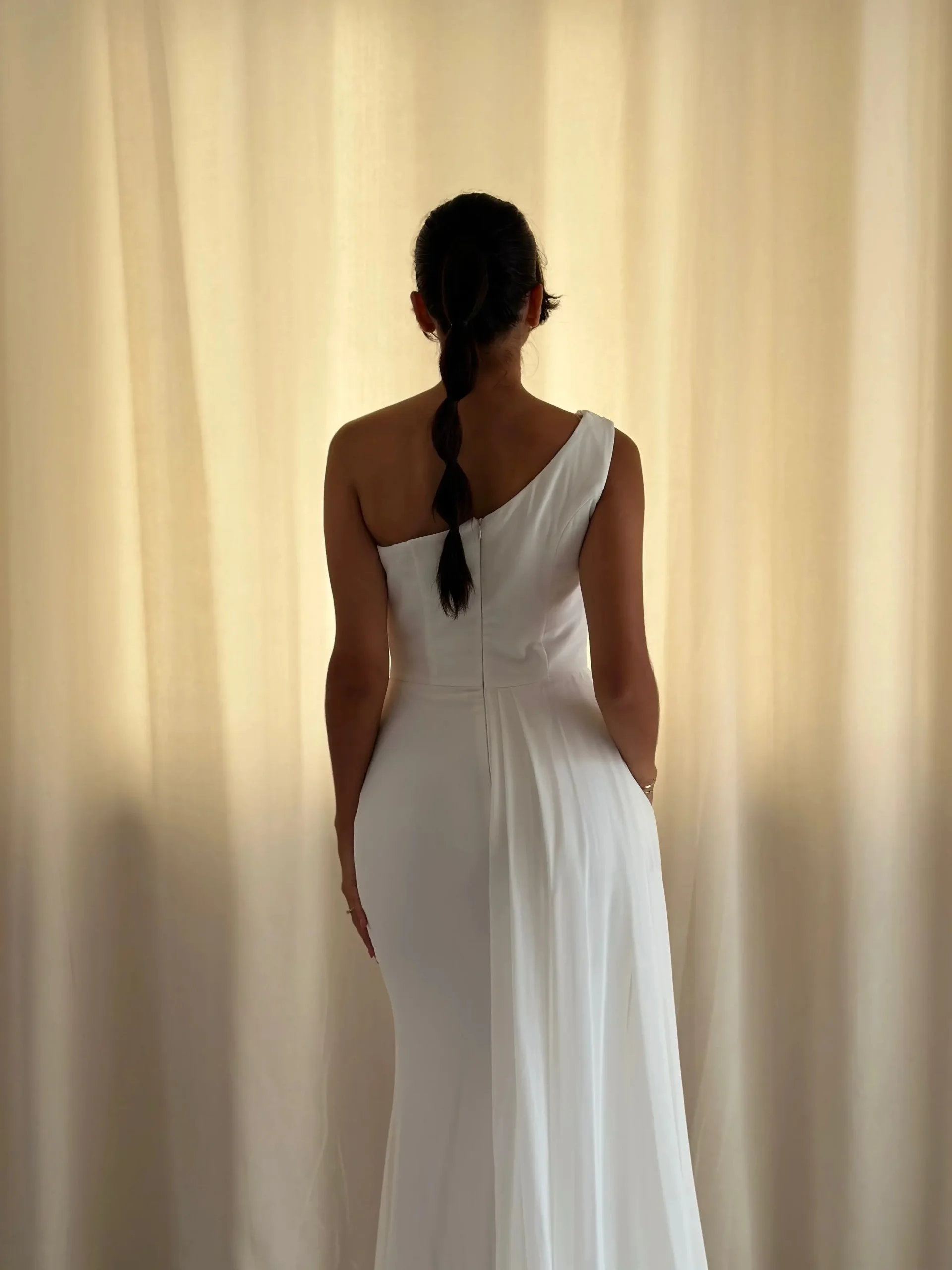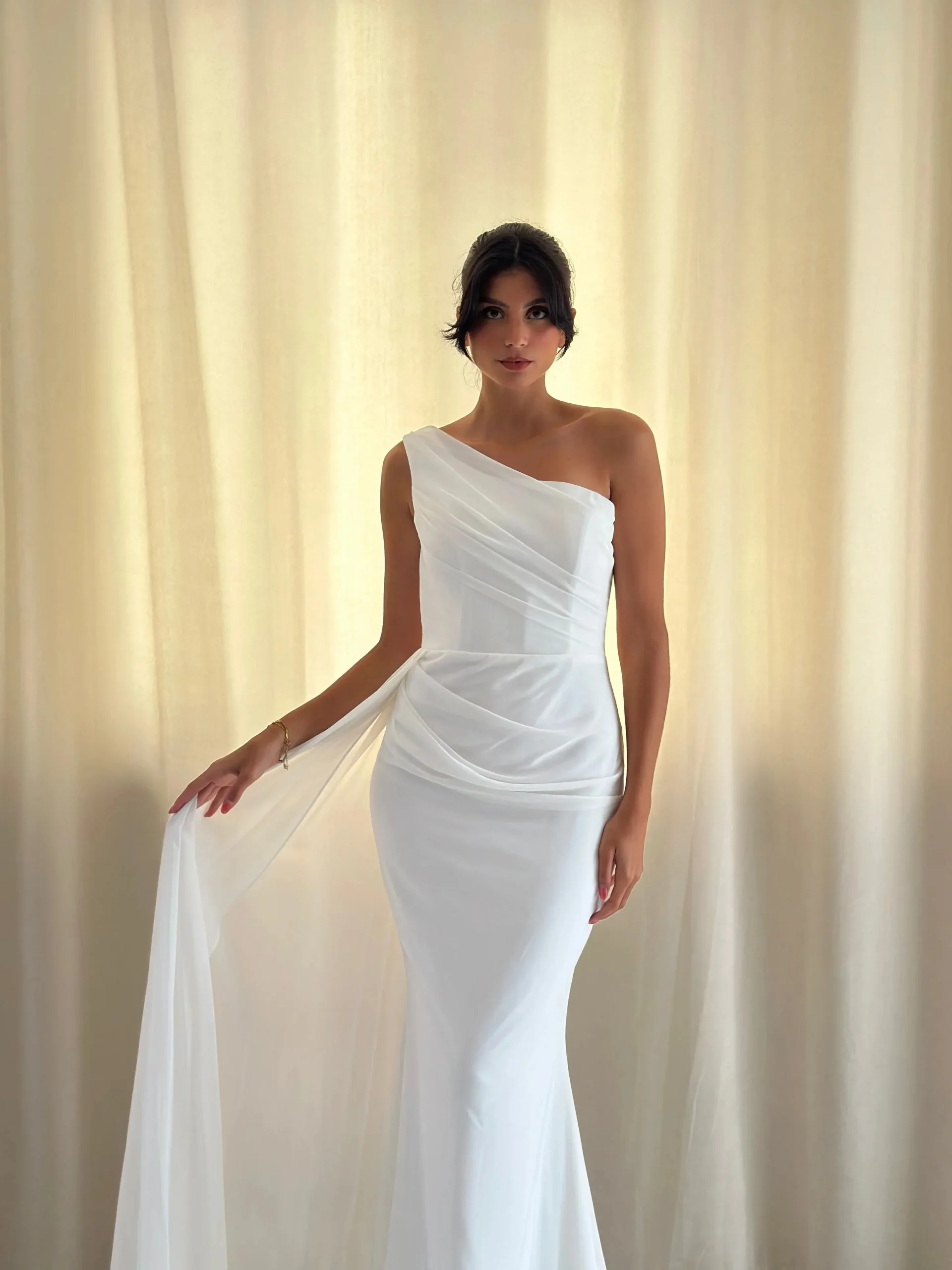 La robe est confectionnée en tissu léger et fluide, assurant un confort optimal tout au long de votre journée spéciale. Son design épuré et sans manche met en valeur les épaules et les bras, offrant une allure à la fois moderne et classique. Le col asymétrique ajoute une touche d’originalité, tandis que les drapés délicats créent un effet de mouvement et de légèreté.