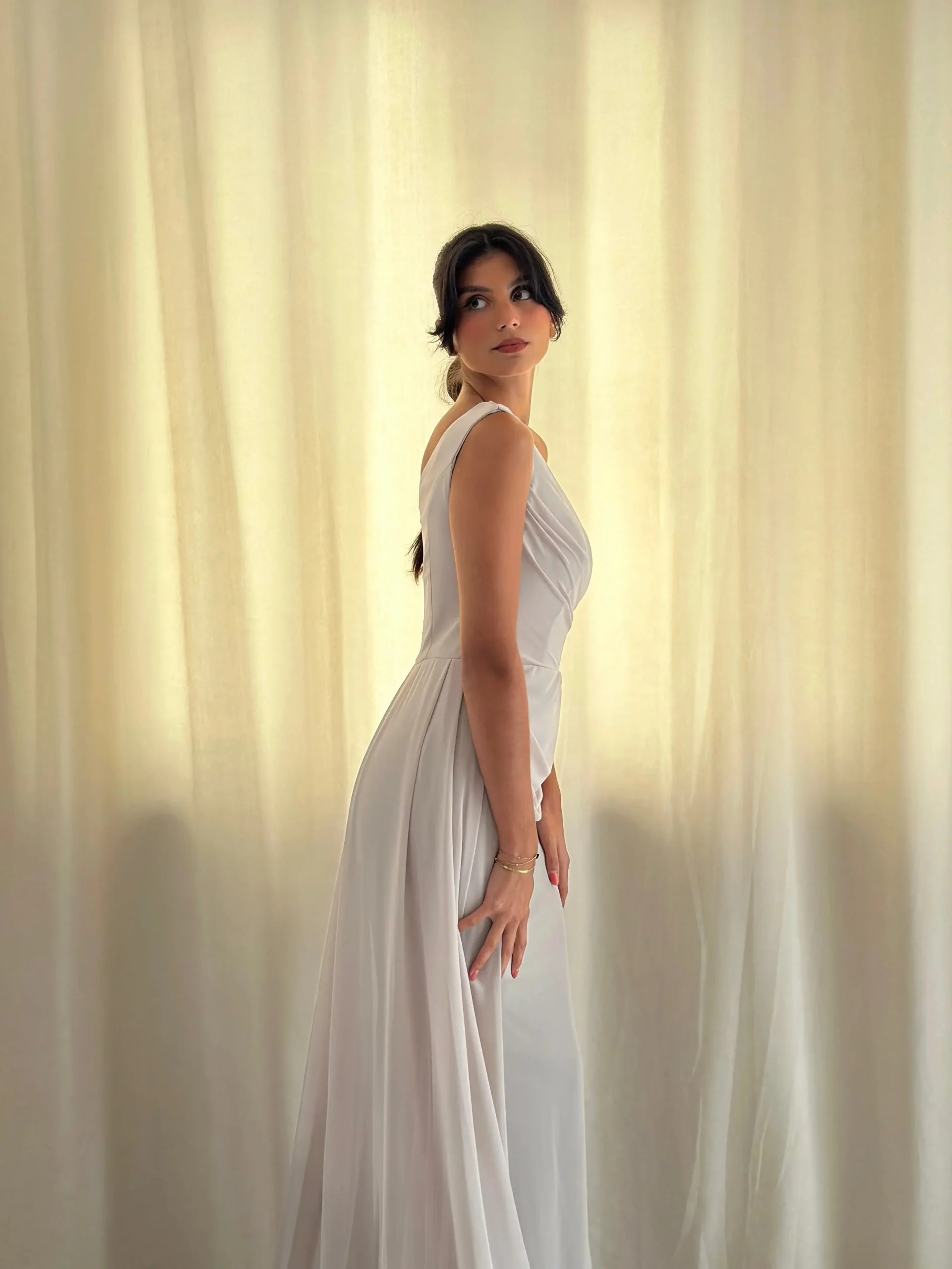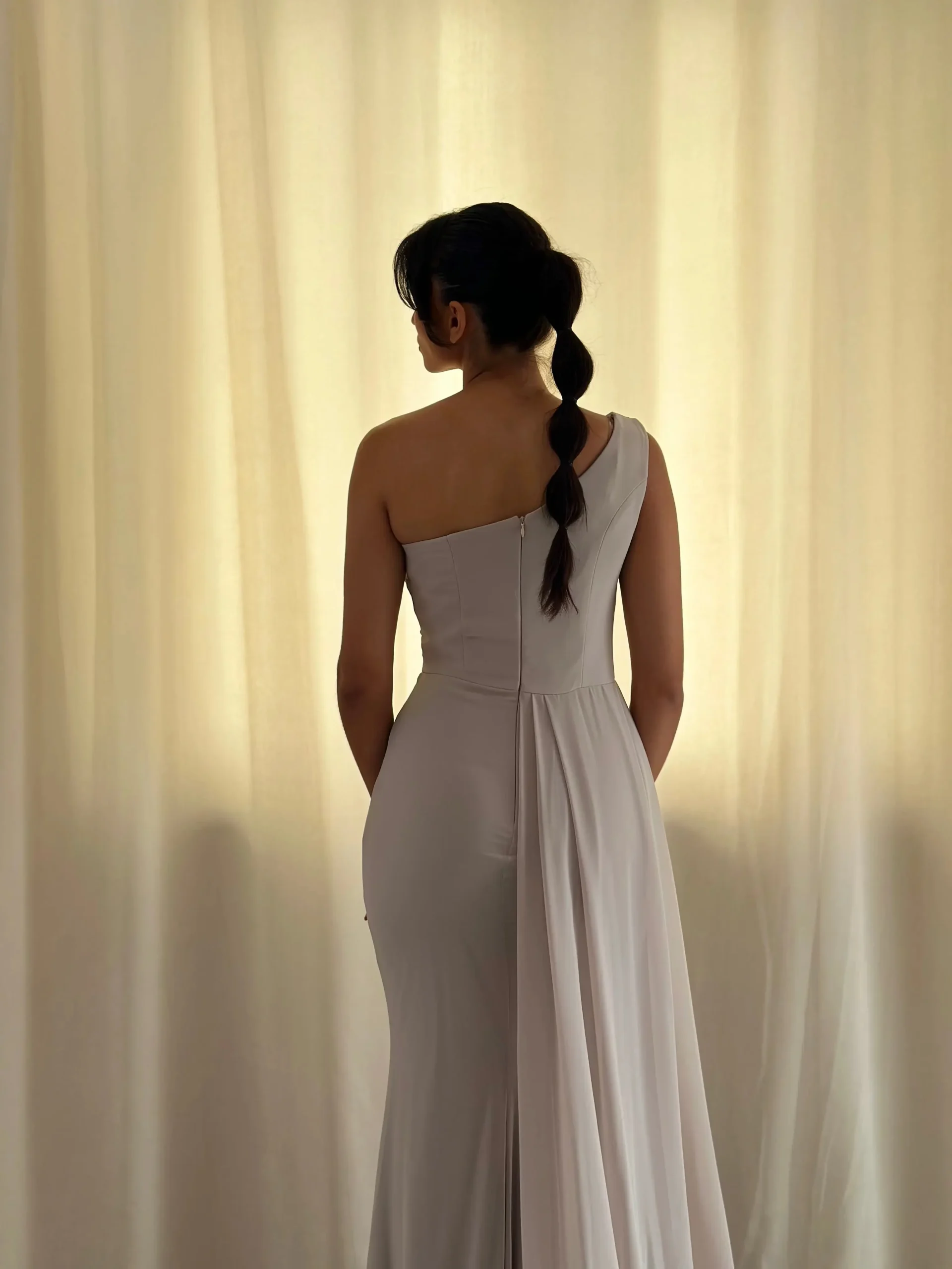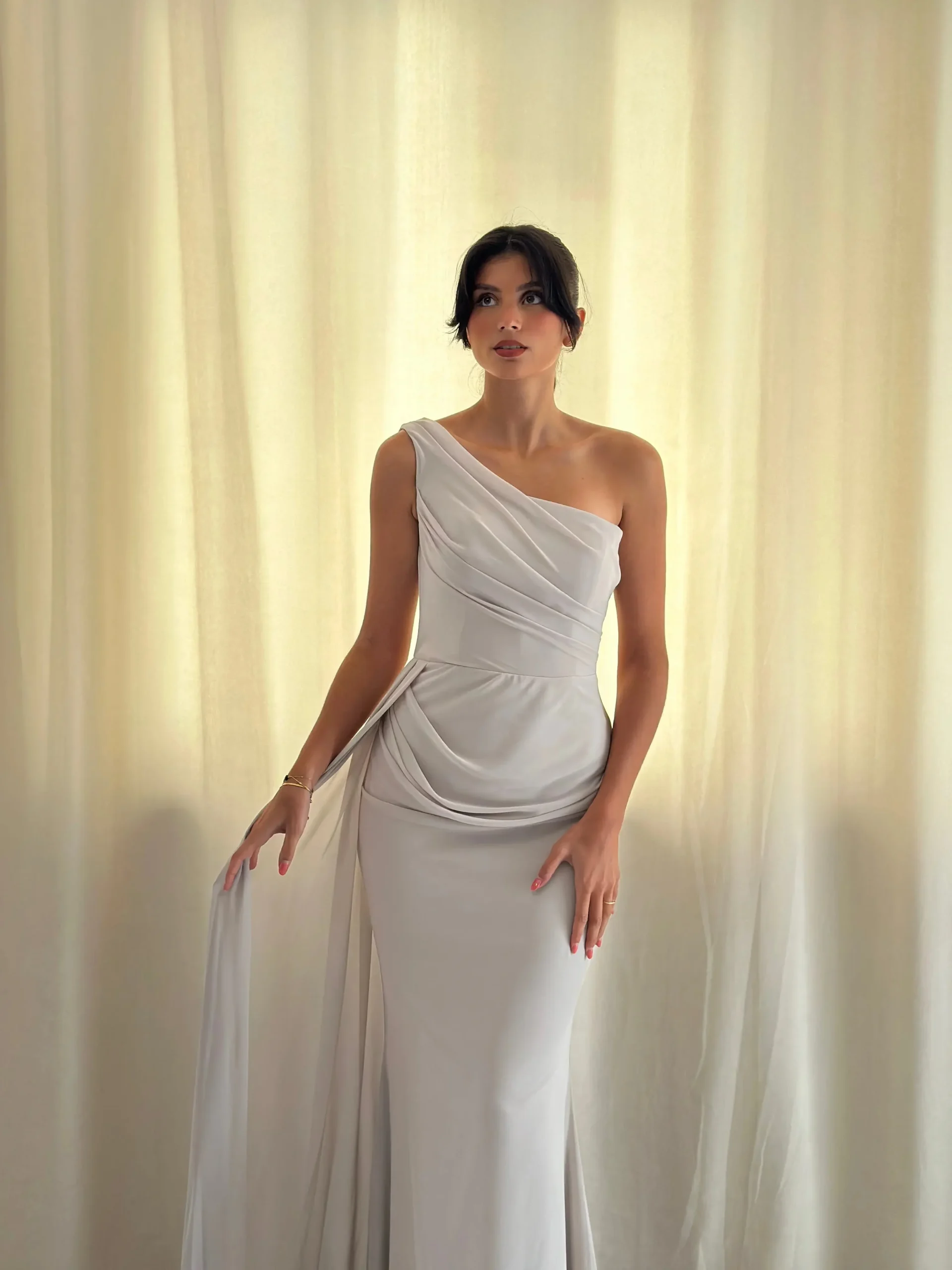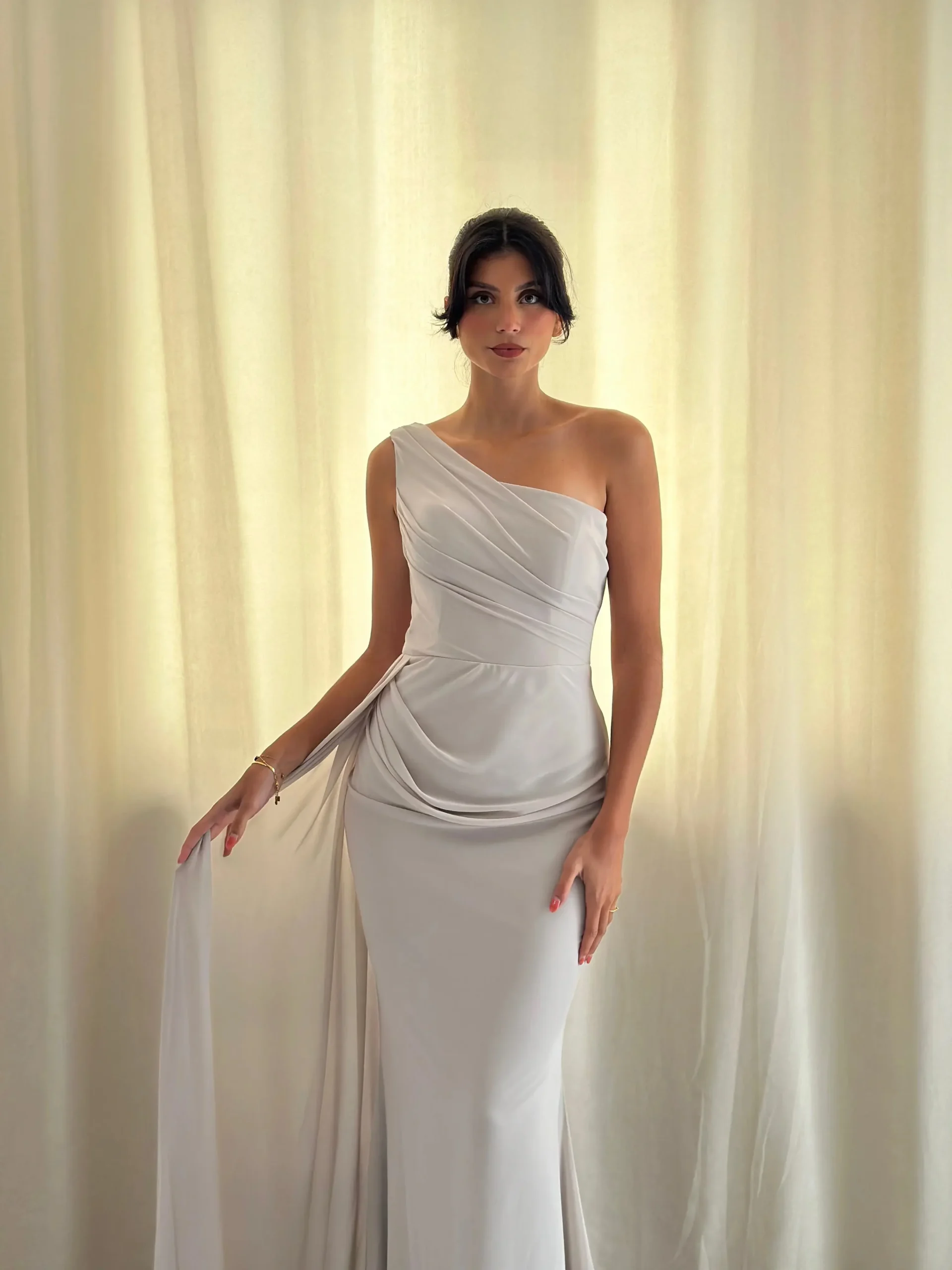 Le décolleté asymétrique, à la fois chic et original, attire l’œil et apporte une touche de modernité. En outre, les drapés délicats au niveau du buste et de la taille ajoutent du mouvement, créant un effet visuel harmonieux et élégant. Le tissu, légèrement satiné, capte subtilement la lumière, donnant ainsi une touche de brillance raffinée à l’ensemble.
