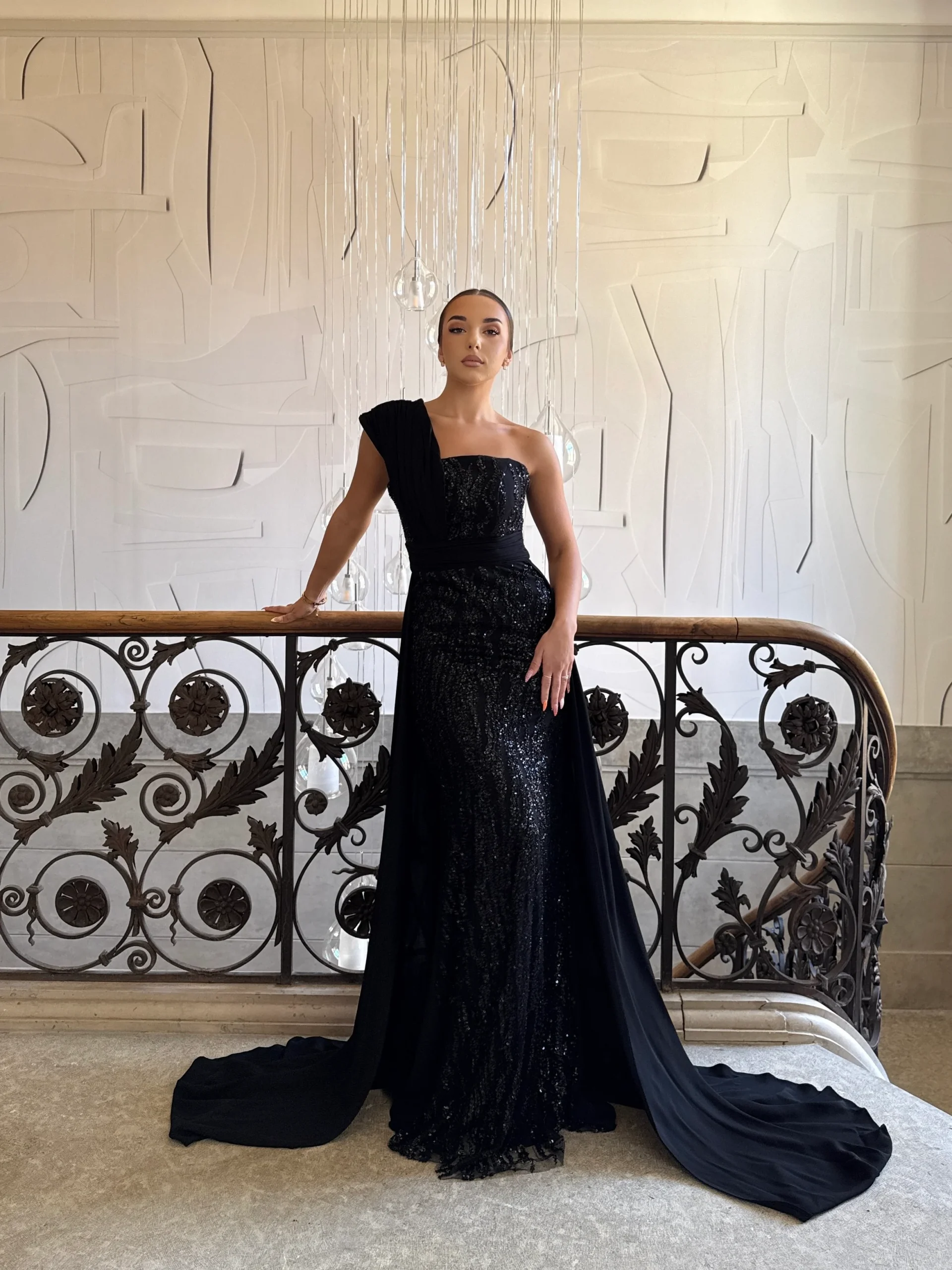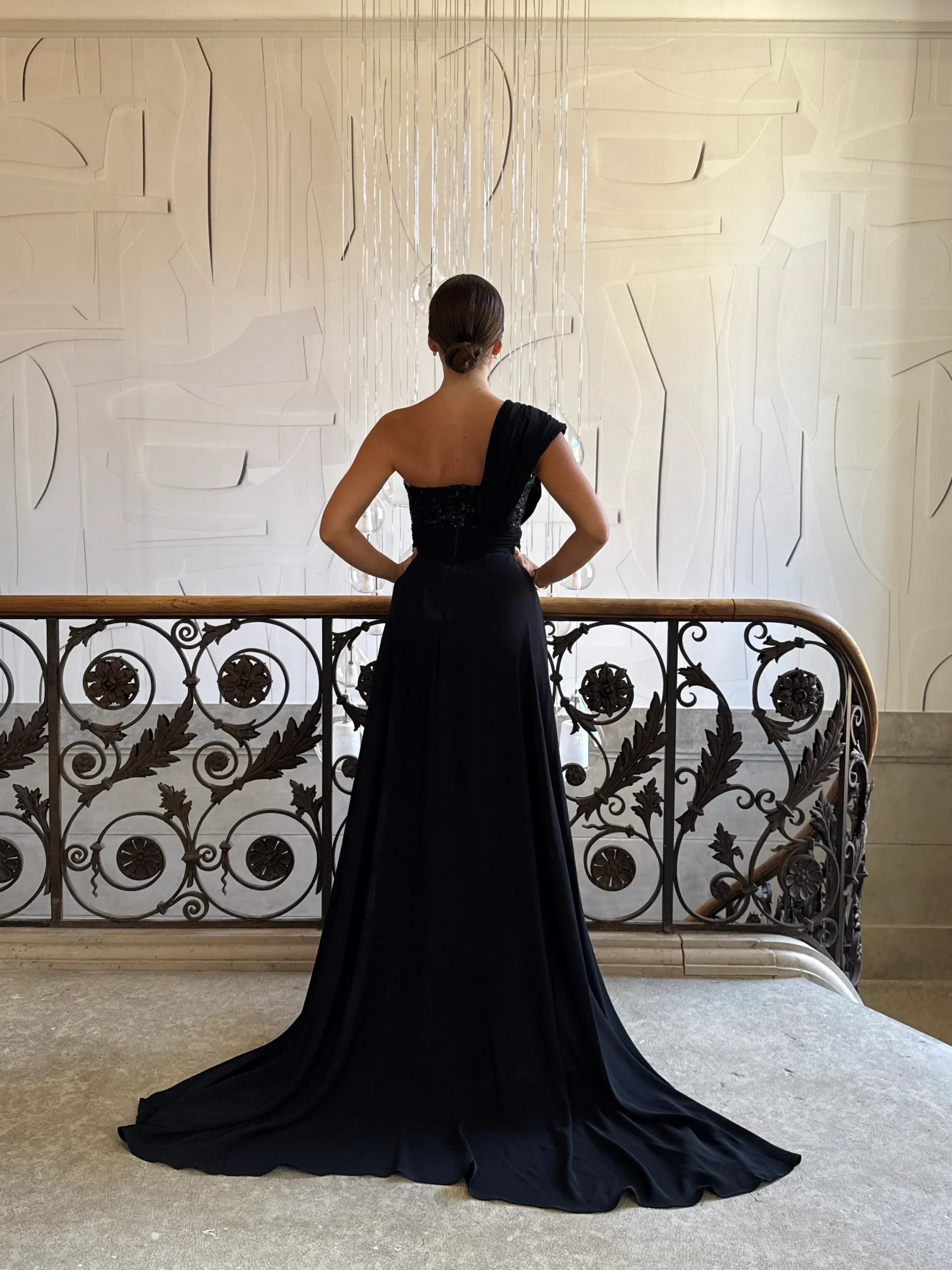 Cette robe de soirée noir chic séduit par l’équilibre parfait entre sobriété et éclat. En effet, son bustier délicatement orné de fines perles et de sequins scintillants reflète la lumière avec subtilité. De plus, la traîne longue et fluide, non amovible, allonge la silhouette et confère une prestance remarquable. Ainsi, cette création sans manches incarne la modernité et la féminité tout en assurant un confort optimal.