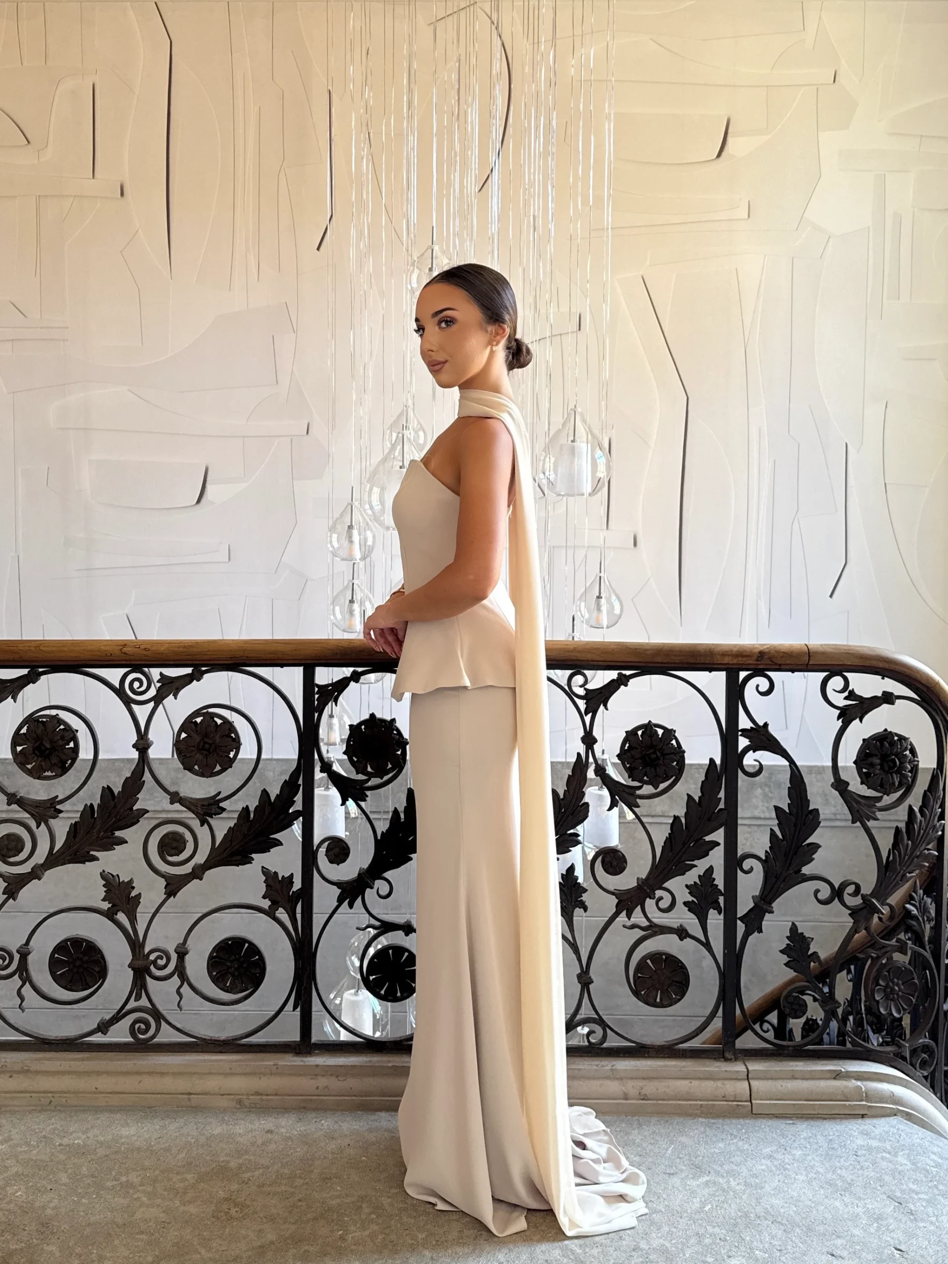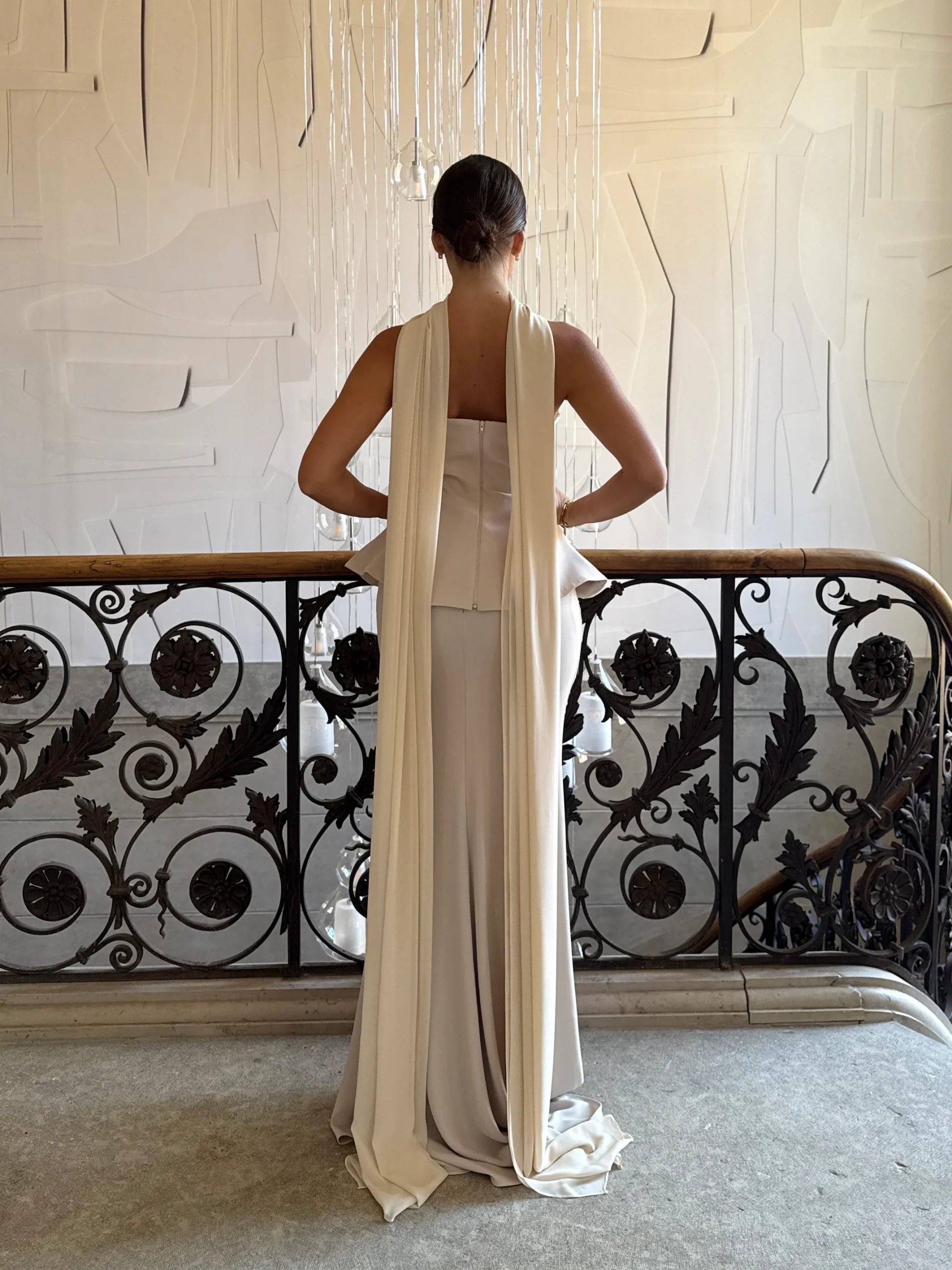 Robe de soirée élégante beige, chic et intemporelle