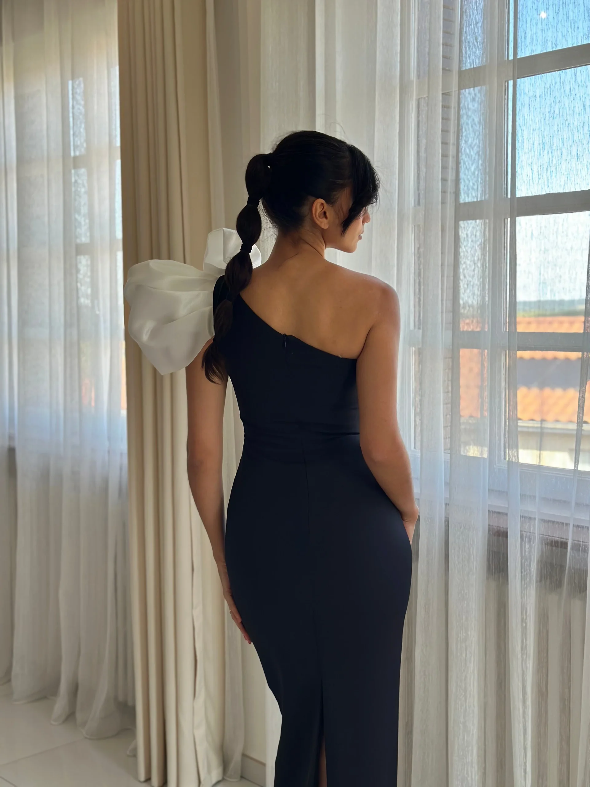 Découvrez notre élégante robe longue en organza de couleur blanc et noir, parfaite pour les grandes occasions. Cette robe se distingue par son col asymétrique orné d’un majestueux nœud en organza, apportant une touche de sophistication et de raffinement. La partie supérieure de la robe est confectionnée en organza, un tissu léger, transparent et rigide, […]