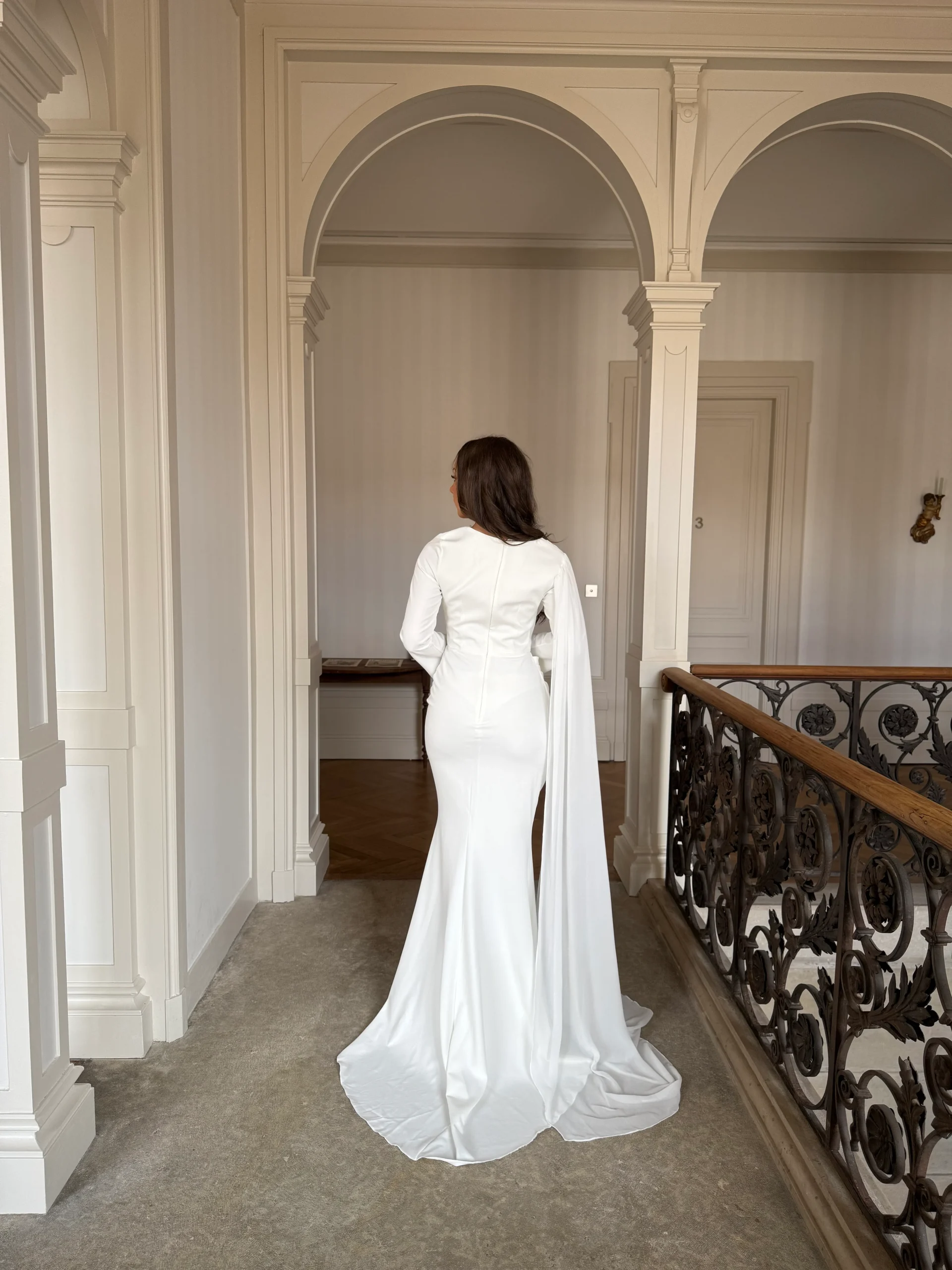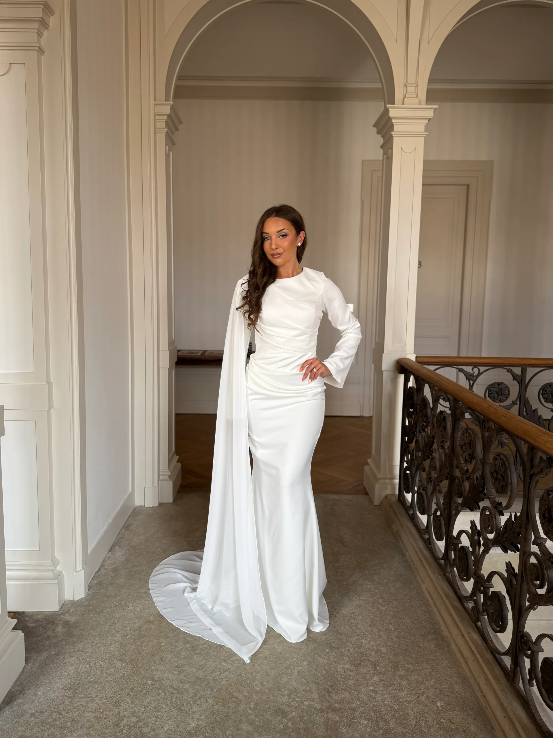 Cette robe de soirée blanche élégante séduit par sa simplicité maîtrisée et son raffinement discret. En effet, son tissu fluide assure un tombé harmonieux et agréable à porter. Le drapé délicat à la taille souligne subtilement les courbes, apportant une touche féminine sans excès. Par ailleurs, sa coupe droite, sans fente, garantit une allure distinguée et confortable. Les manches longues viennent parfaire l’ensemble en ajoutant une note de grâce et de sobriété.