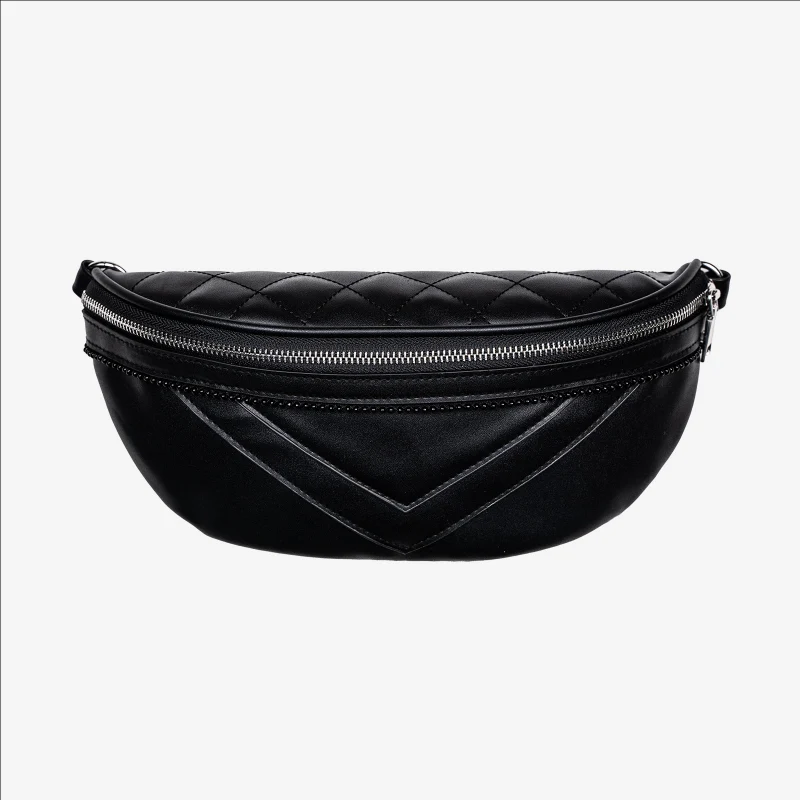 Vintage mais tendance, pratique mais chic, noir mais original ! Le sac Angie est plein de malices. GUIDE DES TAILLES Description Sac forme Banane en simili cuirOuverture par un zip métal coloris argentDessus matelassé forme losangeDécoupes géométriques sur le devantSangle amovible pour porté épaule ou ceinture Composition/ Coloris/ Mesures 100% Polyurethanne Coloris Noir Longueur 27CM
