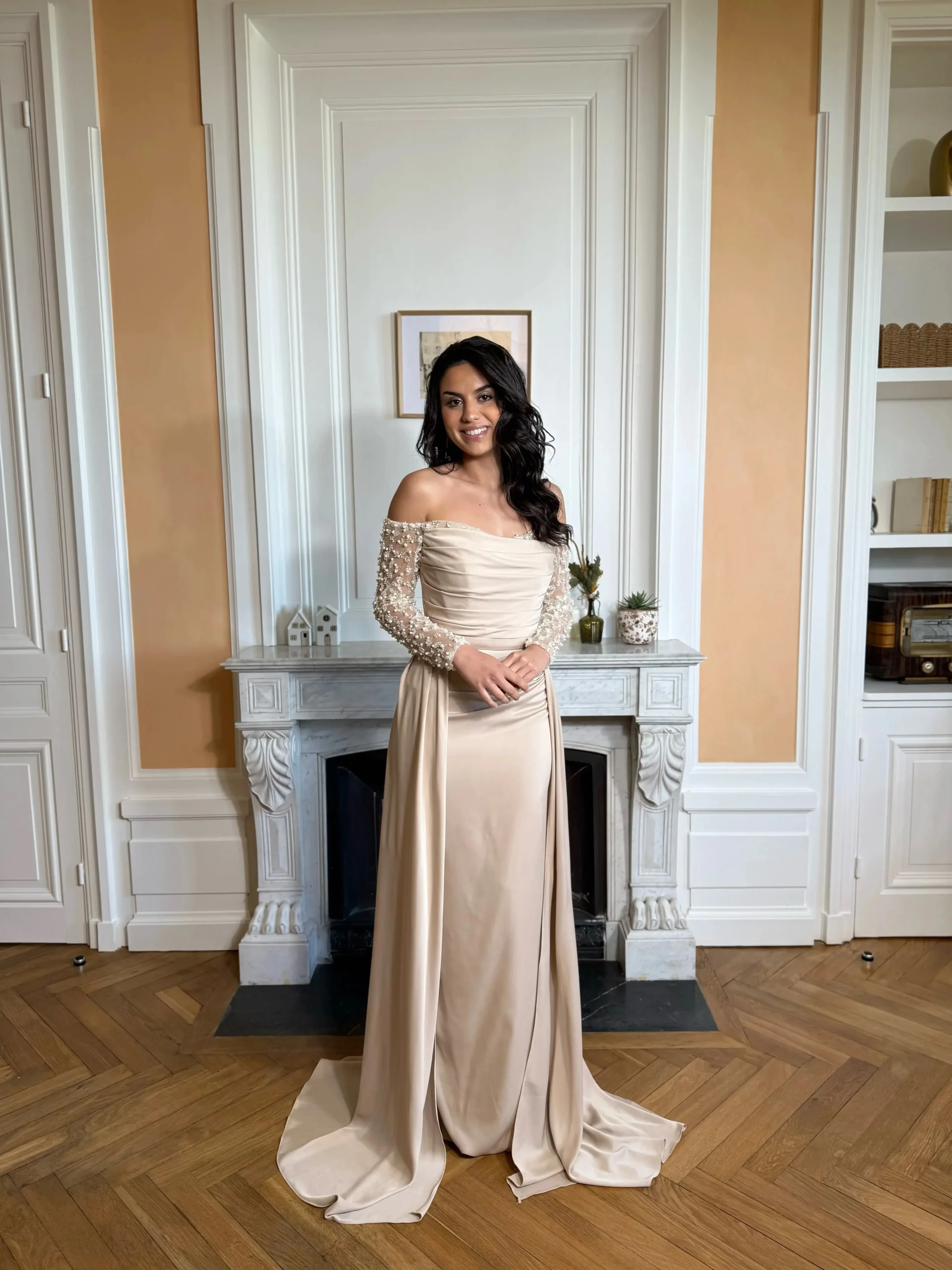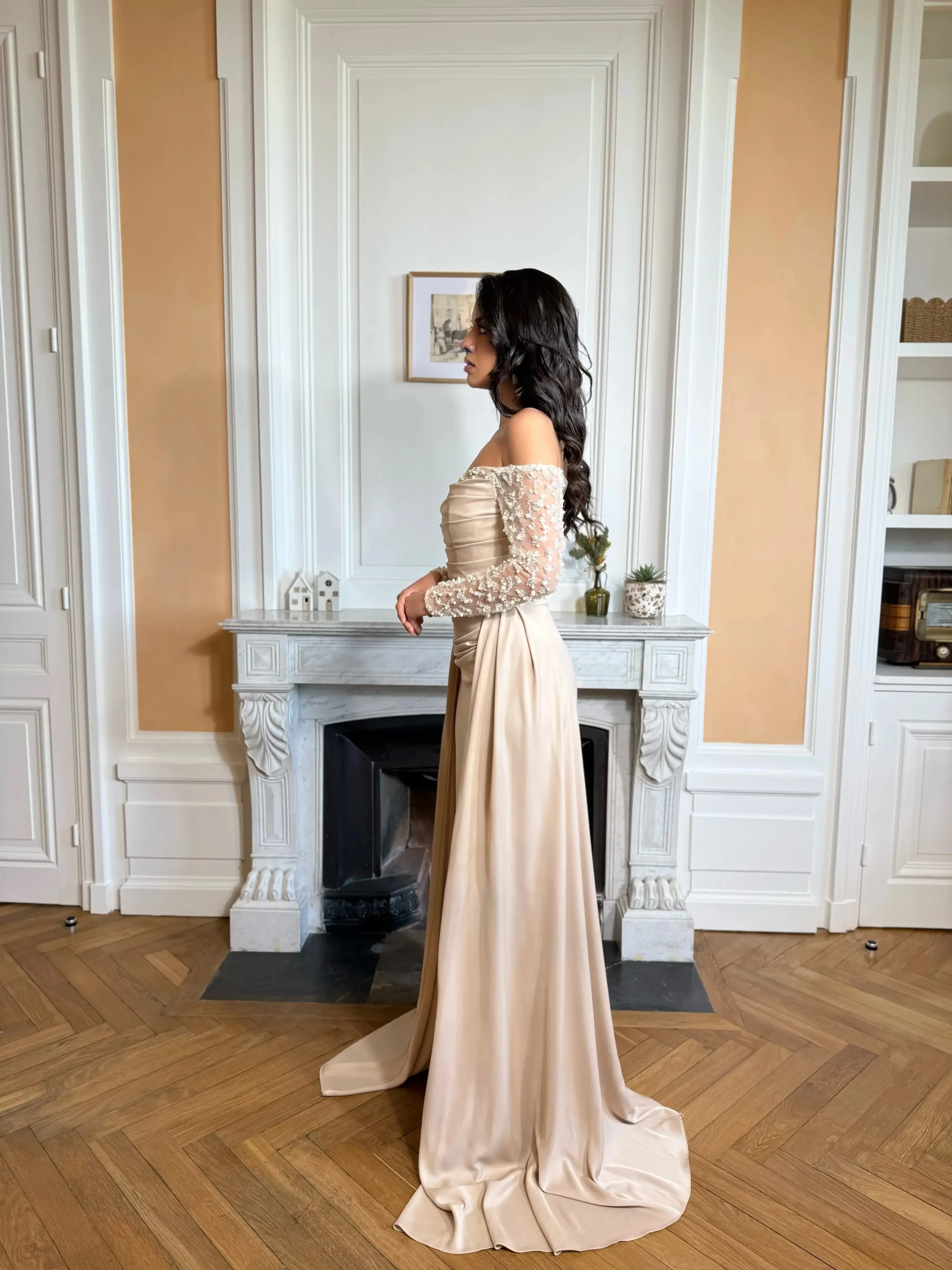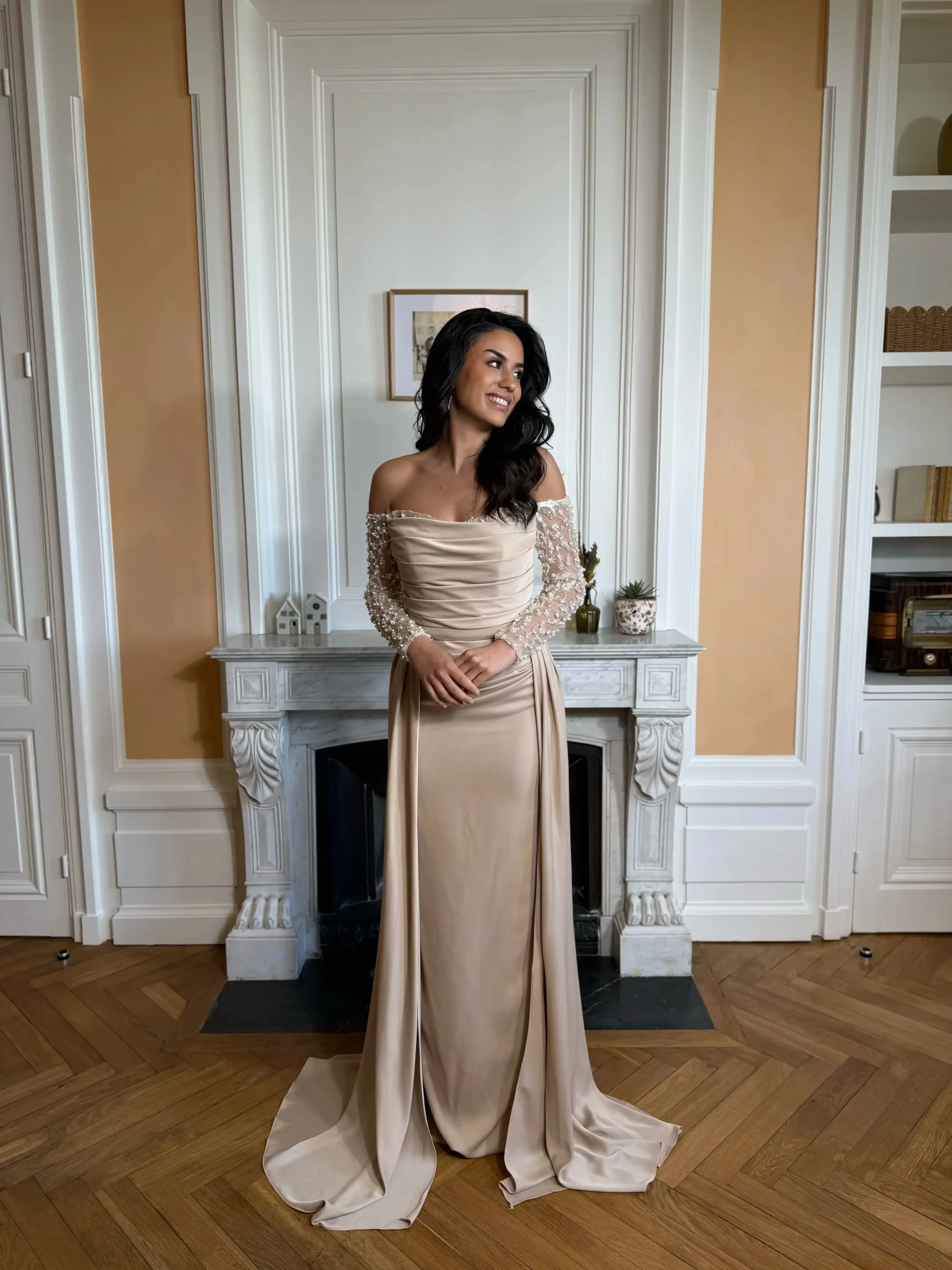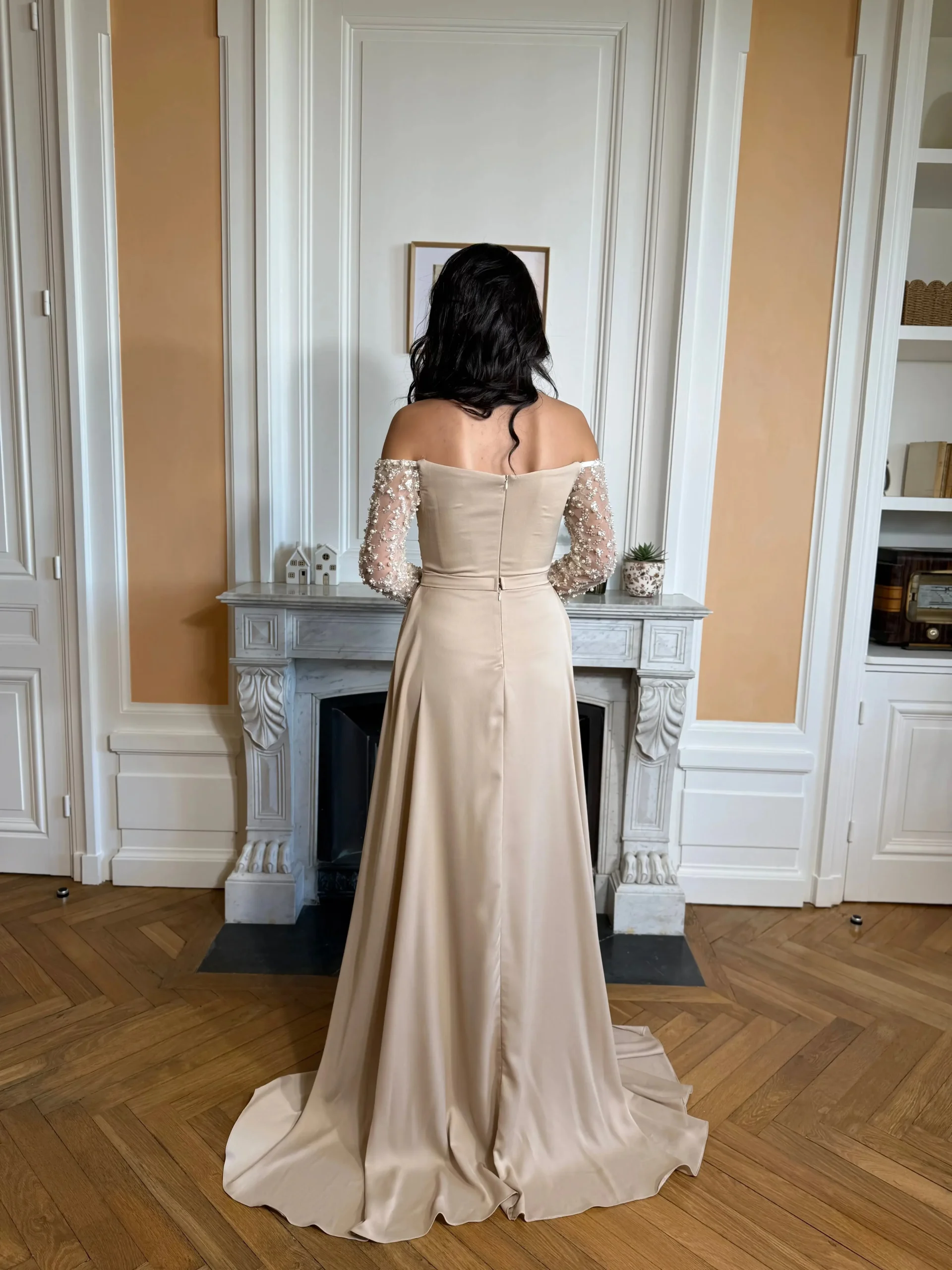 Longue robe couleur beige, sans fente.