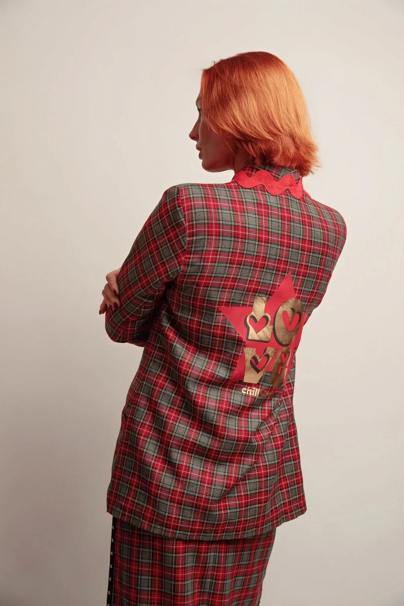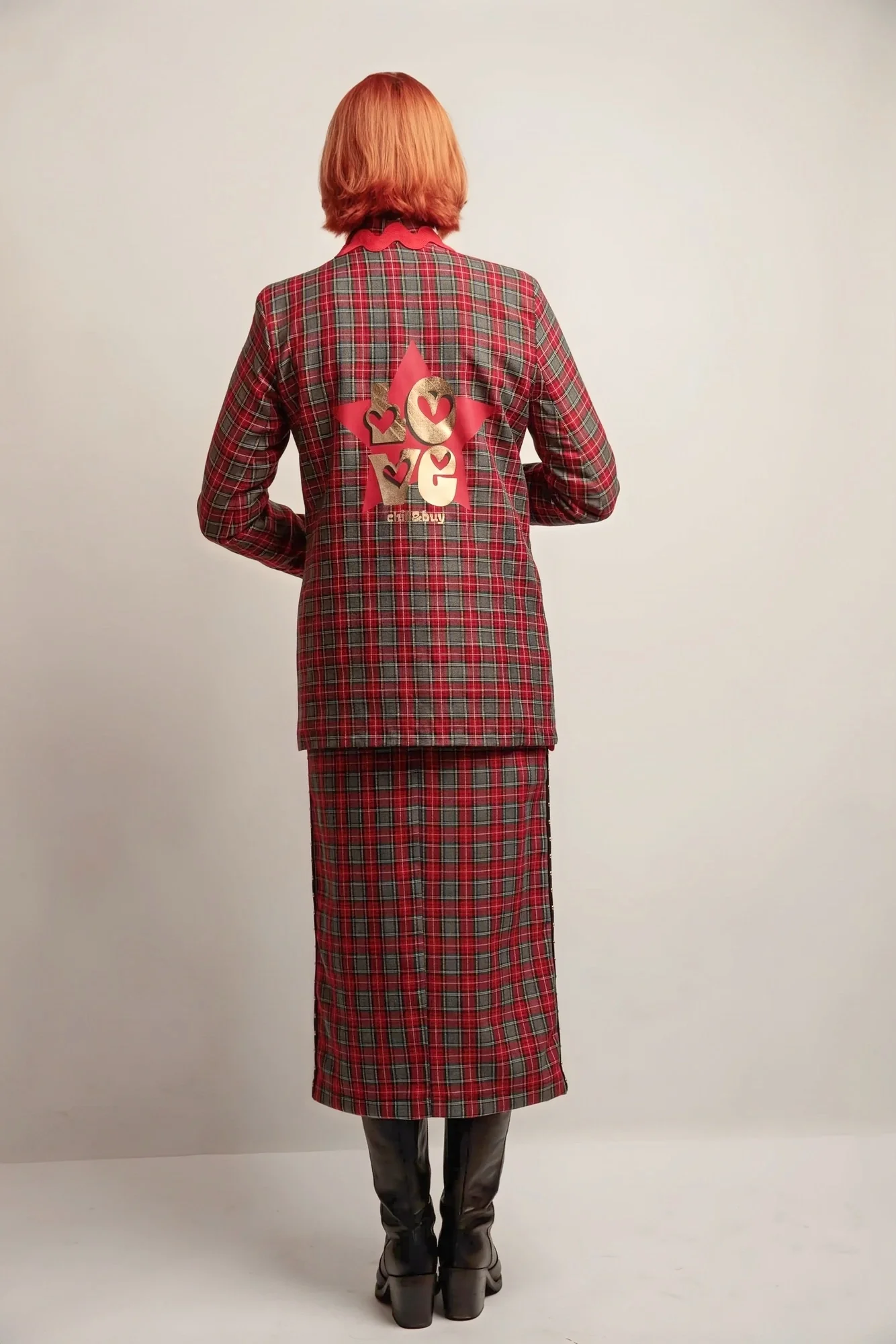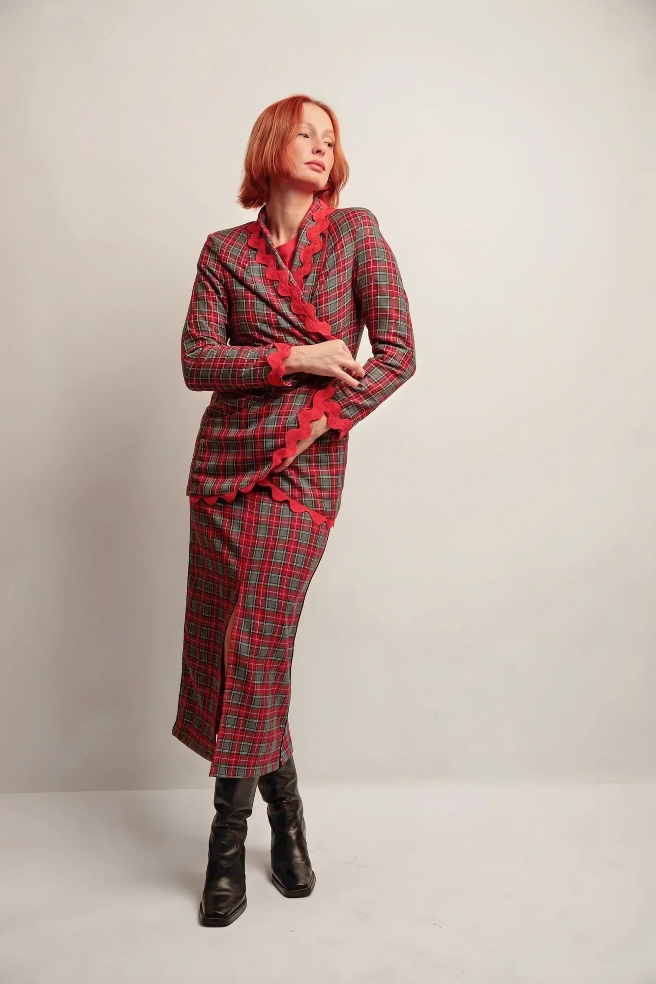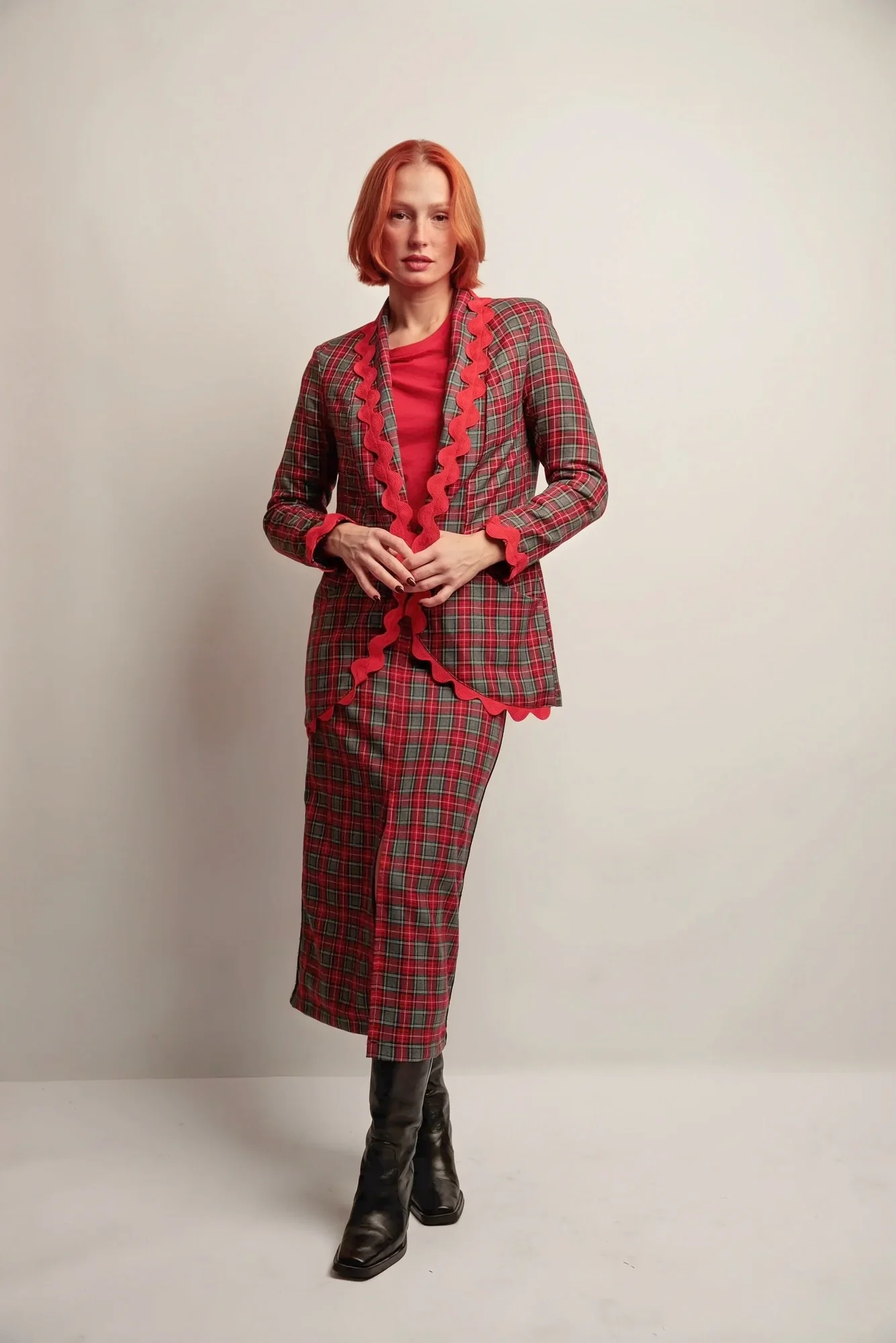 🔹 Matière principale : Tissu à carreaux dans les tons gris et rouge, au tombé fluide et soigné