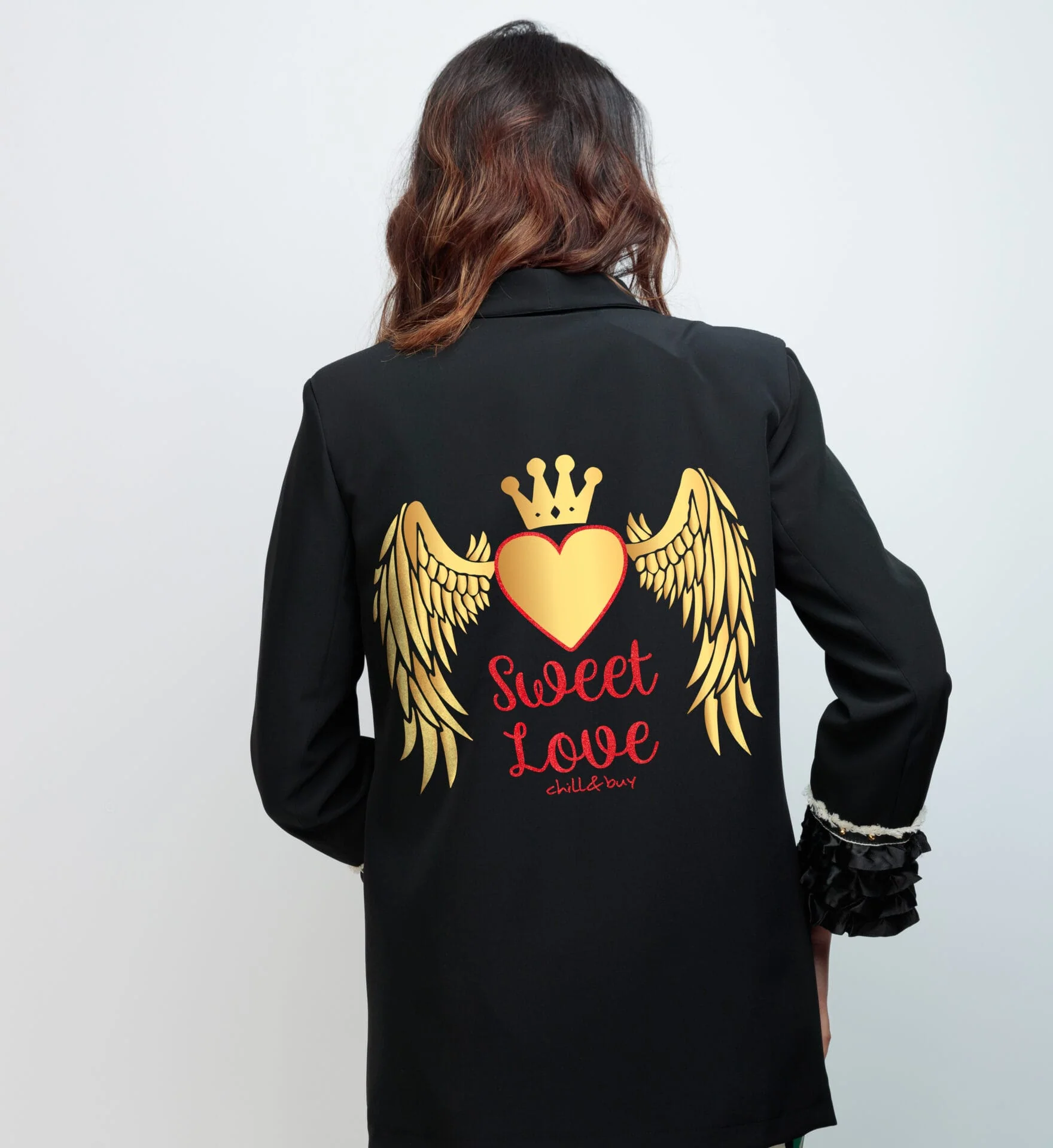 À l’arrière du blazer, un imprimé captivant représente un cœur ailé accompagné de l’inscription « SWEET LOVE ». Les couleurs vibrantes, avec une typographie dorée et des accents rouges, apportent une dose de personnalité et d’originalité qui ne passe pas inaperçue.