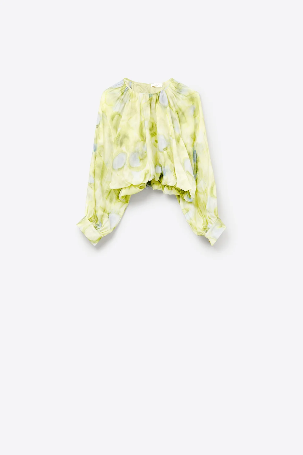 Blouse en mousseline de soie texturée rose à manches tombantes