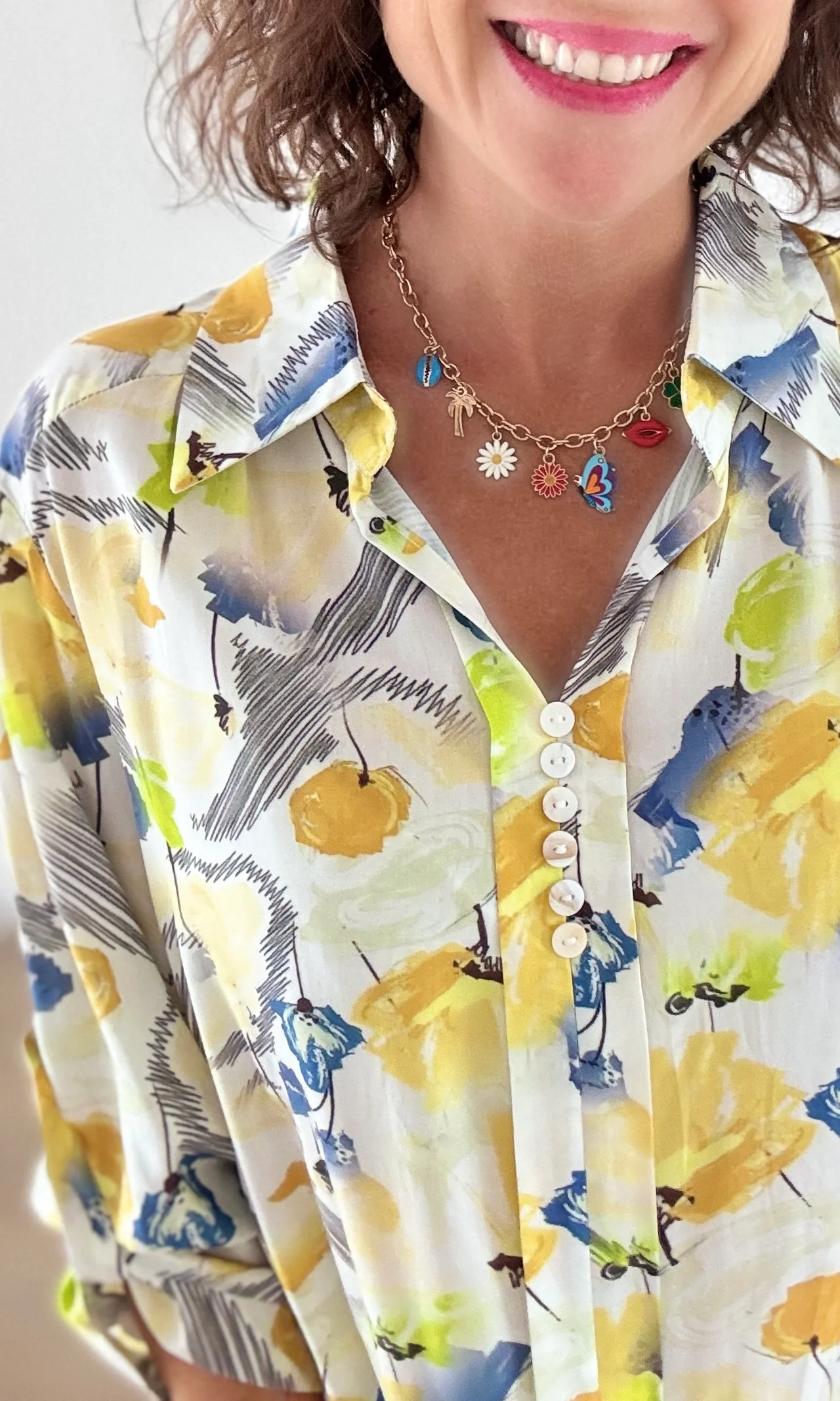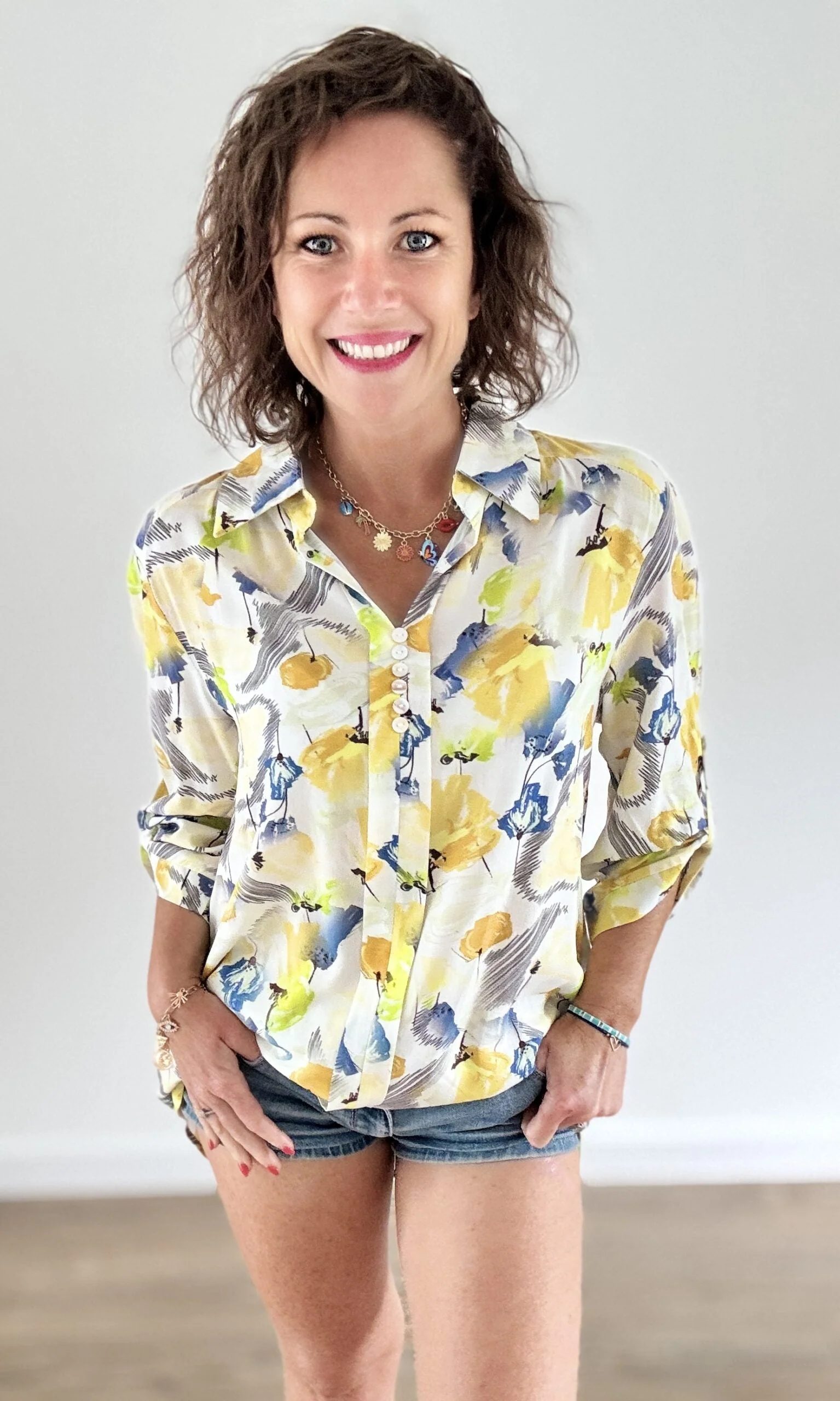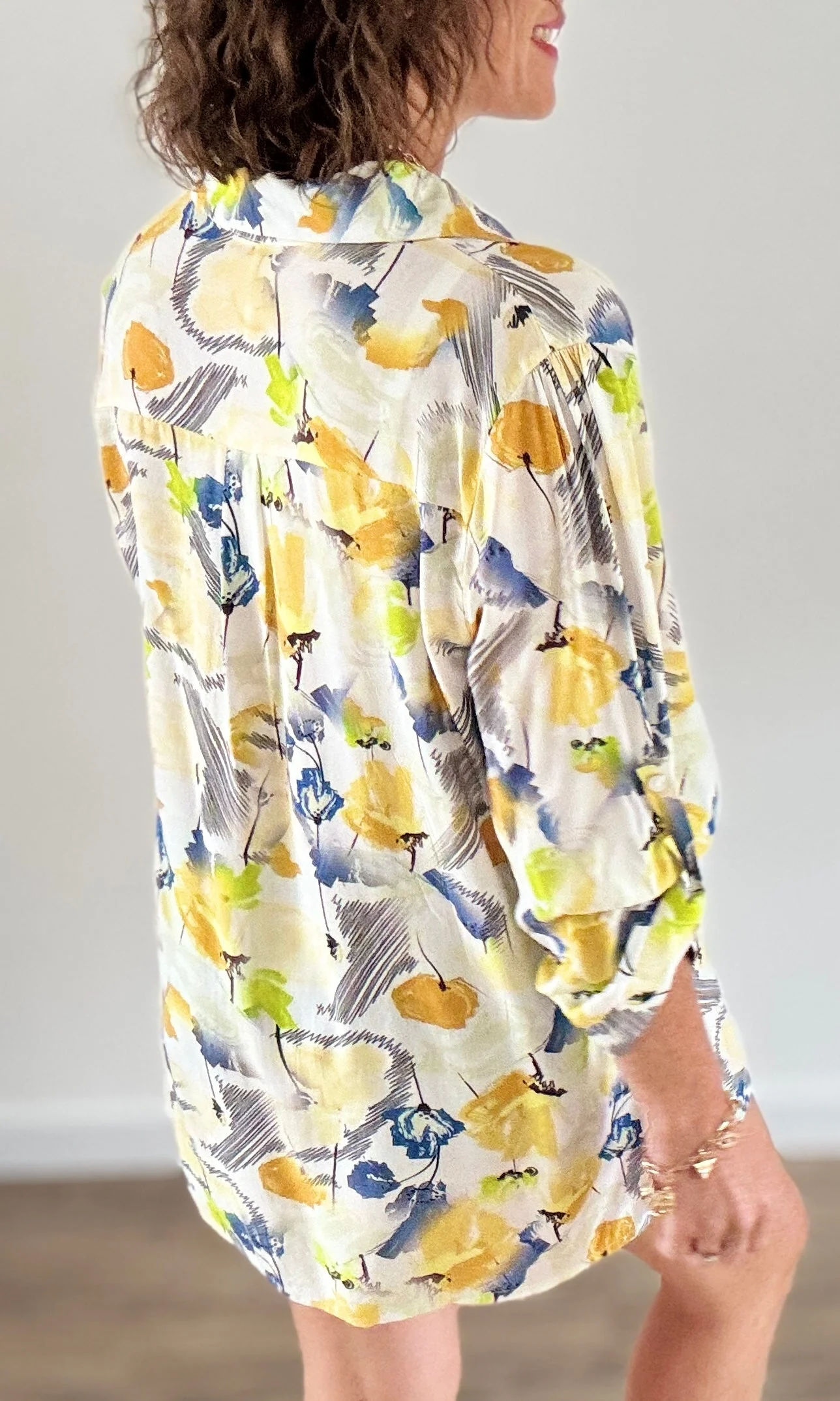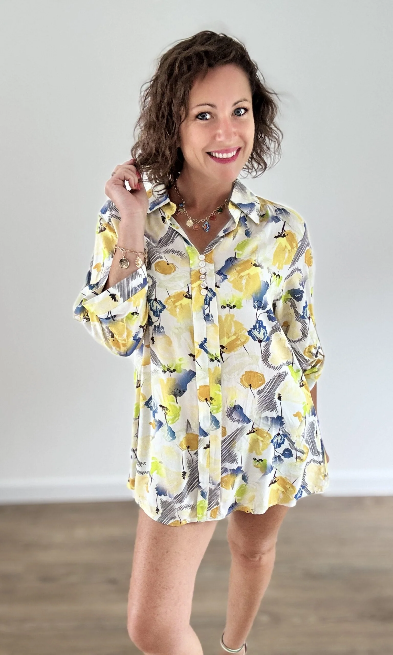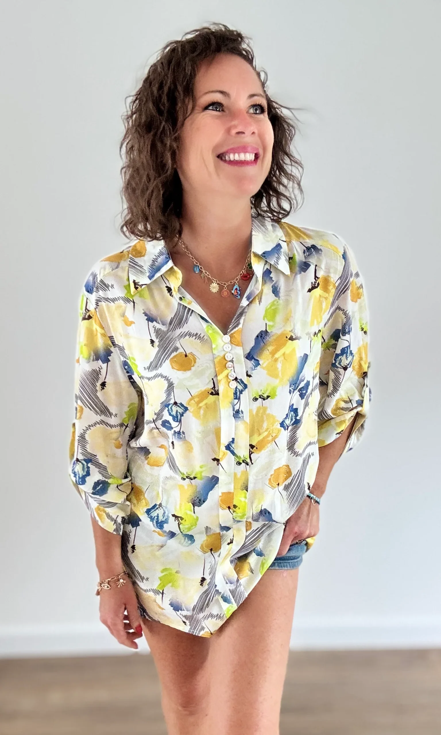 Cette blouse imprimée florale jaune illumine vos tenues avec ses teintes chaudes et printanières. Sa coupe ample et fluide, son col V délicat et ses manches 3/4 avec fermeture boutonnée offrent un confort parfait, alliant féminité et décontraction.