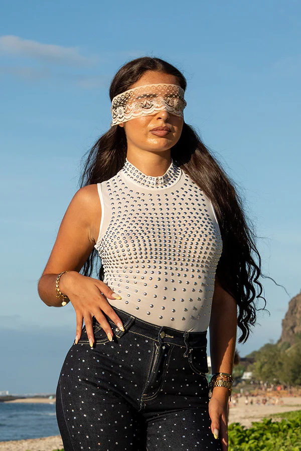 Élégant et audacieux, le Body Crystal Wave est une pièce phare de la collection Savage Coast. Son tissu clair sublimé par une pluie de strass capte la lumière comme les reflets du soleil sur l’océan, offrant une allure à la fois sophistiquée et sensuelle.