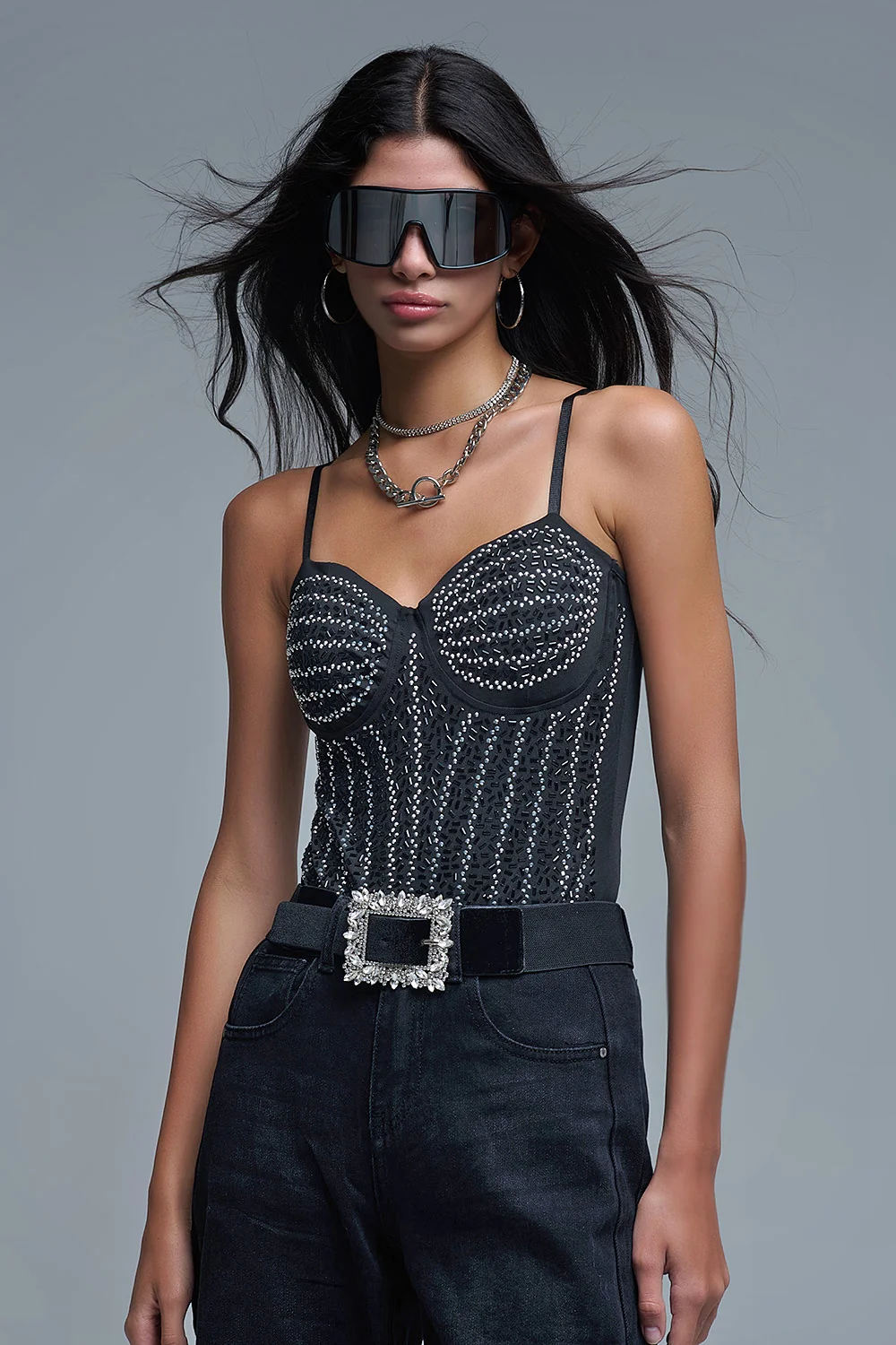 SousCategorie: Body. collier: Encolure cœur. Manches: Style sans manches. Coupent: Coupe moulante. Style: Style de fête. détail: Ornements. Tissu: Tulle élastique. runs true to size. S. 95% Polyester 5% Elasthanne