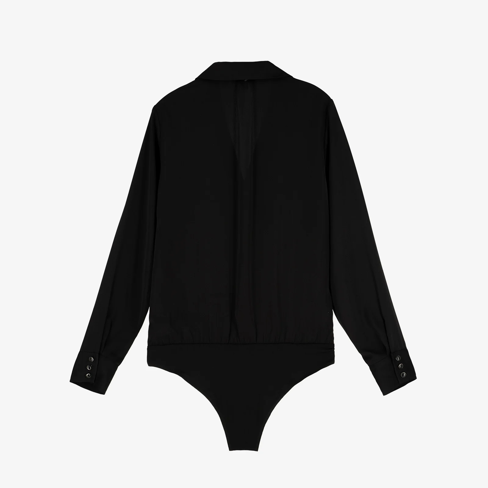 Avec sa matière légèrement satinée et son col tailleur, le body Maxime s’affirme comme un luxe discret et une élégance raffinée