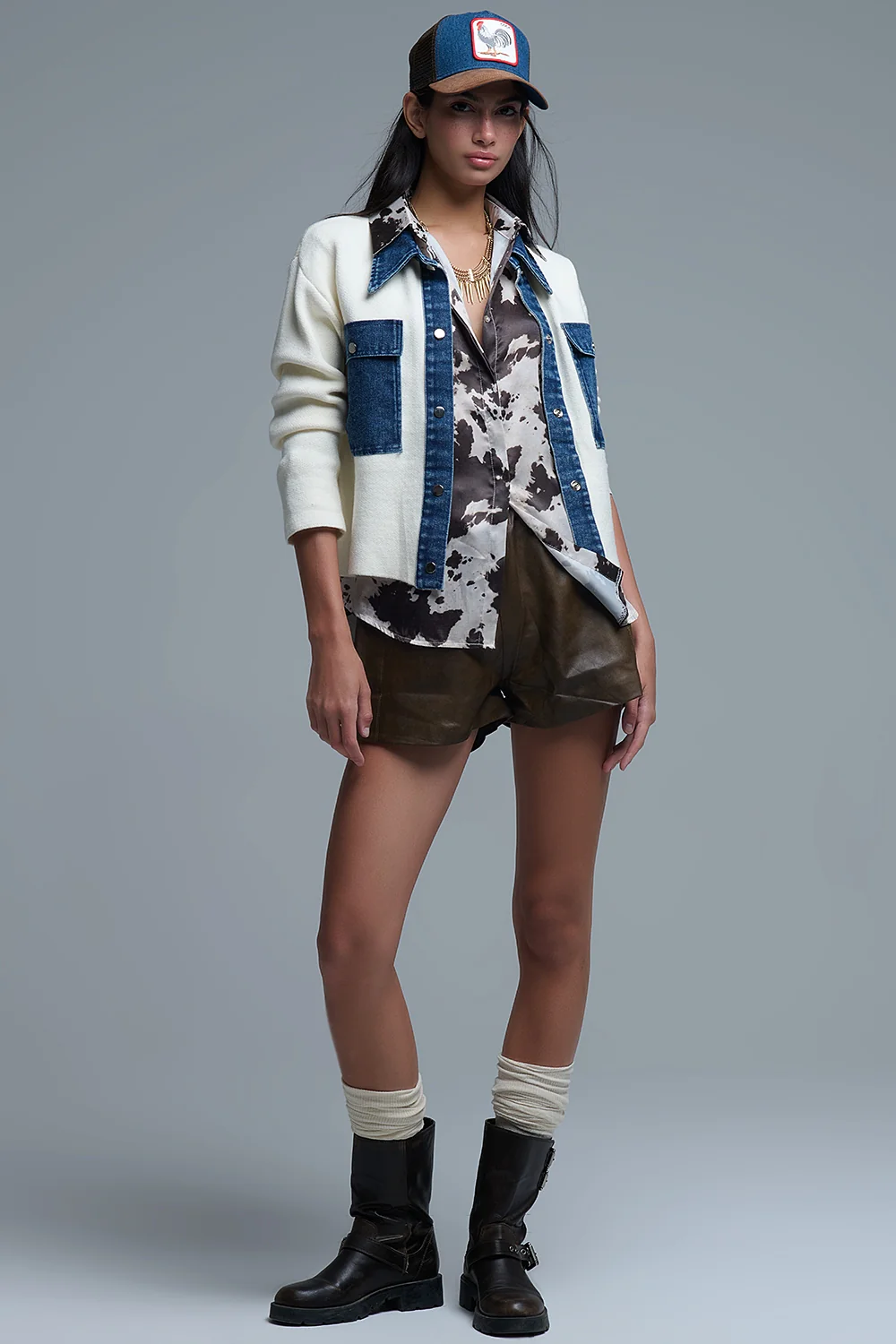 Cardigan en maille crème avec détails en denim bleu