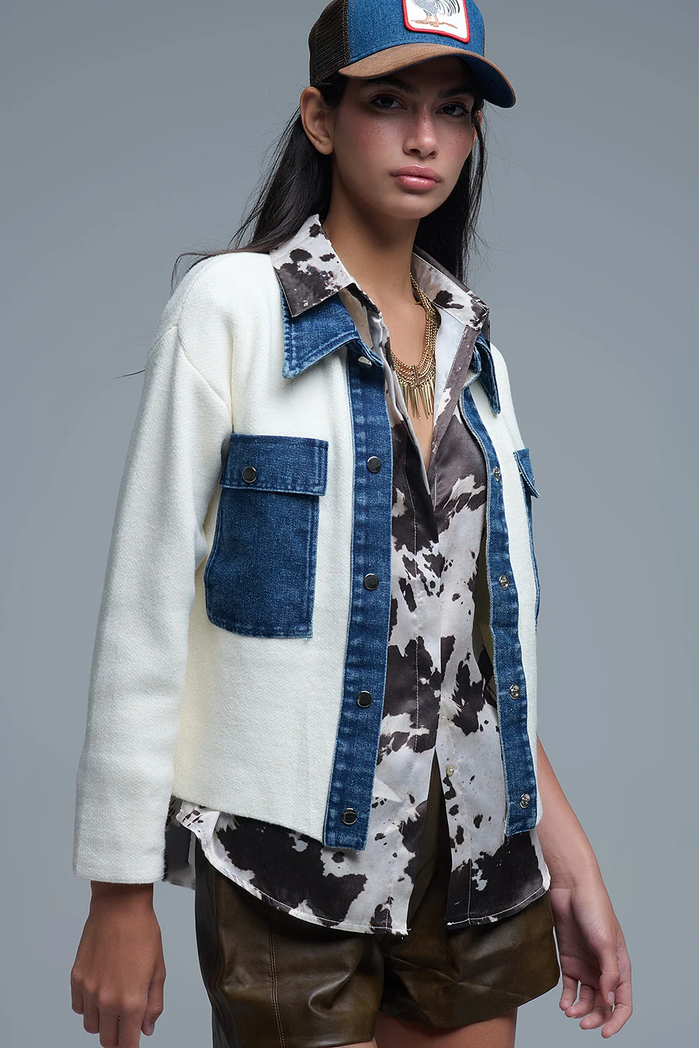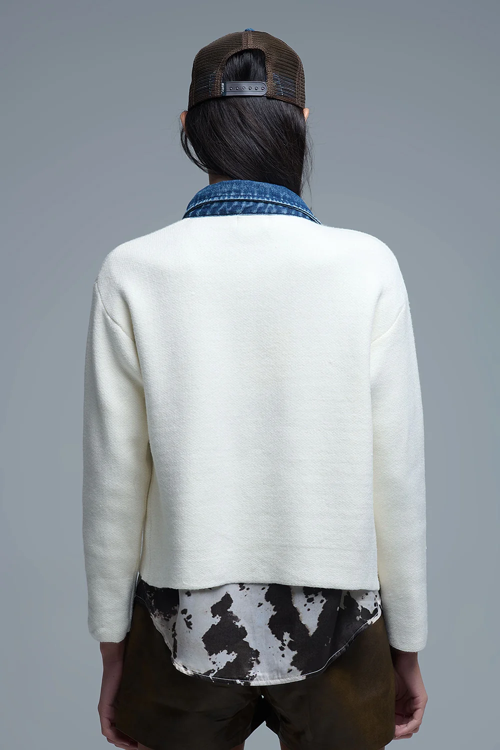 Cardigan en tricot gaufré blanc avec intérieur en denim épais bleu
