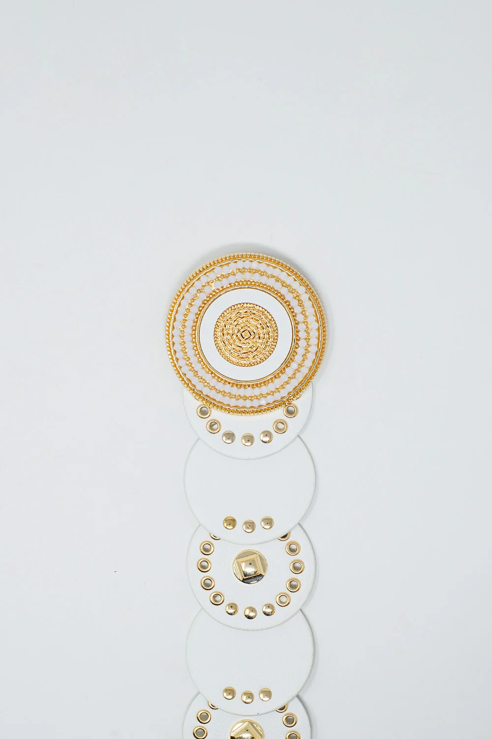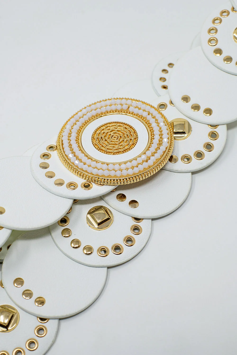 Ceinture en cuir blanc avec boucle ronde en strass blanc et détails dorés