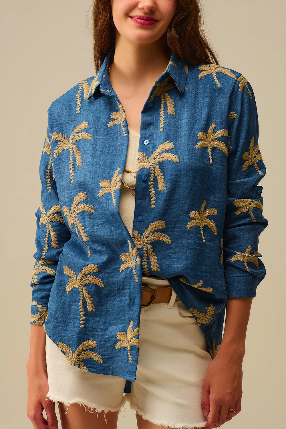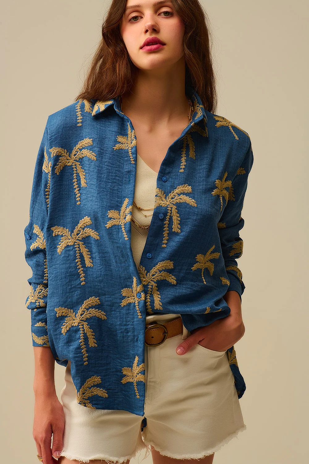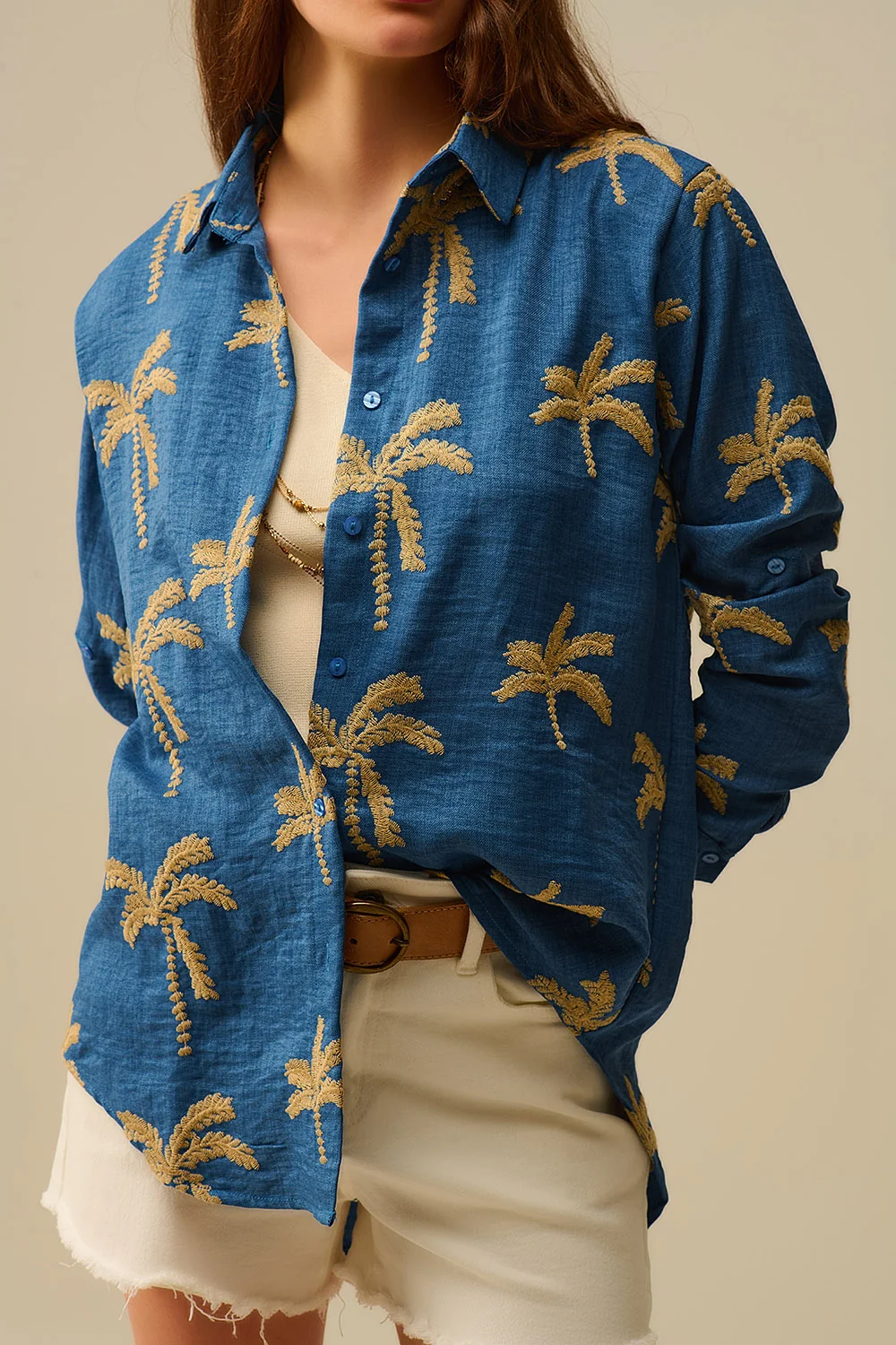Chemise bleue broderie palmier beige femme – style décontracté et raffiné