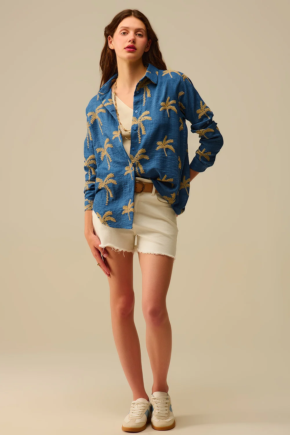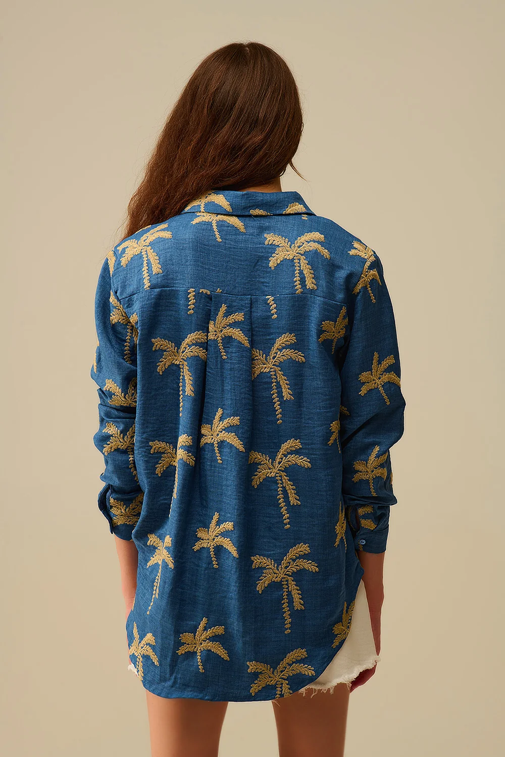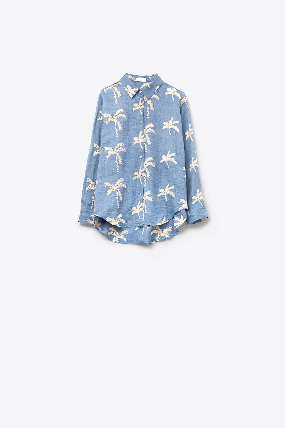 Chemise bleue broderie palmier beige femme – style décontracté et raffiné