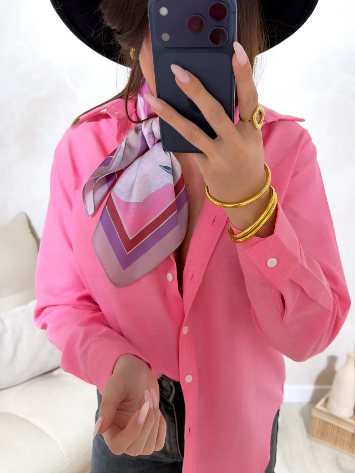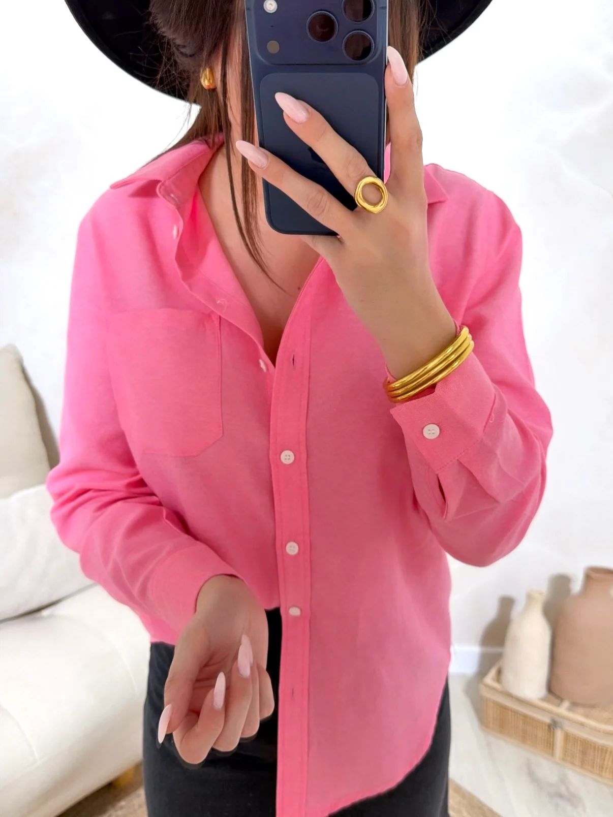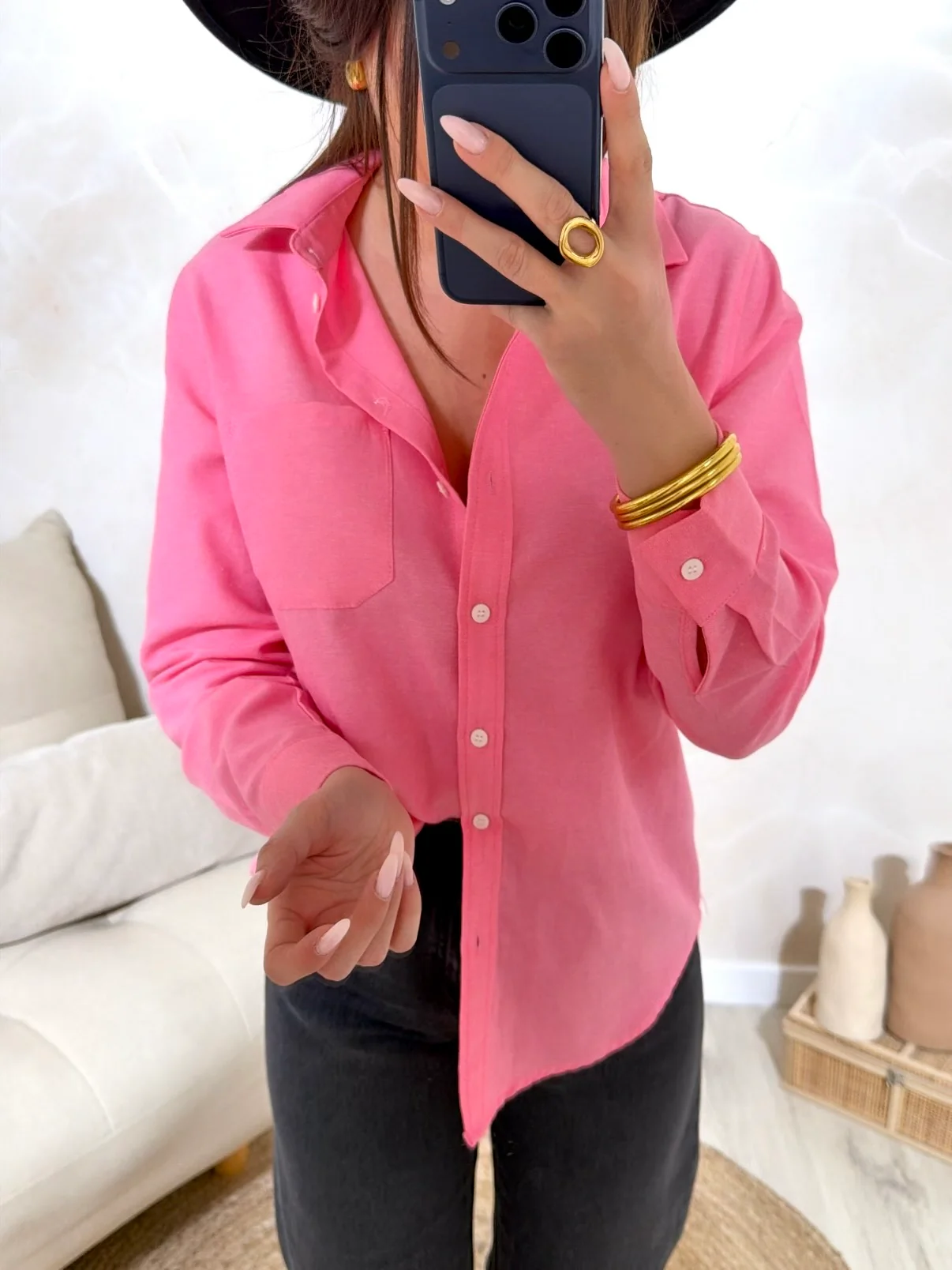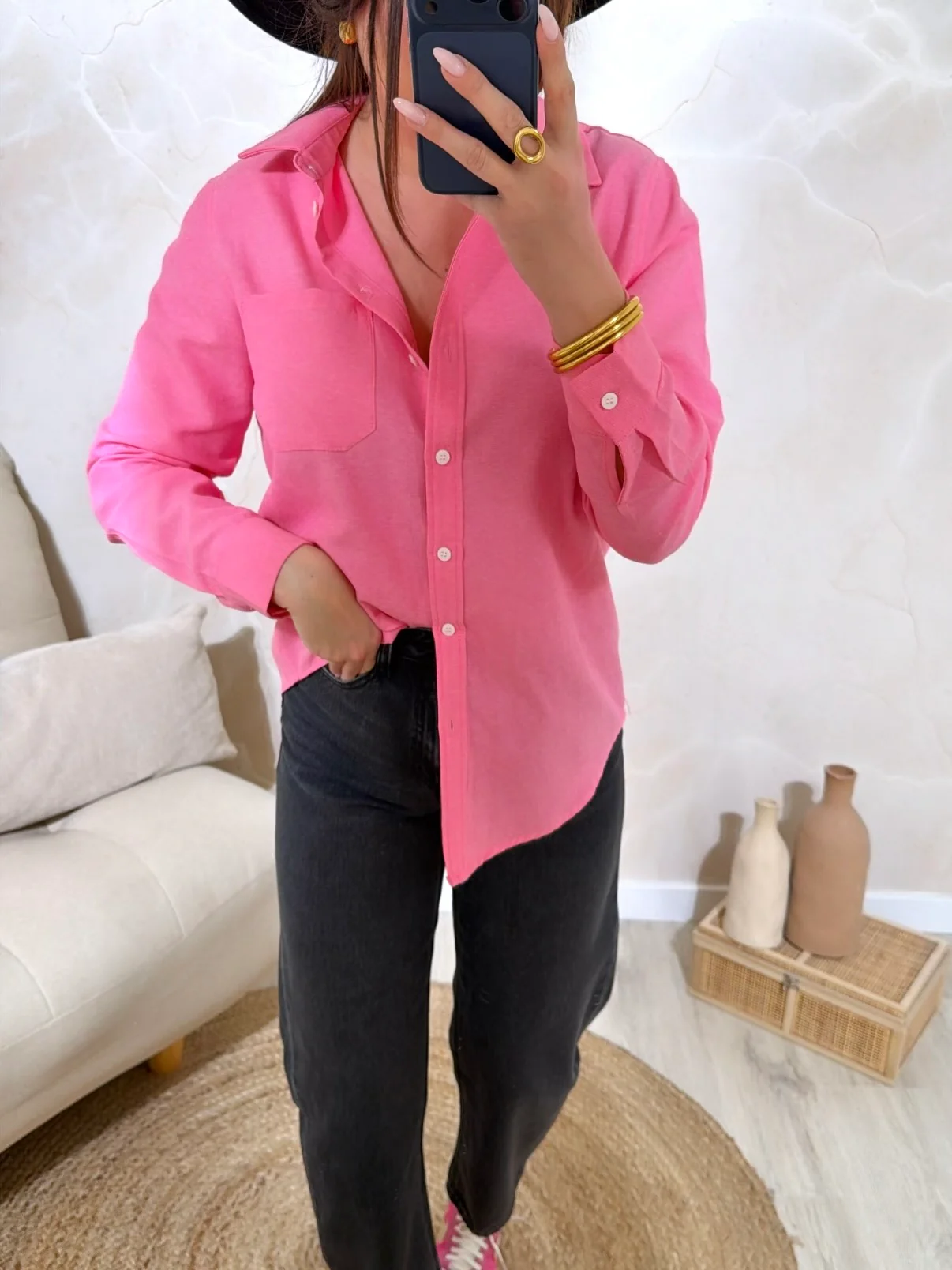 Chemise Bonbon • Fermeture avec boutons • Boutons au niveau des manches • Pauline mesure 1m65 et porte une taille S • Composition : 50% Coton, 50% Polyester • Mode d’expédition : Colissimo avec ou sans signature. • Livraison offerte à partir de 69€ d’achat