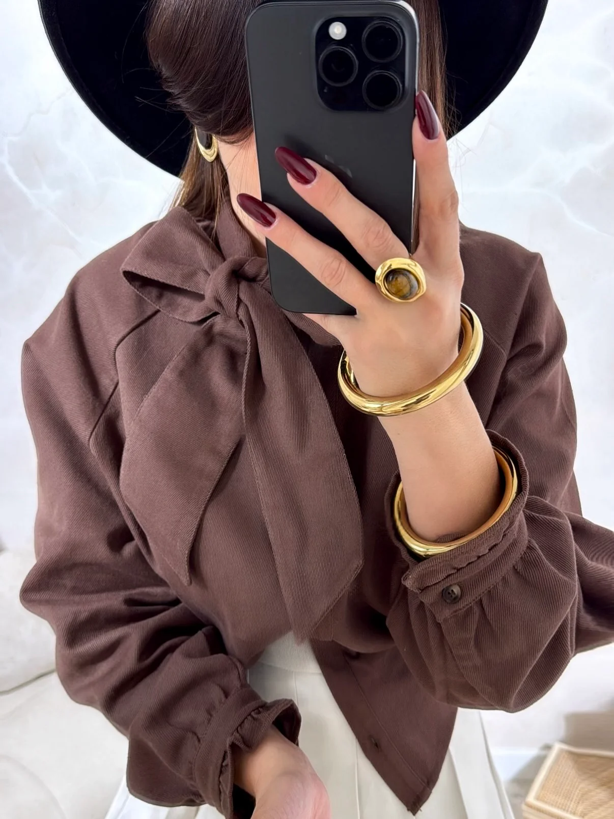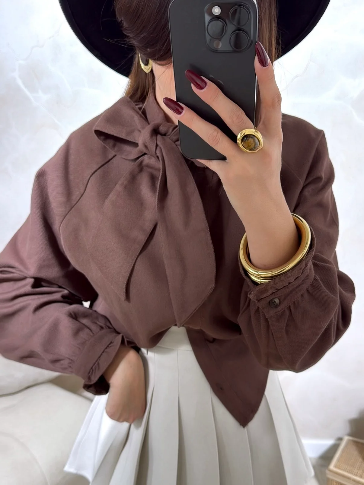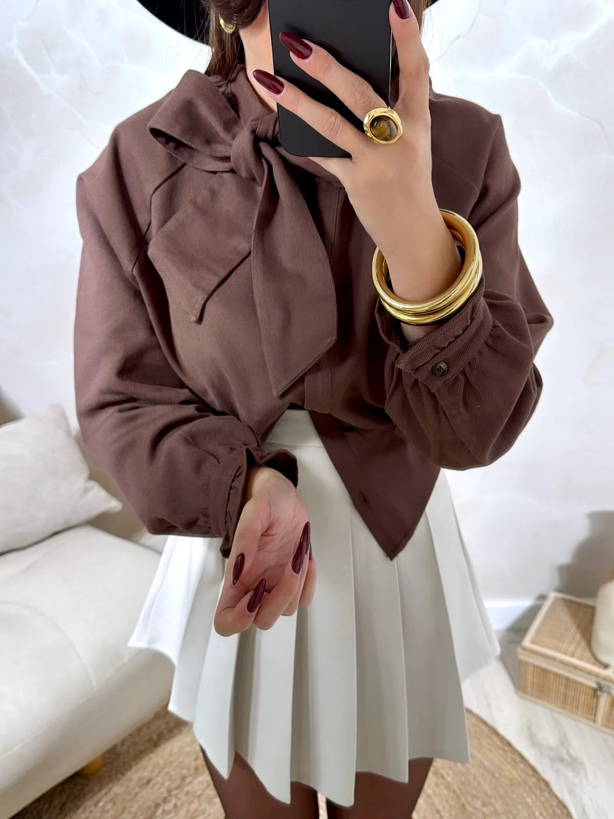 Chemise Cacahuète • fermeture avec boutons • Col à nouer • Pauline mesure 1m65 et porte une taille S-M • S-M: Largeur 58cm – Longueur 54cm• M-L : Largeur 61cm – Longueur 55cm • Composition : 100% Coton • Mode d’expédition : Colissimo avec ou sans signature. • Livraison offerte à partir de 69€ d’achat