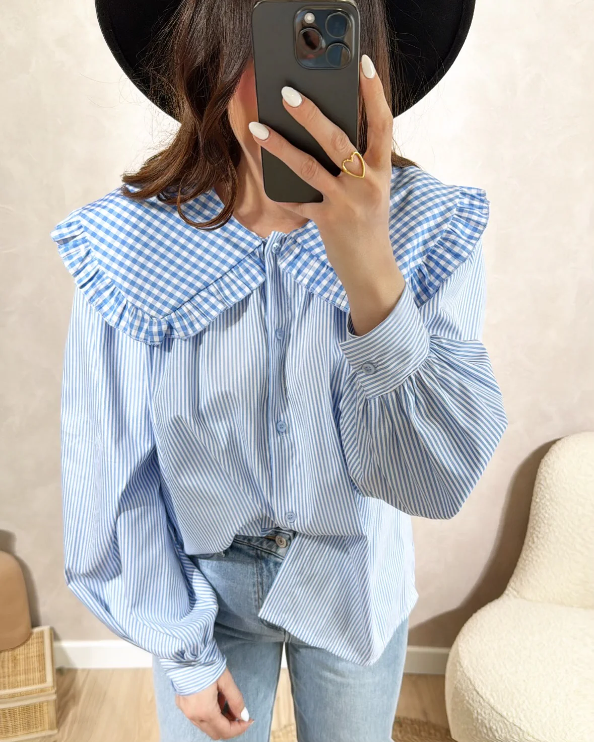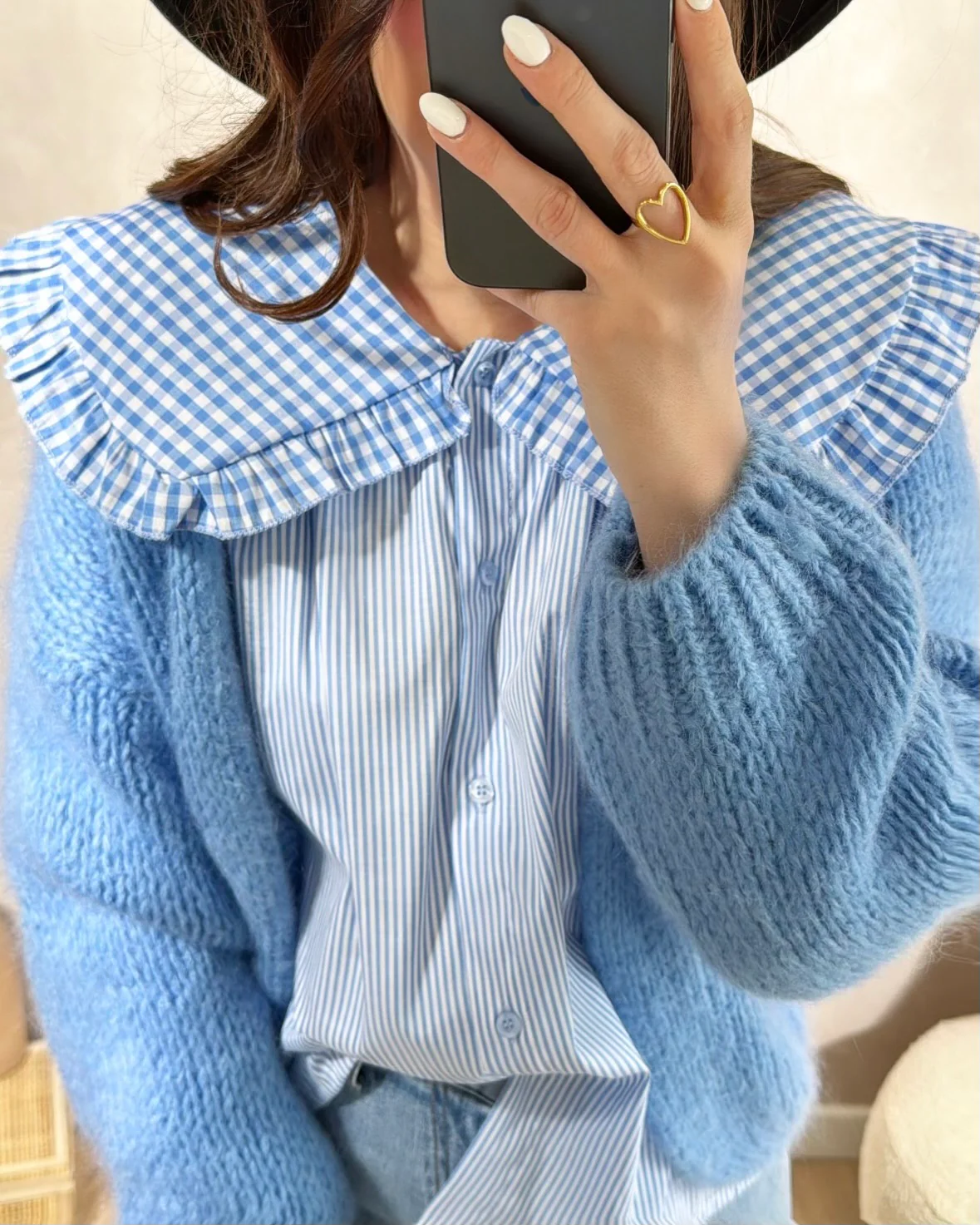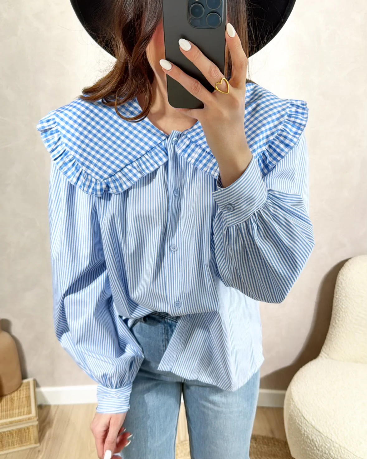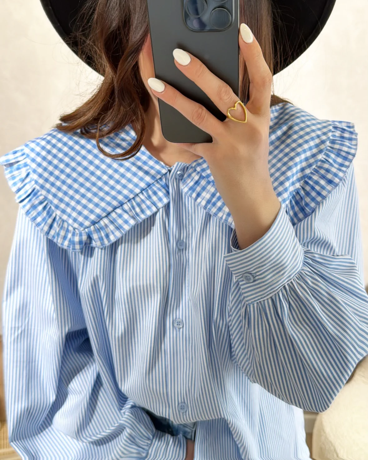 Chemise Donna • Fermeture avec boutons • Col claudine motif vichy • Manches longues / fermeture avec boutons • Le modèle mesure 1m65 et porte une taille unique • TU : Longueur 62cm – Largeur 61cm • Composition : 100% Coton • Mode d’expédition : La poste, colissimo avec ou sans signature • Livraison offerte […]