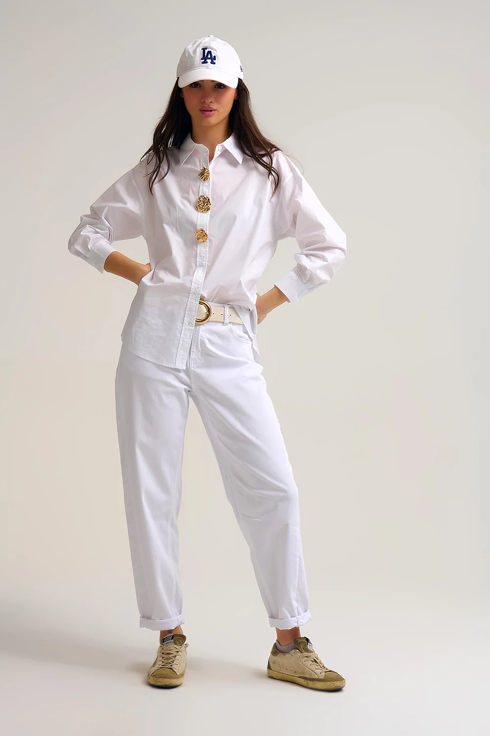 Chemise en coton popeline décontractée blanche avec boutons décoratifs dorés