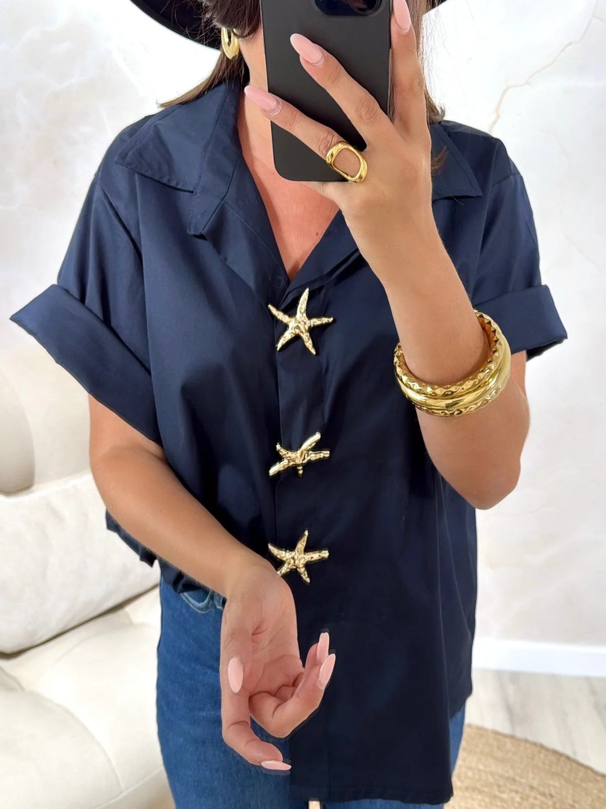 Chemise Etoilia • Fermeture avec boutons • Manches courtes avec revers • Etoiles dorées • Pauline mesure 1m65 et porte une taille unique • Largeur 65cm – Longueur 63cm • Composition : 100% Coton • Mode d’expédition : Colissimo avec ou sans signature. • Livraison offerte à partir de 69€ d’achat