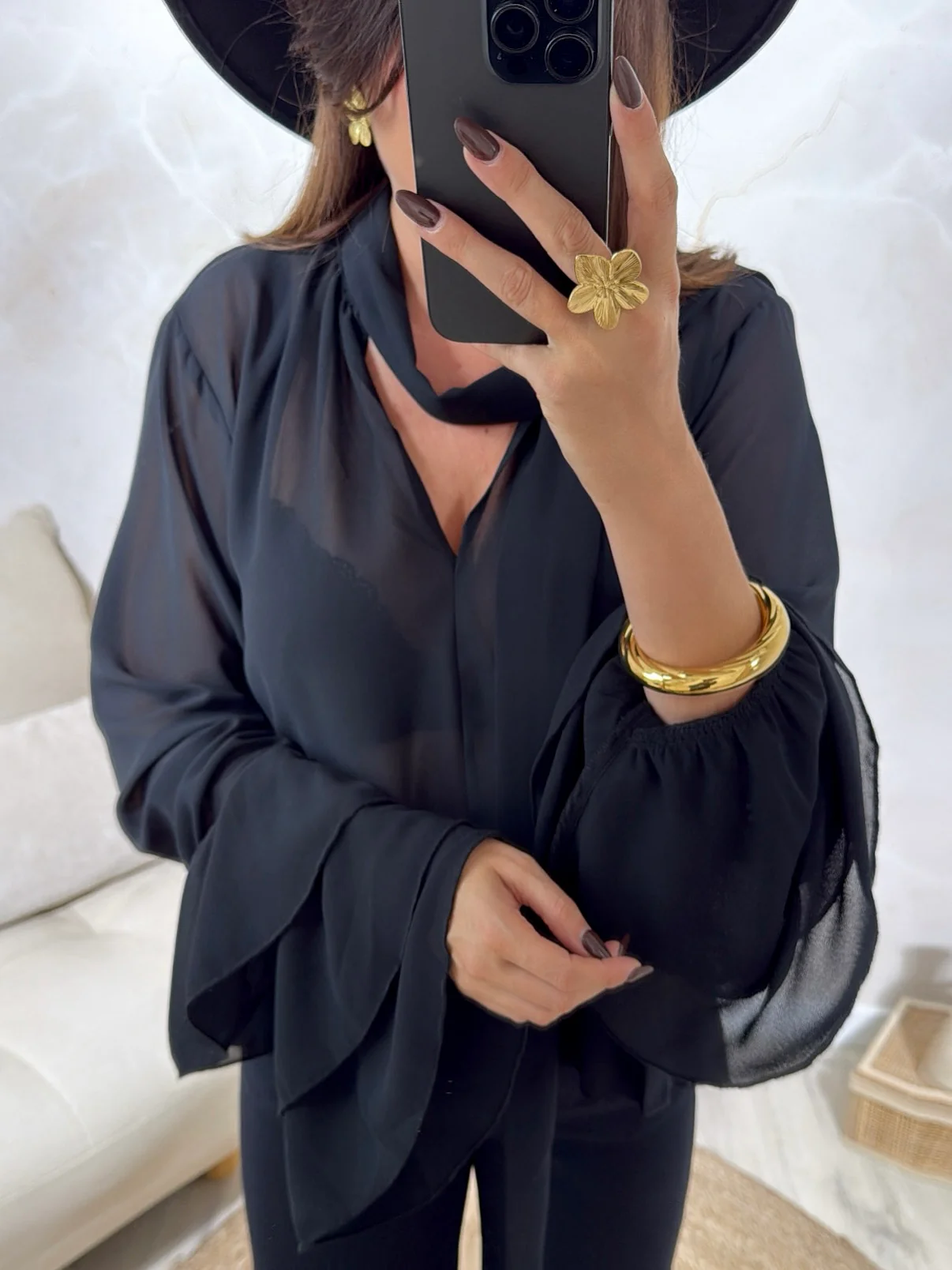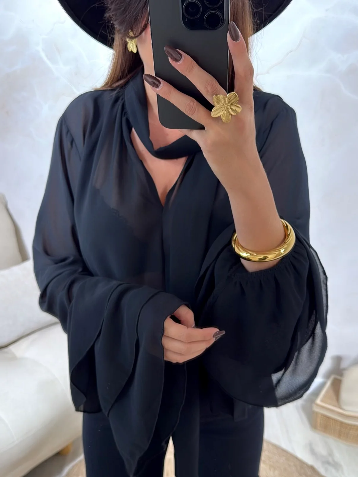 Blouse Opéra • Matière fluide • Manches évasées • Col à nouer • Le modèle mesure 1m65 et porte une taille Taille unique • Composition : 95% Polyester 5% Soie • Mode d’expédition : Colissimo avec ou sans signature. • Livraison offerte à partir de 69€ d’achat
