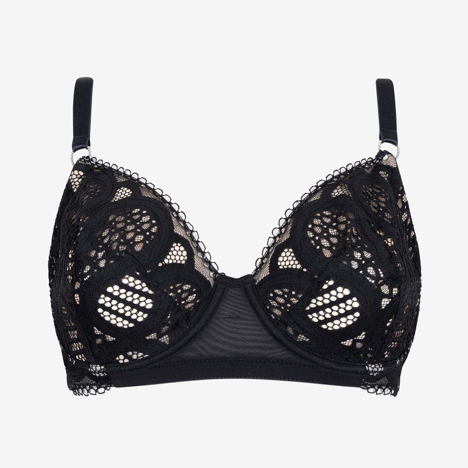 Le graphisme affirmé de la dentelle crée un effet visuel saisissant. Chaque modèle dévoile une dentelle noire au design travaillé, mêlant courbes sinueuses, formes ogivales et fonds alvéolés pour un rendu hypnotique et envoûtant. Le décolleté droit, aérien et léger, ajoute une touche de finesse et souligne l’élégance contemporaine de la ligne. Pièce emblématique de la collection, le body se distingue par sa coupe ultra-sexy, qui sublime les courbes et joue avec les transparences, sans jamais tout dévoiler.