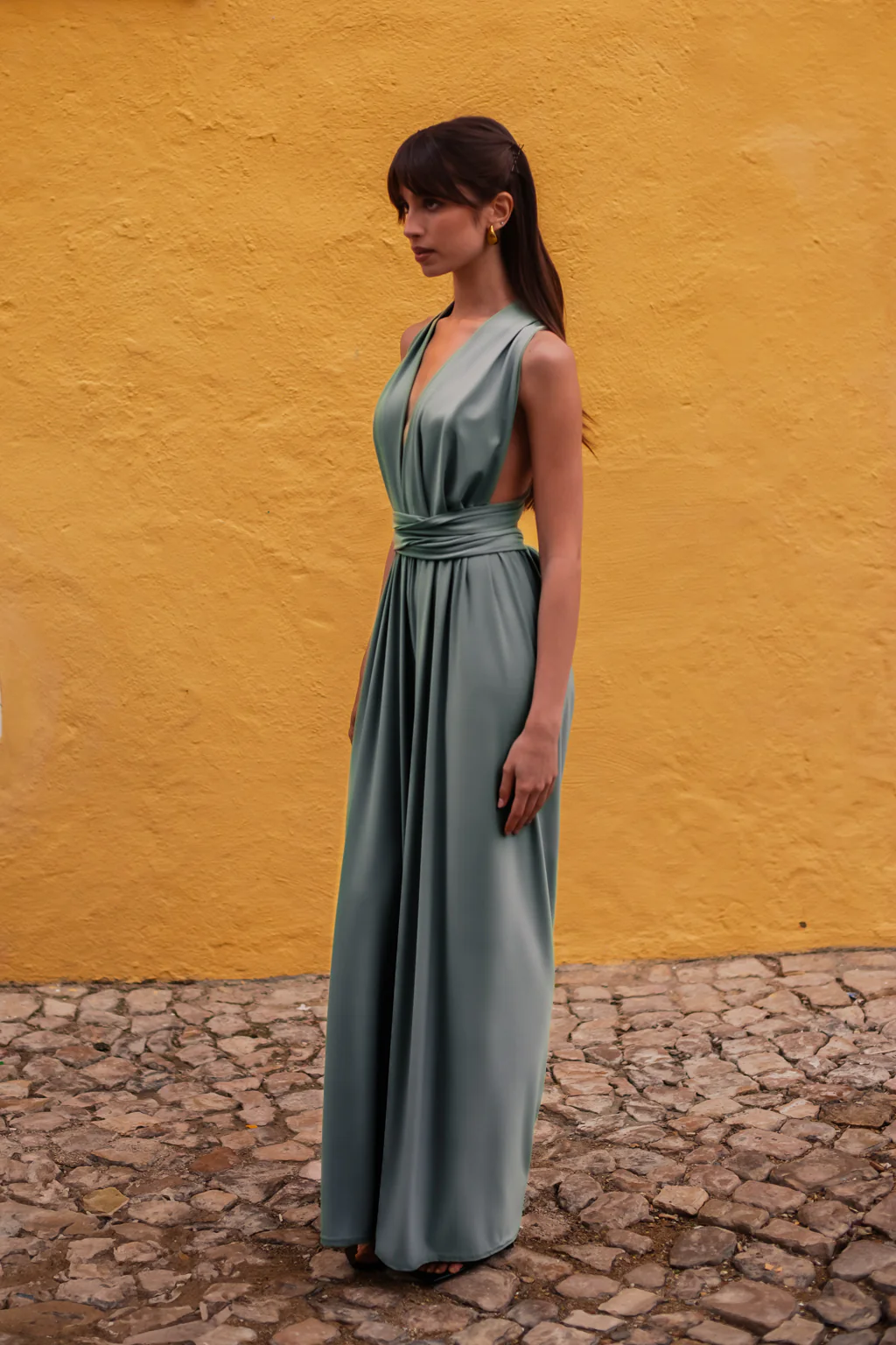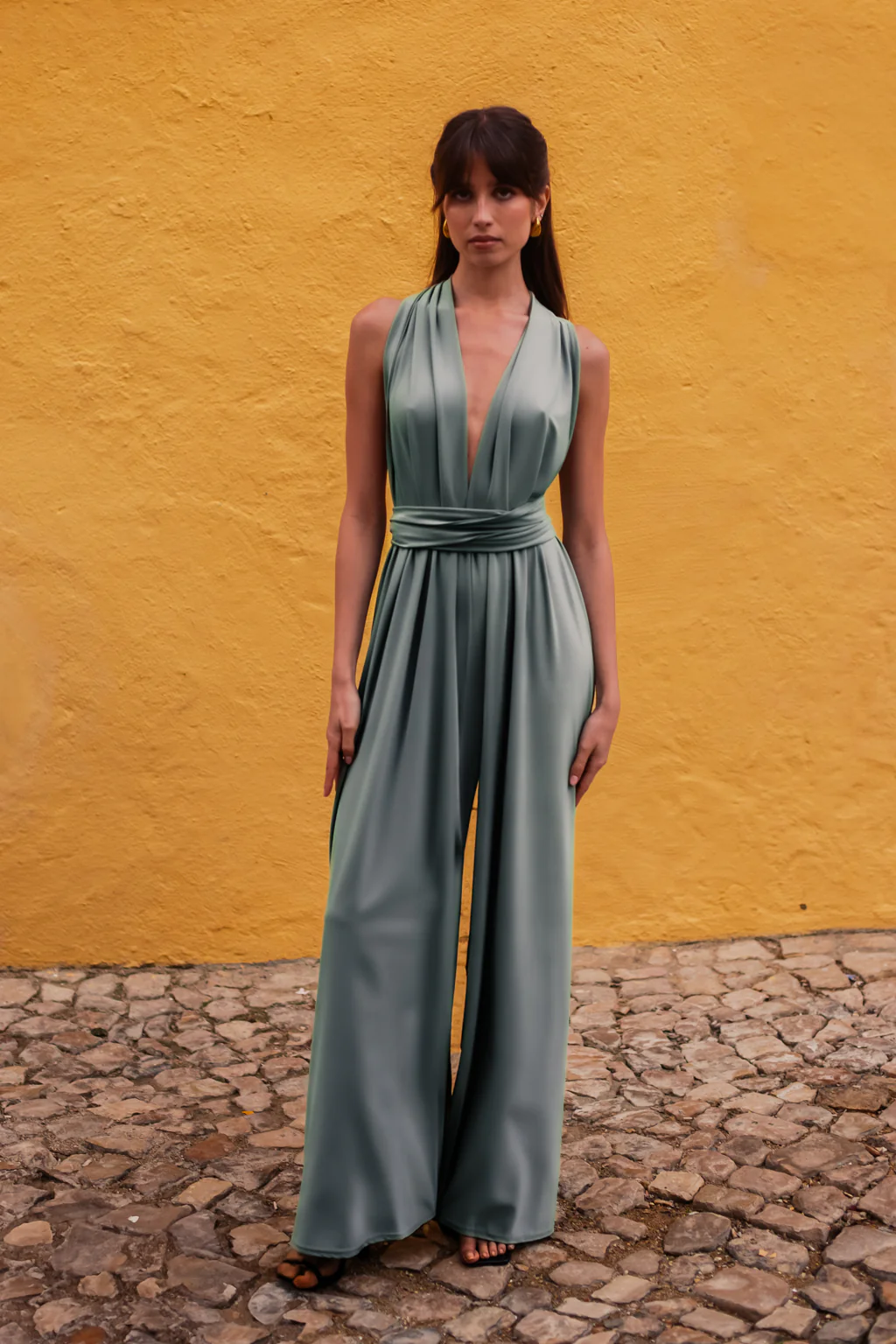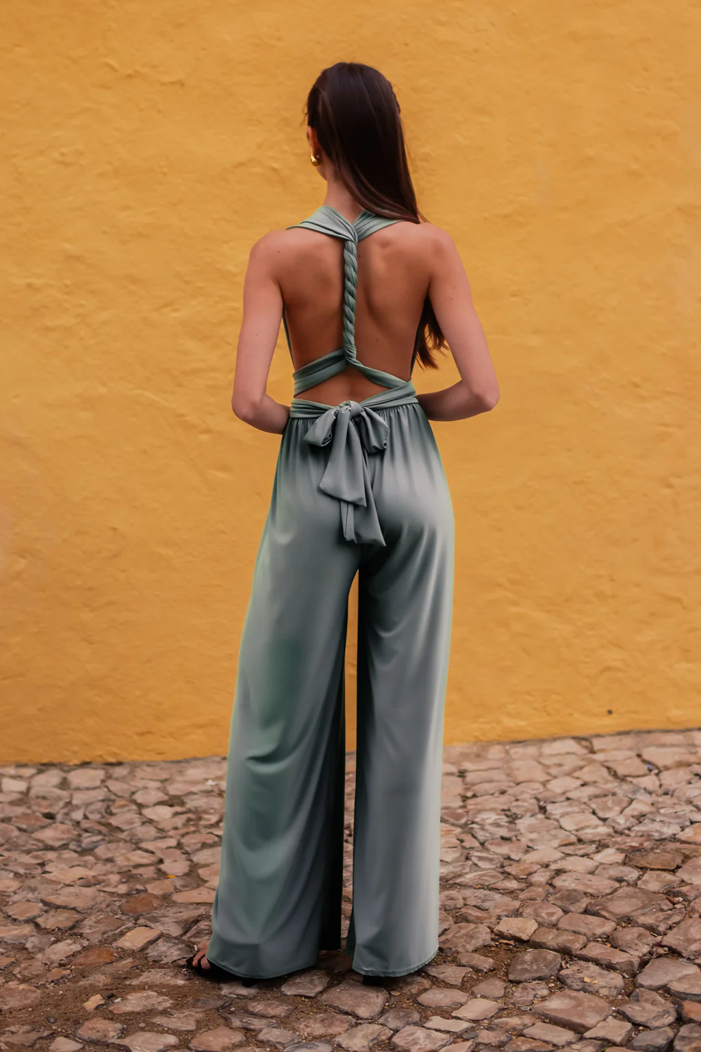 Pardon, mais je ne m’excuse pas de varier les jeux de style. Combinaison multiposition couleur sauge, décolleté modulable, dos nu ou croisé, à nouer selon vos envies.