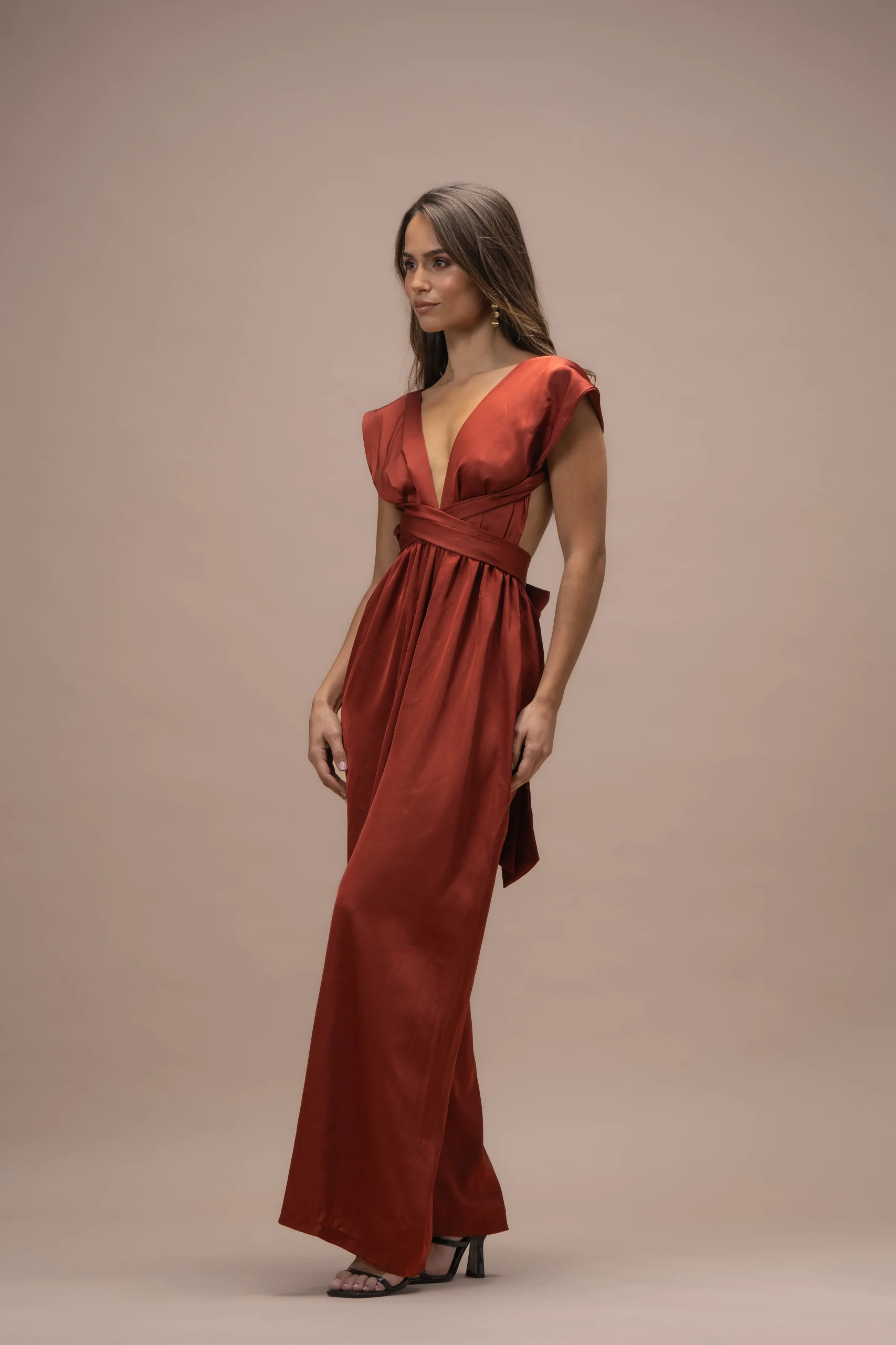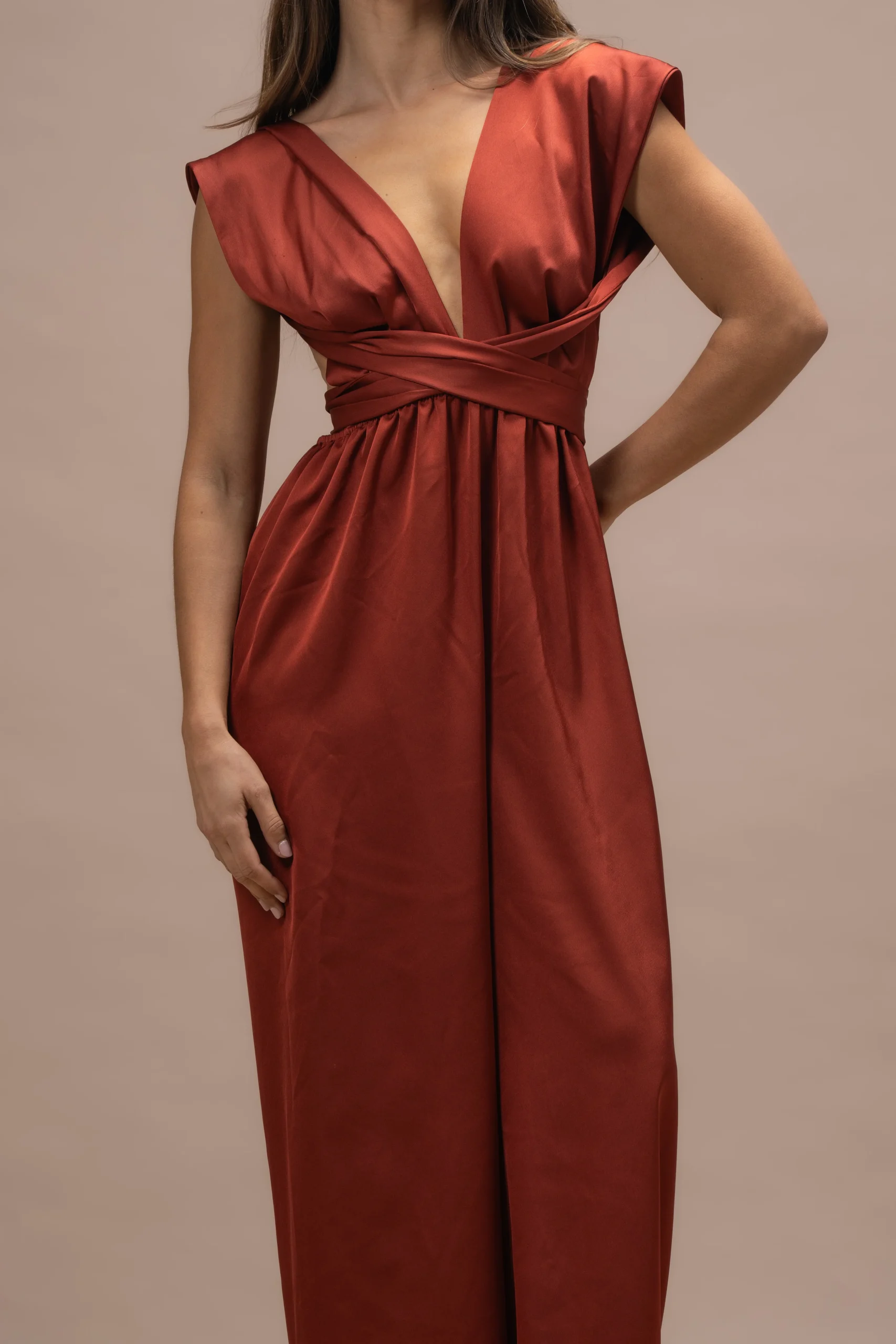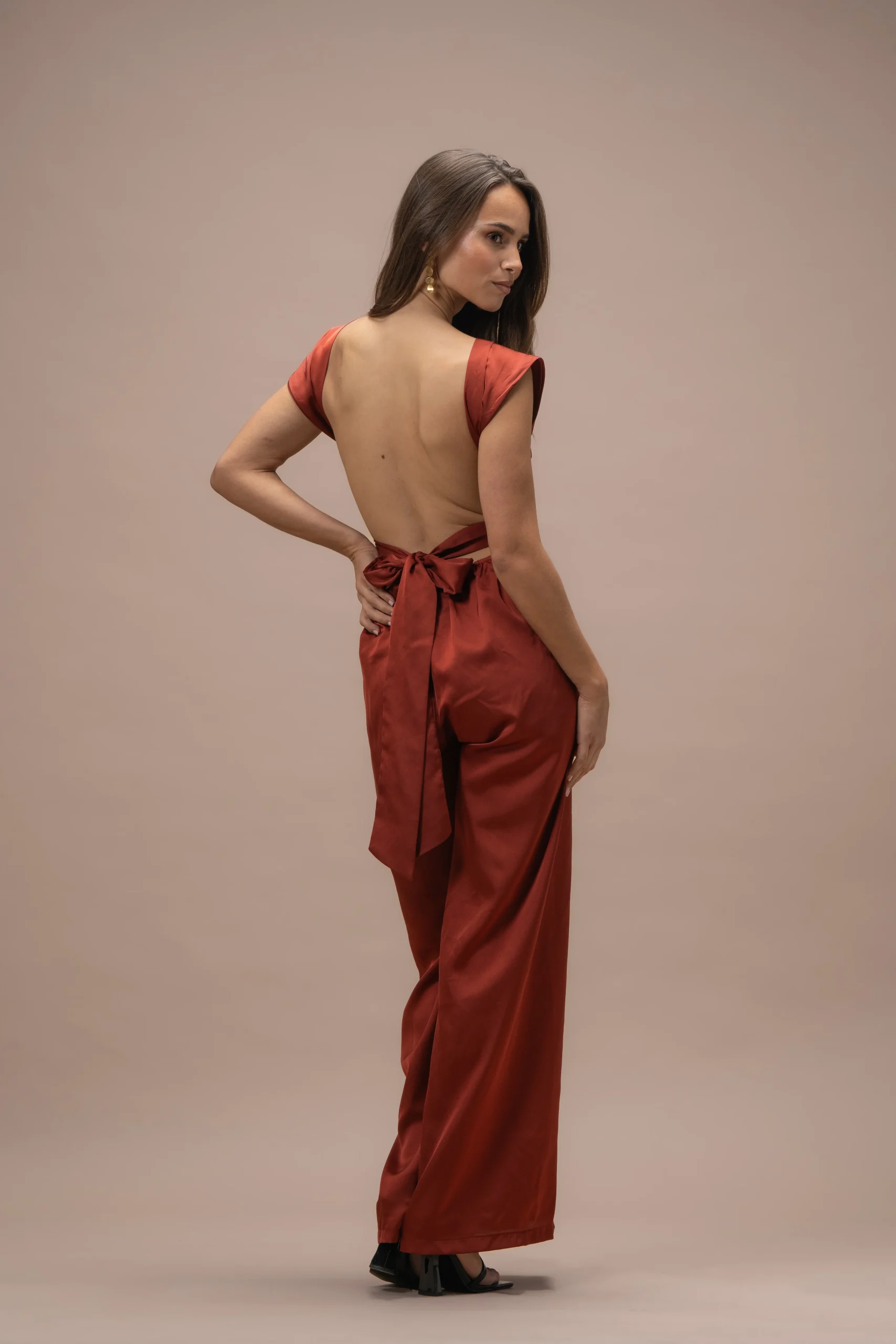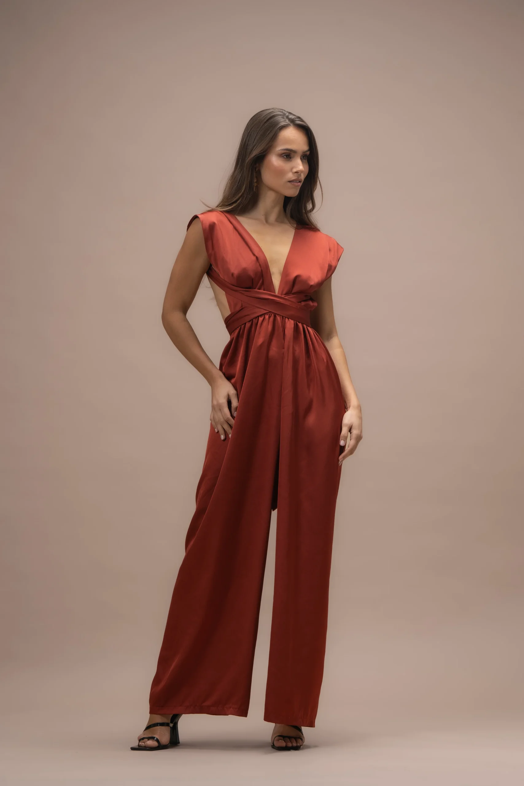 Incarnez l’élégance avec la Combinaison Confiance, une pièce maîtresse qui se distingue par sa capacité à se transformer grâce à ses liens modulables, offrant une infinité de styles. Réalisée dans un tissu satiné d’un riche terracotta foncé, elle marie avec brio le luxe et la polyvalence. Le pantalon fluide accentue son allure sophistiquée, tandis que la matière satinée enveloppe le corps avec légèreté, promettant un confort exceptionnel. Cette combinaison est une véritable ode à la confiance, adaptée à toutes les occasions.