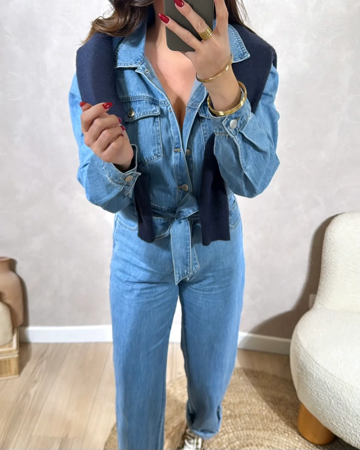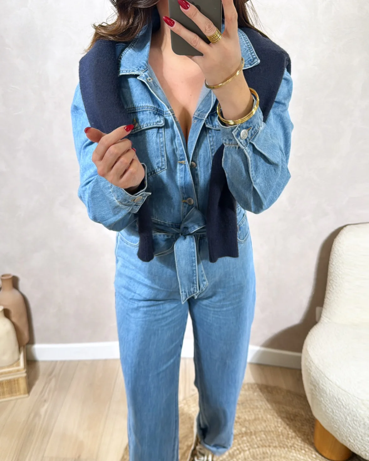 Combinaison Kézia • Fermeture avec boutons • Fournie avec la ceinture • Matière jean • Pauline mesure 1m65 et porte une taille S • Composition : 100% Coton • Mode d’expédition : Colissimo avec ou sans signature. • Livraison offerte à partir de 69€ d’achat