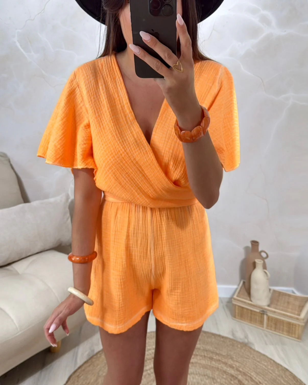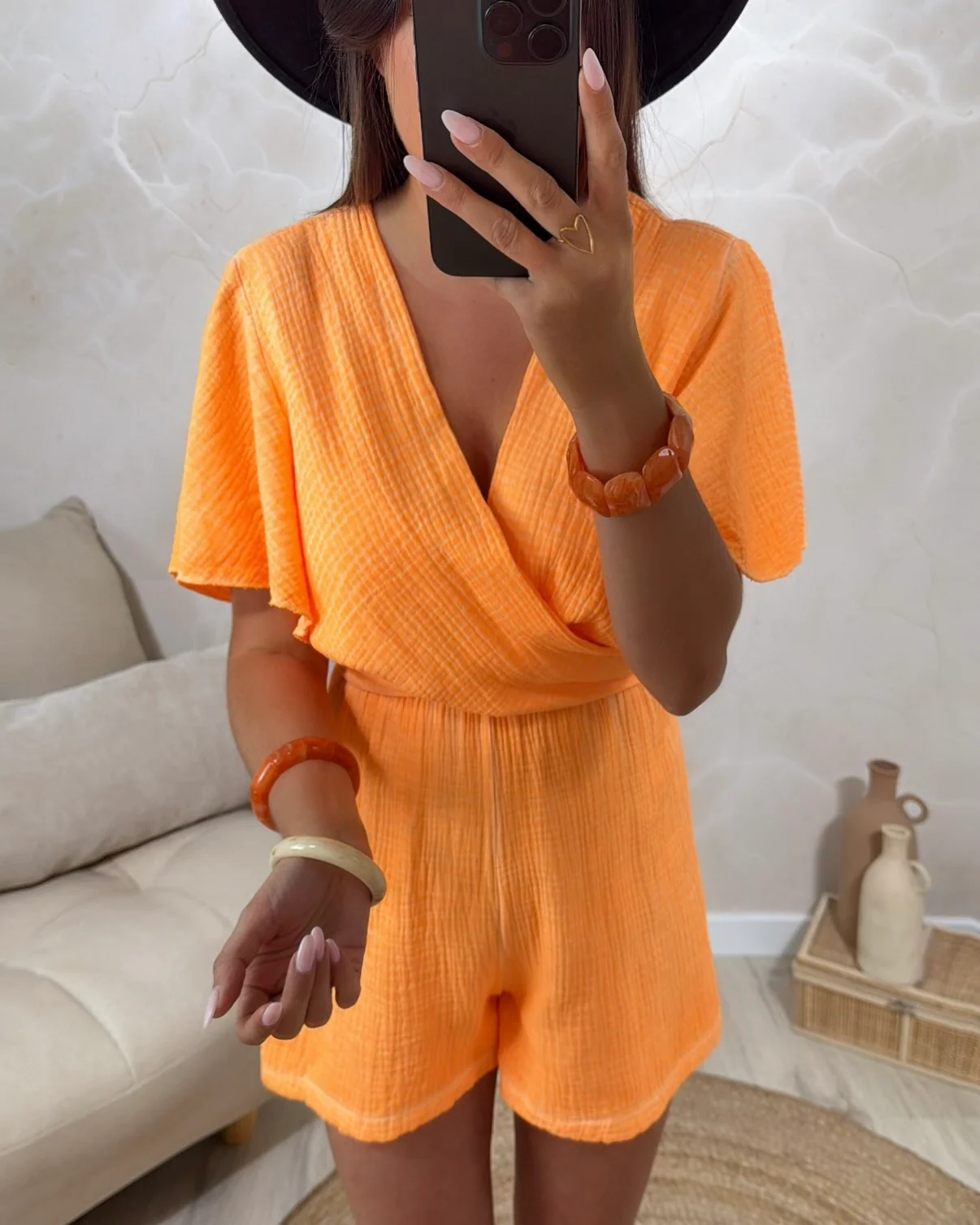 Combishort Amaraya • Noeud à l’arrière • Manches courtes • Pauline mesure 1m65 et porte une taille unique • Mesure 79cm de longueur • Composition : 100% Coton • Mode d’expédition : Colissimo avec ou sans signature. • Livraison offerte à partir de 69€ d’achat