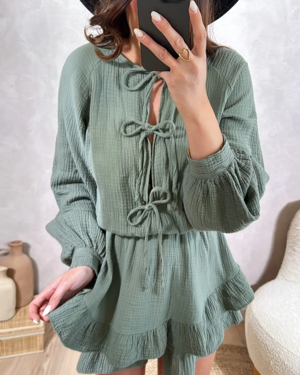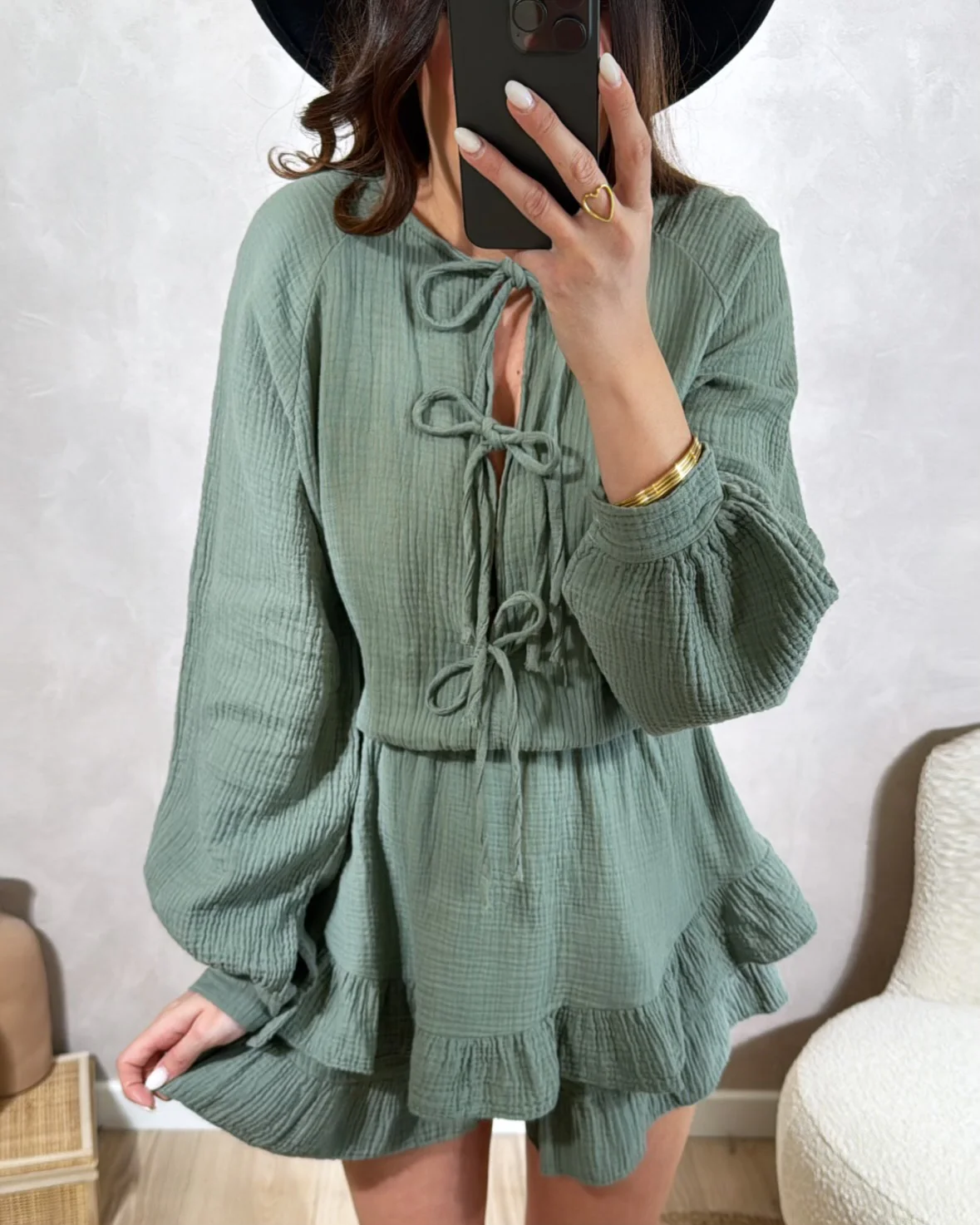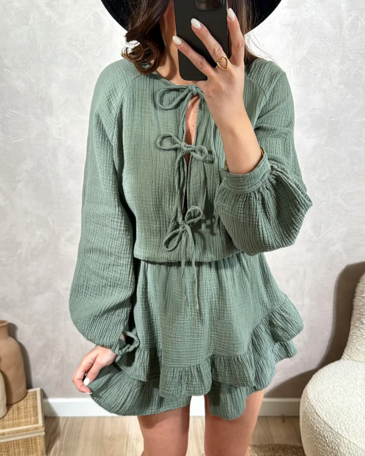 Combishort Eily• Manches longues avec bouton au poignet • Elastiqué à la taille • Fermeture avec nœud• Le modèle mesure 1M65 et porte une taille unique • TU : Longueur 86cm – Largeur 53cm• Composition: 100% Coton• Mode d’expédition : Colissimo avec ou sans signature. • Livraison offerte à partir de 69€ d’achat