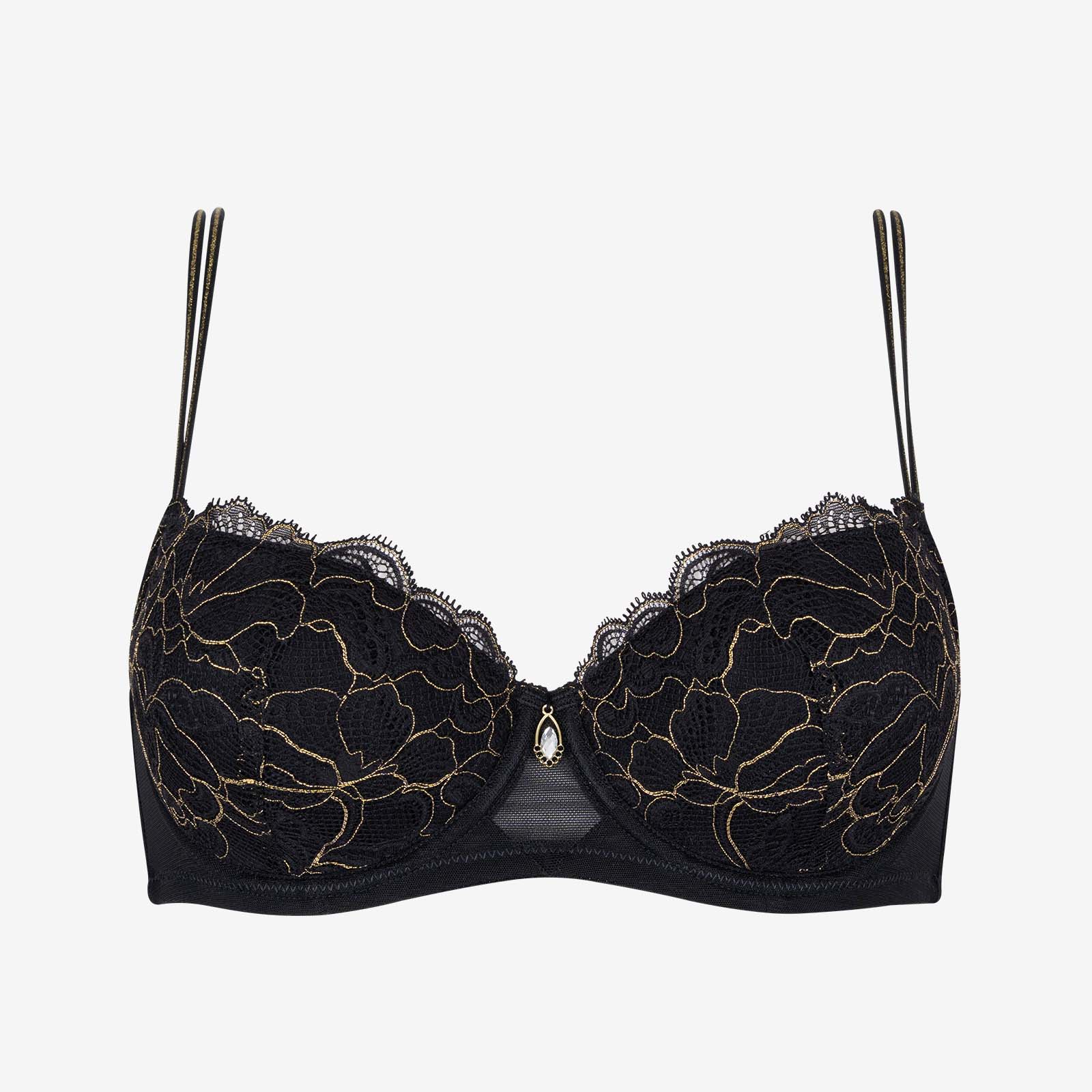 Guide des tailles Ouvrir le guide des tailles Description Bonnet avec mousse cousue en 3 parties Bonnet en dentelle avec 1pince Décolleté bordé par les écailles de la dentelle Entre gorge en double tulle rigide Côtés en tulle lycra doublés en tulle rigide Bijou doré serti de strass qui habille l’entre gorge Dos en tulle […]