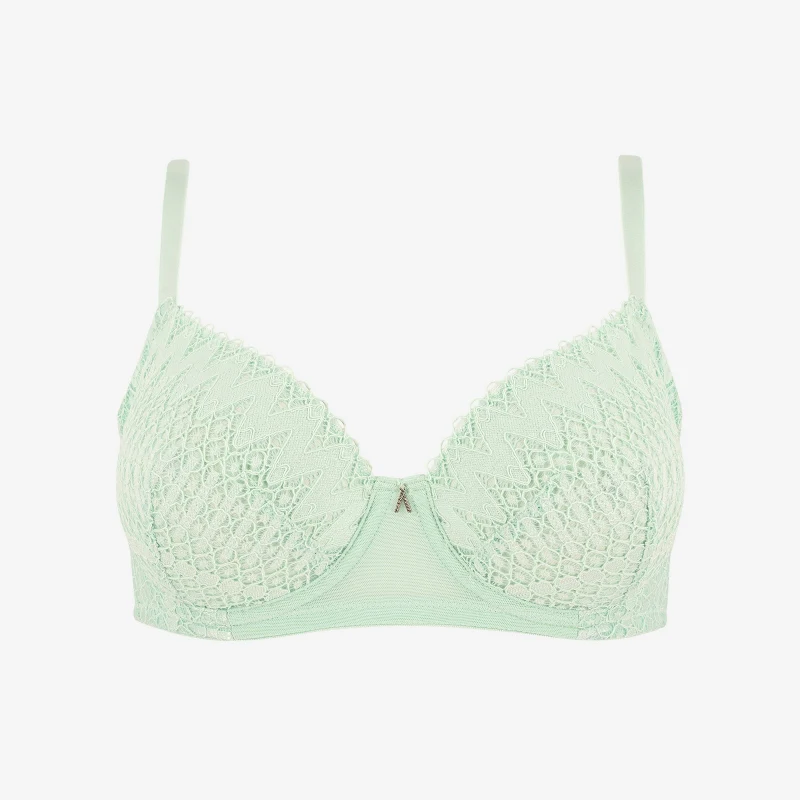 Cette ligne associe avec élégance la modernité de la dentelle géométrique et la délicatesse du tulle transparent et de son bijou en V retourné argenté à strass, le tout sublimé par une teinte rafraîchissante de vert menthe.