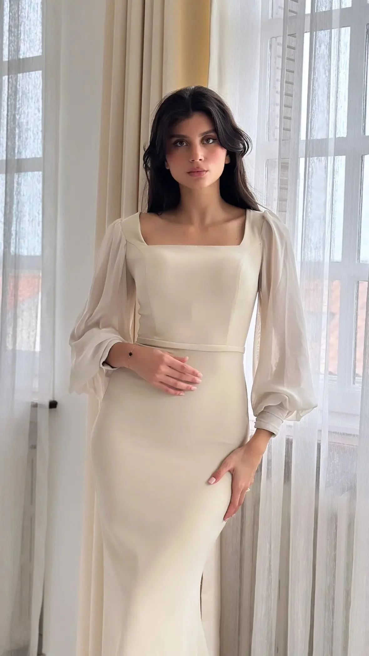 Longue robe couleur beige, sans fente.
