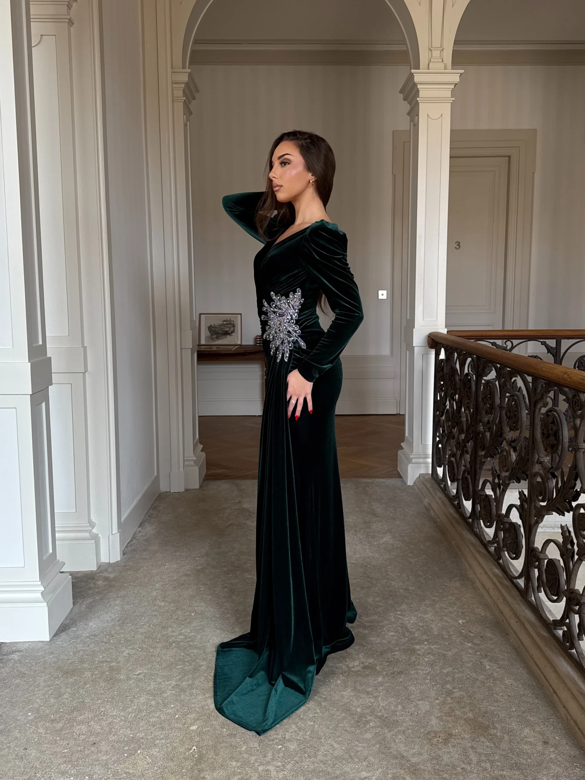 Par ailleurs, le tissu en velours doux confère un aspect luxueux et assure un confort optimal tout au long de la soirée. D’ailleurs, la coupe ajustée de cette robe met en valeur la silhouette avec beaucoup de finesse. En outre, les détails plissés autour de la taille soulignent vos courbes tout en ajoutant une touche sophistiquée. De surcroît, les manches longues et les broderies délicates renforcent son élégance intemporelle.