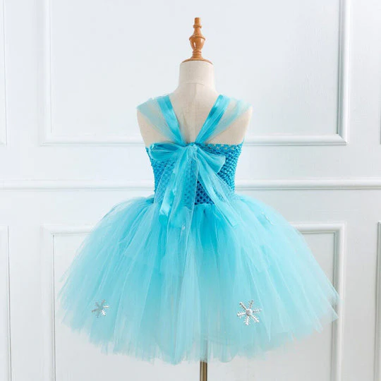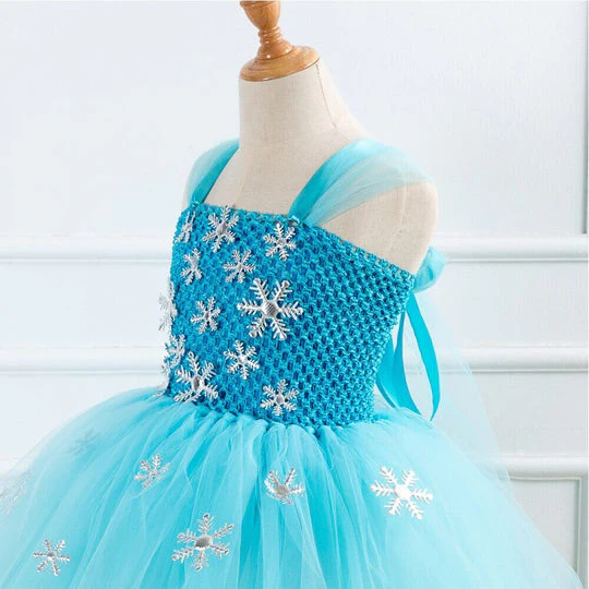 Cette magnifique robe de princesse des neiges fera rêver toutes les petites fans d’univers enchantés. D’un bleu éclatant rappelant la magie hivernale, elle est ornée de superbes flocons scintillants sur le corsage et la jupe. Le haut en tissu extensible et ajouré assure un ajustement confortable, tandis que la jupe volumineuse en tulle offre un effet féerique et majestueux.