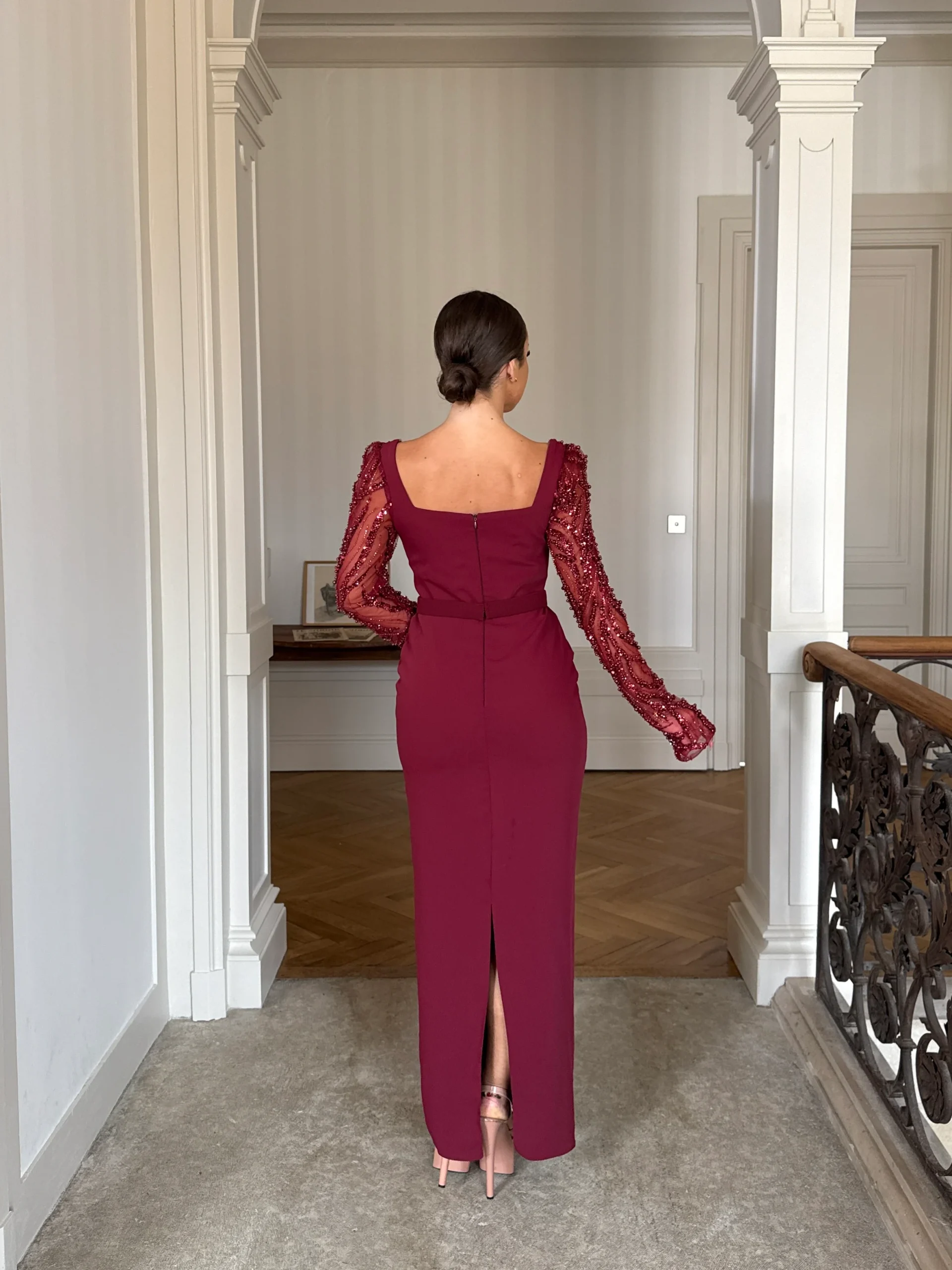 Par ailleurs, cette robe de soirée bordeaux séduit immédiatement par ses manches longues en tulle, délicatement ornées de perles et de broderies raffinées. Ces détails apportent une touche précieuse et lumineuse, tout en conservant une grande élégance. De plus, la fente subtile à l’arrière assure une démarche fluide et gracieuse, ajoutant une note sensuelle tout en restant sophistiquée.