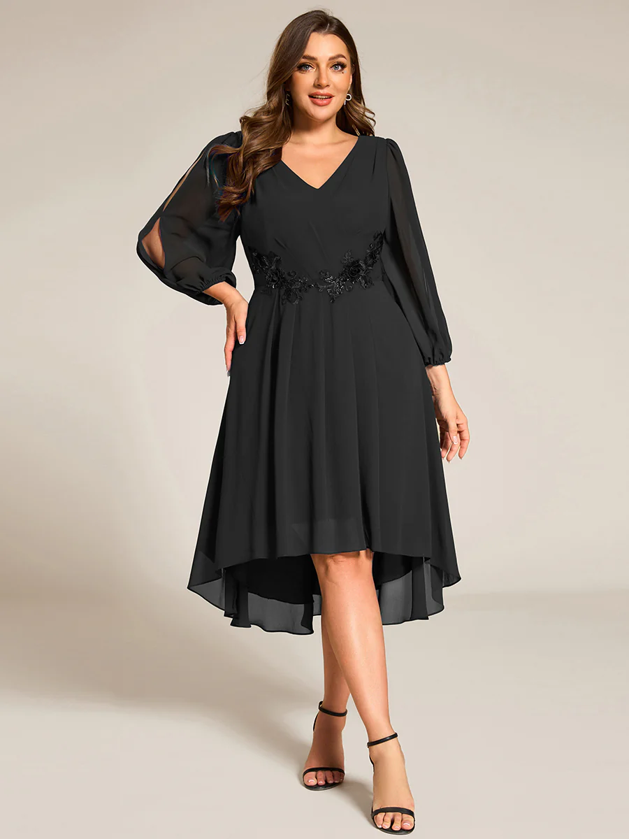 Faites une entrée élégante avec notre robe d’invitée de mariage en mousseline de soie mi-longue à manches longues et appliques à la taille. Cette robe sophistiquée présente une silhouette trapèze avec une applique délicate à la taille, ajoutant une touche de charme. Les manches longues offrent un look gracieux, tandis que le tissu en mousseline léger assure le confort tout au long de l’événement. Parfaite pour les mariages ou les rassemblements officiels, cette robe allie style et sophistication sans effort.