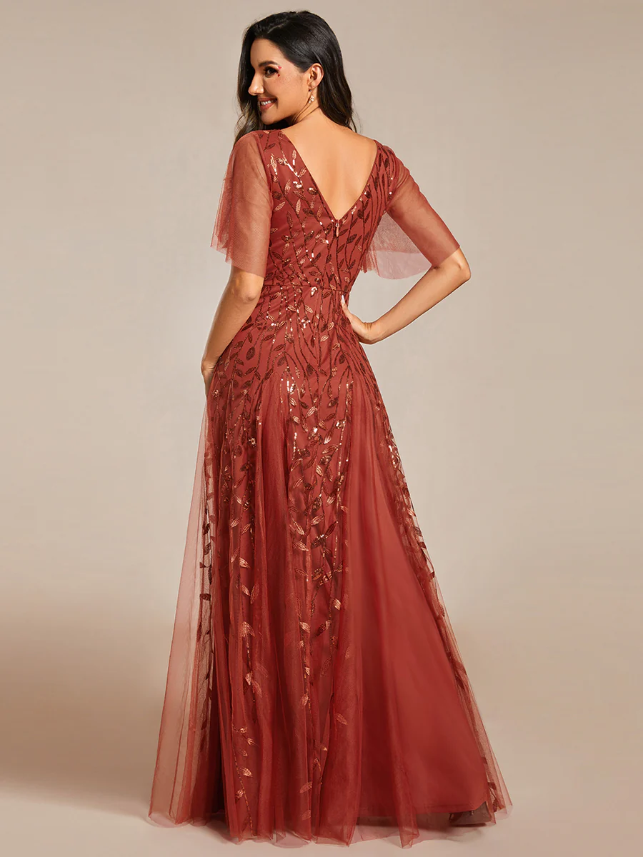 ever ASTRAL|Robe de Soirée Longue Romantique et Scintillante à Col V et Pailletes