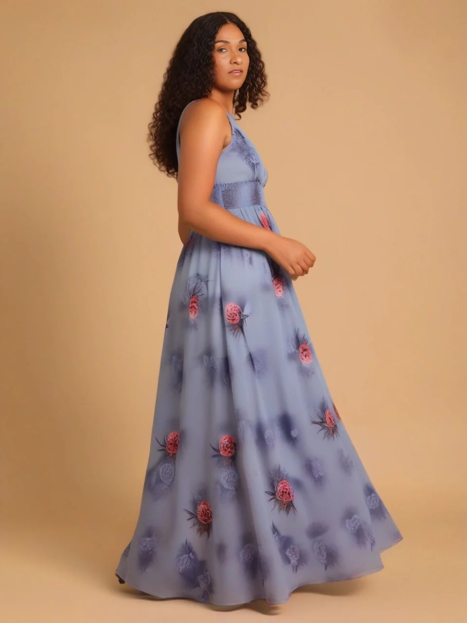 Cette robe en mousseline vous séduira par son imprimé délicat et son col en V qui sublime le décolleté. Fluide et légère, elle épouse gracieusement vos mouvements tout en vous offrant un confort absolu. Sans manches pour une élégance intemporelle, elle est idéale pour les soirées où vous souhaitez allier sophistication et liberté. Un modèle qui vous fera briller sans effort, de l’apéritif à la piste de danse !