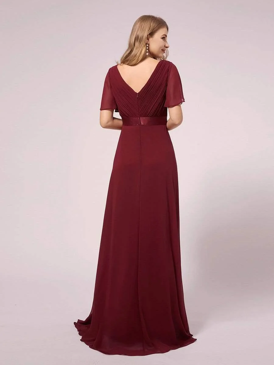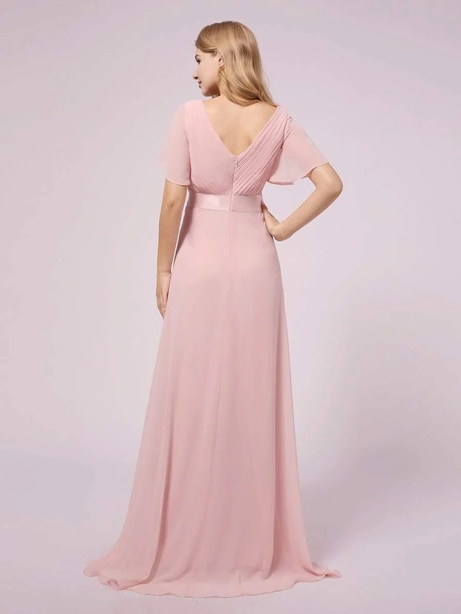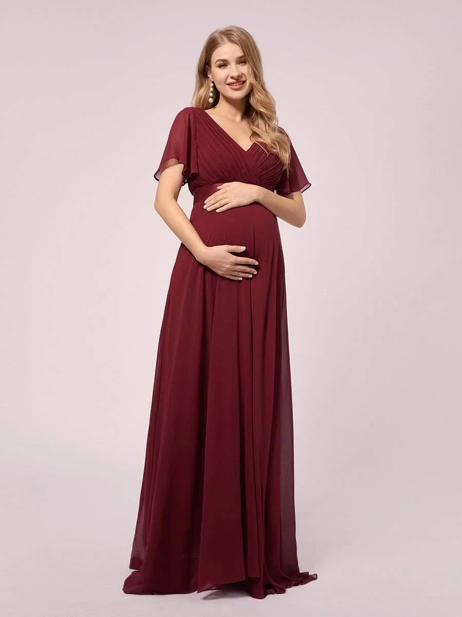 Nous pouvons facilement dire que cette jolie robe de maternité pour demoiselle d’honneur est unique en son genre. Cette robe de demoiselle d’honneur est si élégante et adorable car elle présente des manches courtes évasées et un col en v. La décoration plissée sur le buste et le ruban à la taille se combinent pour donner à la robe un aspect unique et classique.
