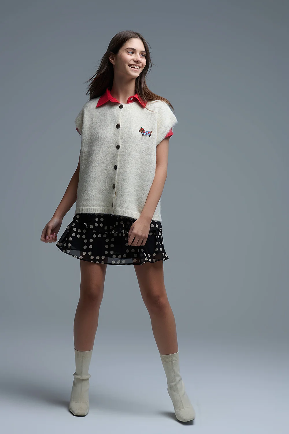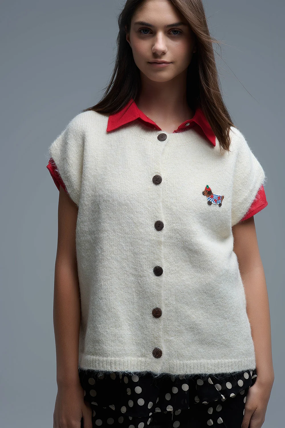 Gilet décontracté en tricot crème avec broderie d’un chien mignon