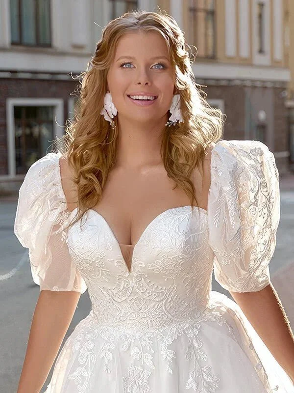Notre robe de mariée trapèze en tulle est tout simplement époustouflante. Elle est ornée de motifs appliqués de dentelle qui ajoutent une touche de romantisme et d’élégance à la tenue. La silhouette flatteuse mettra en valeur vos courbes et la longueur de balayage apportera une touche de glamour et d’élégance à votre tenue.