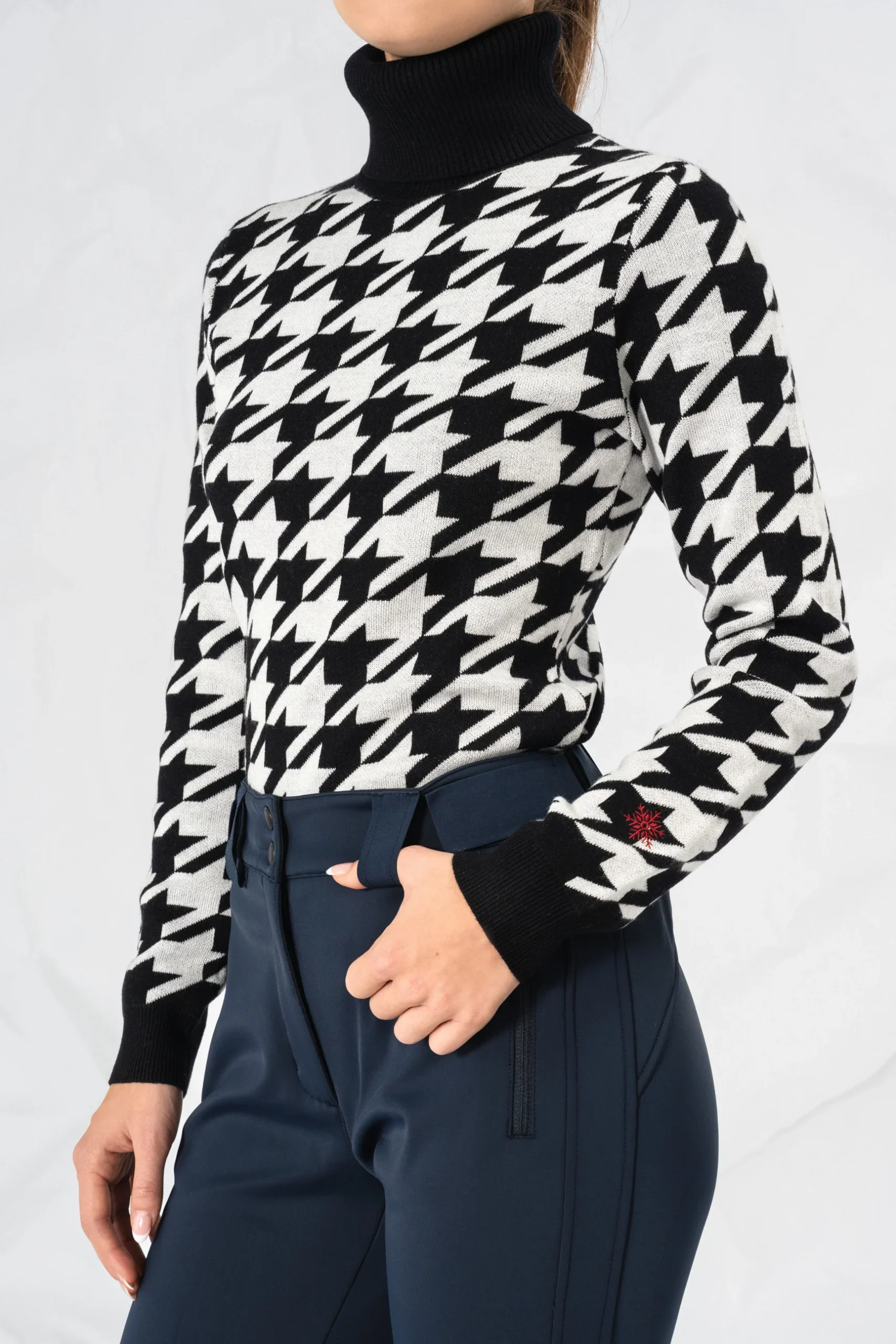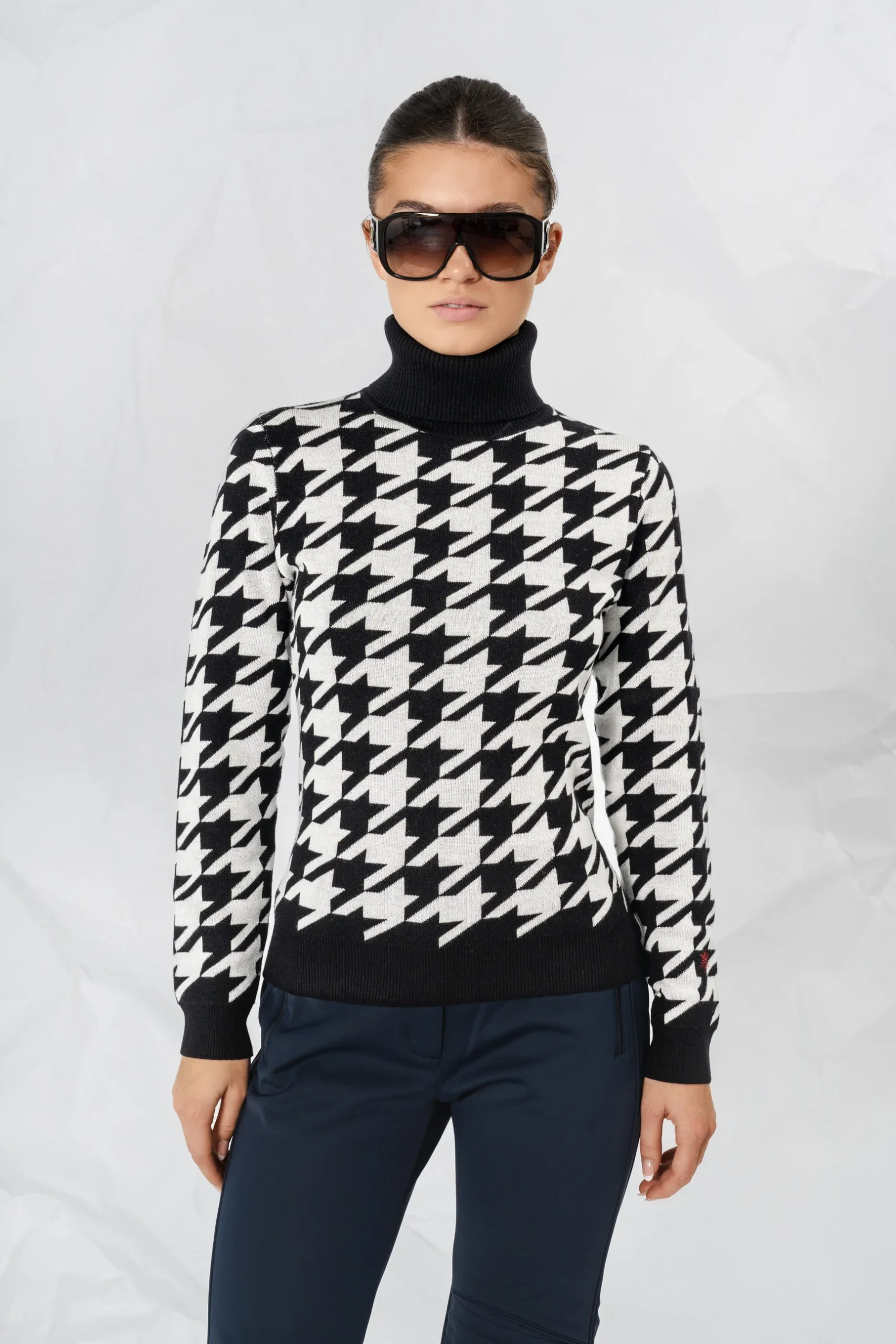 TechWool ™ vous offre un confort et une chaleur optimaux. Laine mérinos ultrafine (17,5 microns) luxueuse et anti-démangeaisons. Ce pull de ski à motif pied-de-poule est parfait pour les escapades en chalet et l’après-ski. Sa coupe ajustée, avec un revers à la taille et un col côtelé, ne gâchera pas votre maquillage. Vous partez pour Hemsedal ou Courchevel ? Voilà !