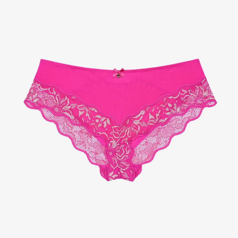Notre dentelle de fils recyclés réserve des trésors de surprises : bicolore, elle propose un coloris fuchsia sublimé par des reflets argentés. Contrastée dans sa composition florale par des volutes géométriques et une résille plus aérée. Une microfibre unie ultra douce lui est associée. Un bijou doré serti d’une perle fuchsia coordonnée complète les produits.