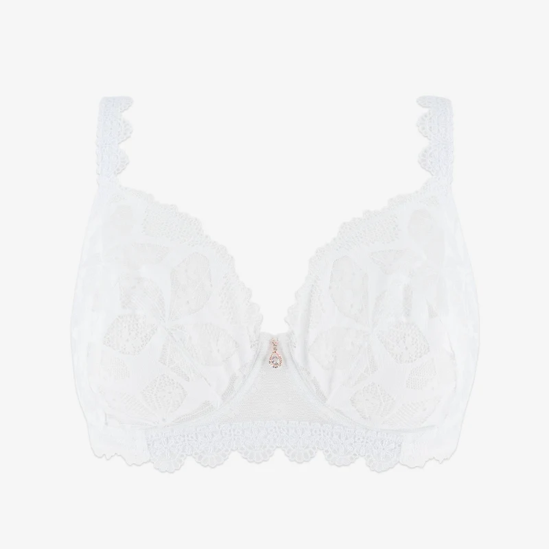 Ses grands motifs floraux, au graphisme fort et audacieux, apportent une touche contemporaine et dynamique à cette collection. La dentelle blanche éclatante se marie parfaitement avec ces motifs affirmés, créant un contraste saisissant et élégant. Les détails en guipure viennent sublimer l’ensemble, offrant une finition sophistiquée. Cette ligne incarne une féminité moderne, éclatante et résolument raffinée.