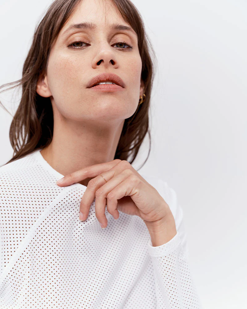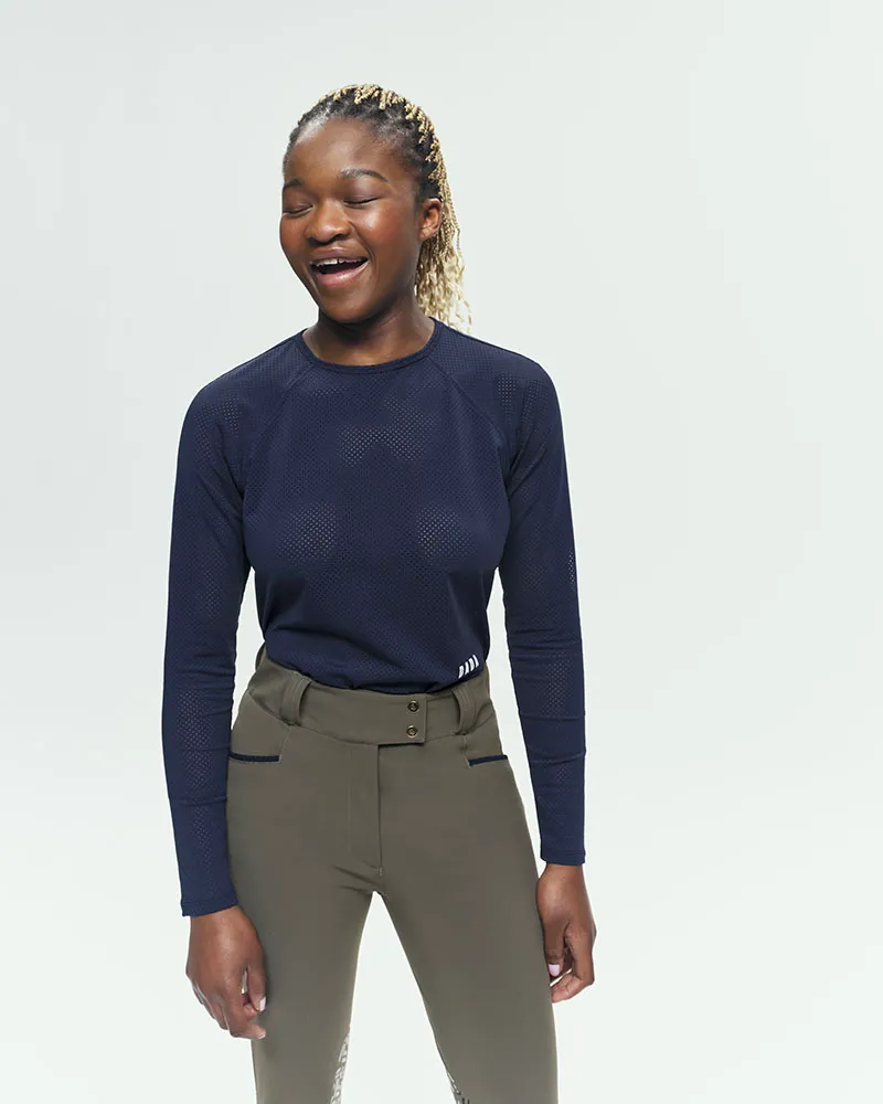 T-shirt technique d’équitation à manches longues, conçu pour les cavalières en quête de performance. Son tissu italien micro-perforé et éco-responsable offre une respirabilité exceptionnelle, une protection UV UPF 50+ et un confort absolu en mouvement. Sa coupe cintrée, son col rond et son design épuré allient élégance et technicité pour vous accompagner dans chaque entraînement.