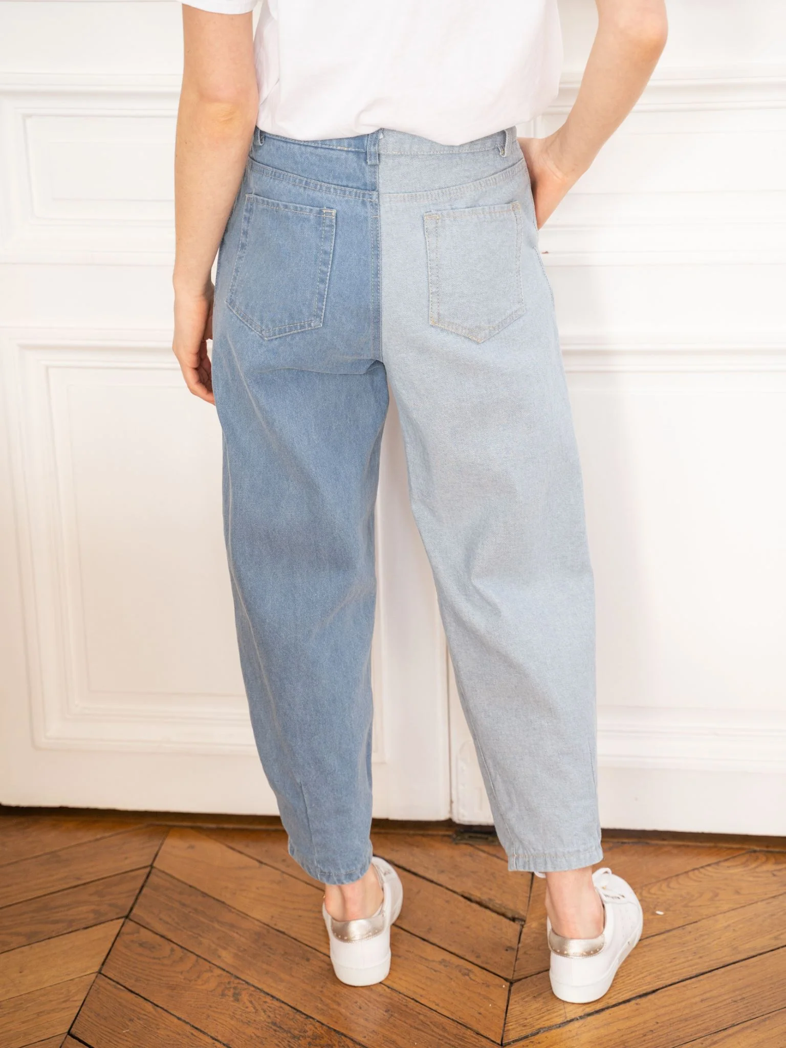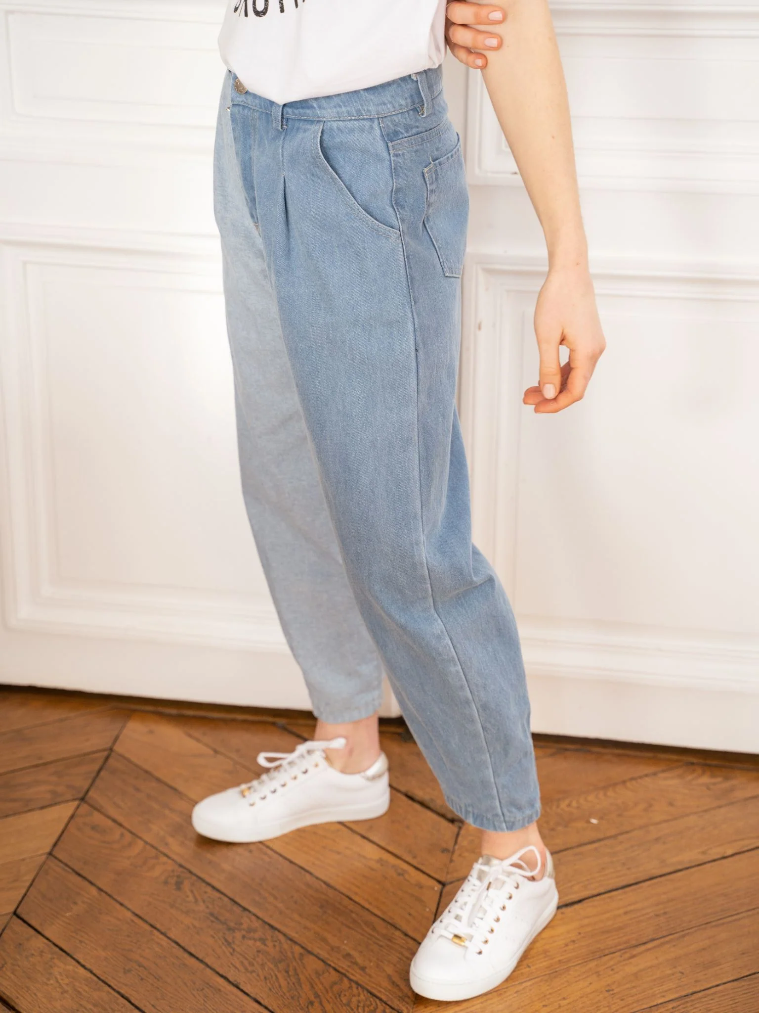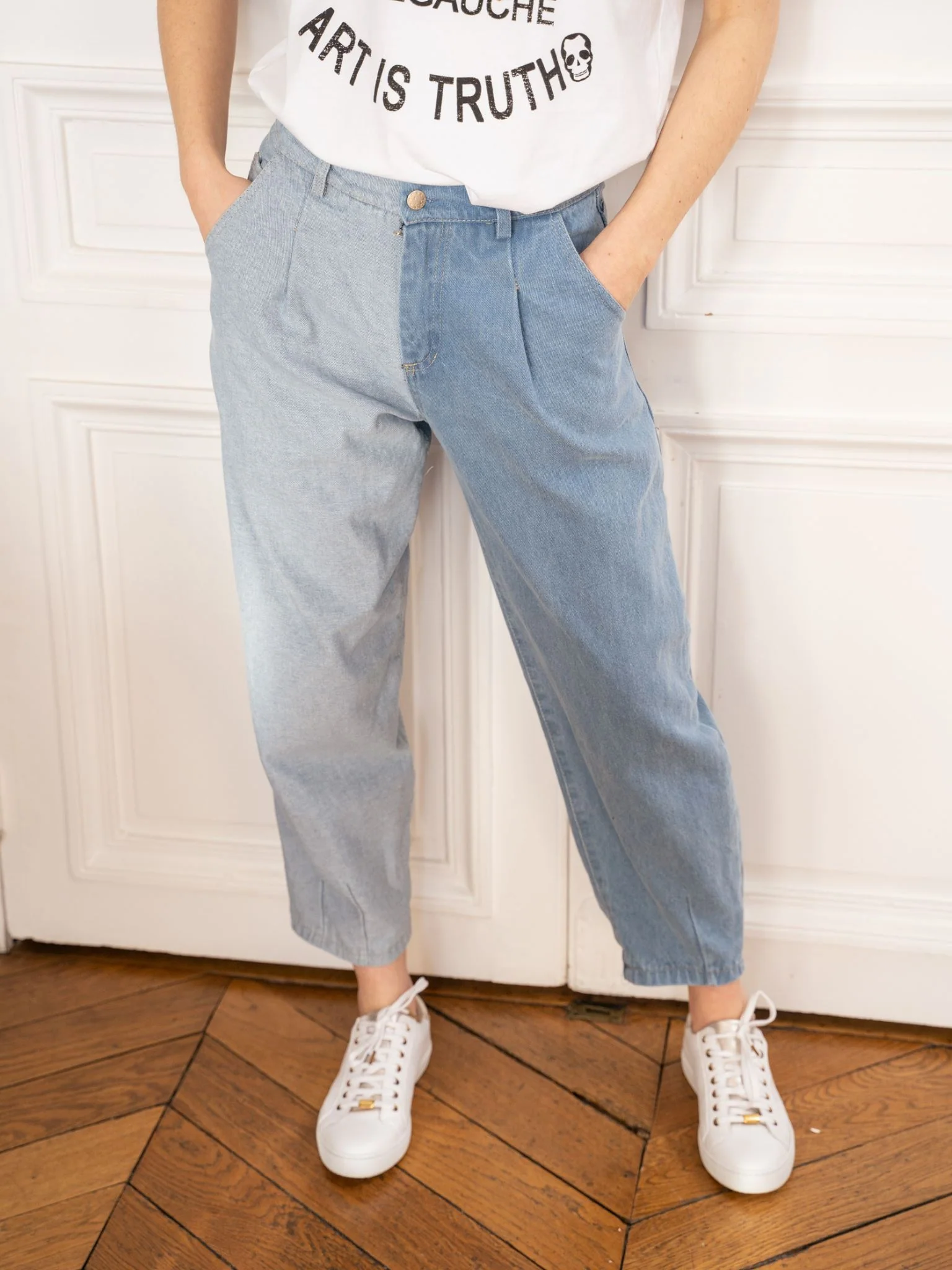 Détails: Modèle slouchy Bicolore bleu clair et bleu foncé Coupe ample Poches latérales Plissures à la base 2 poches à l’arrière Longueur 90 cm Largeur 36 cm Composition: 100% coton Conseil d’entretien: lavage 30°C Émilie mesure 1m70 et porte une taille S