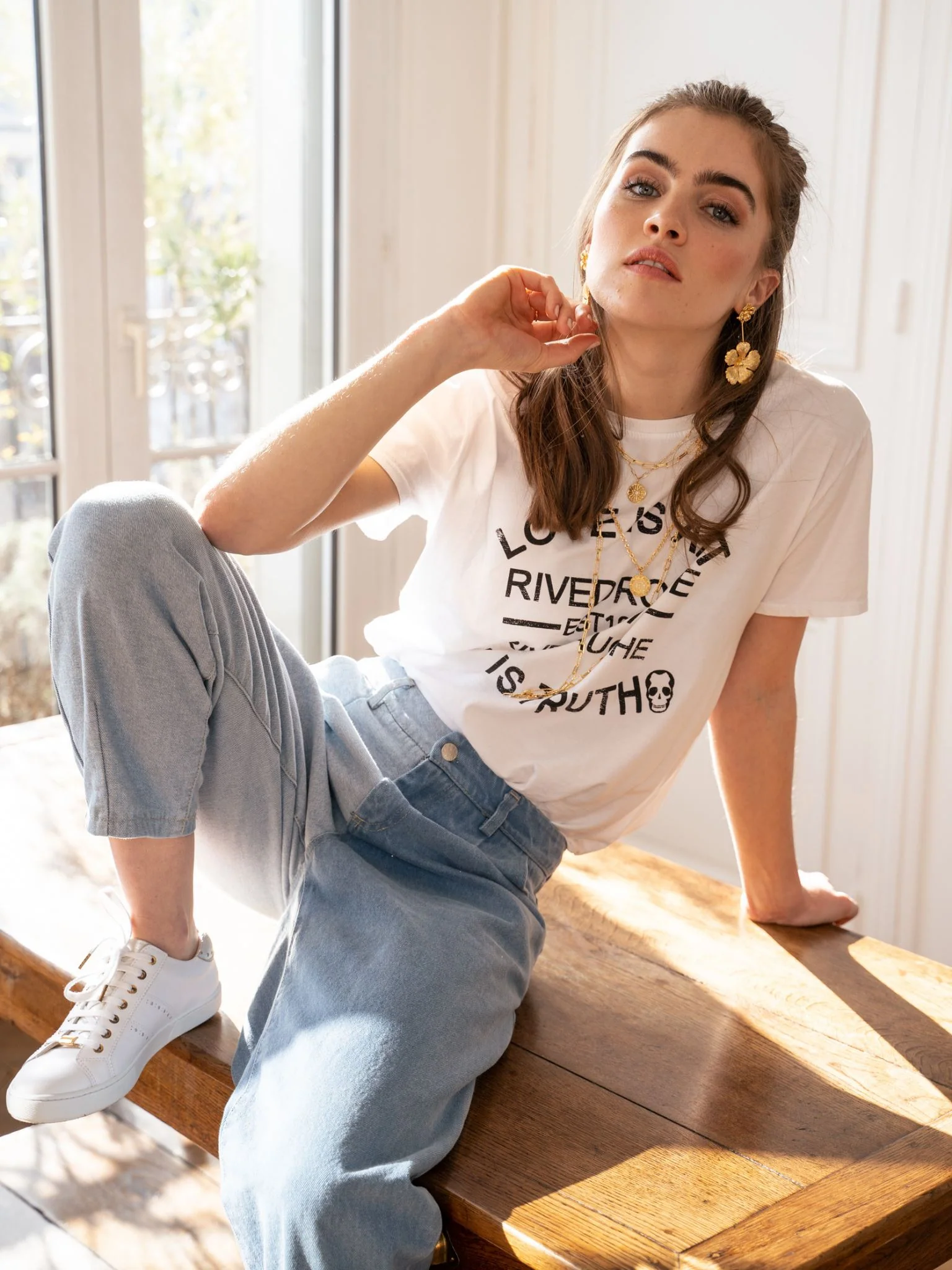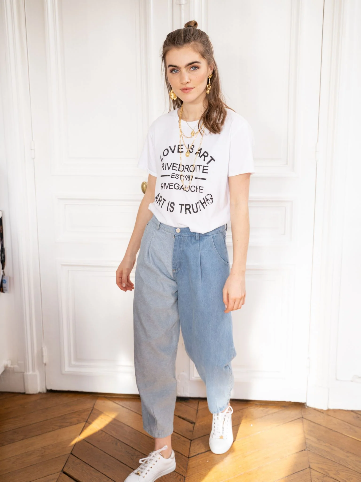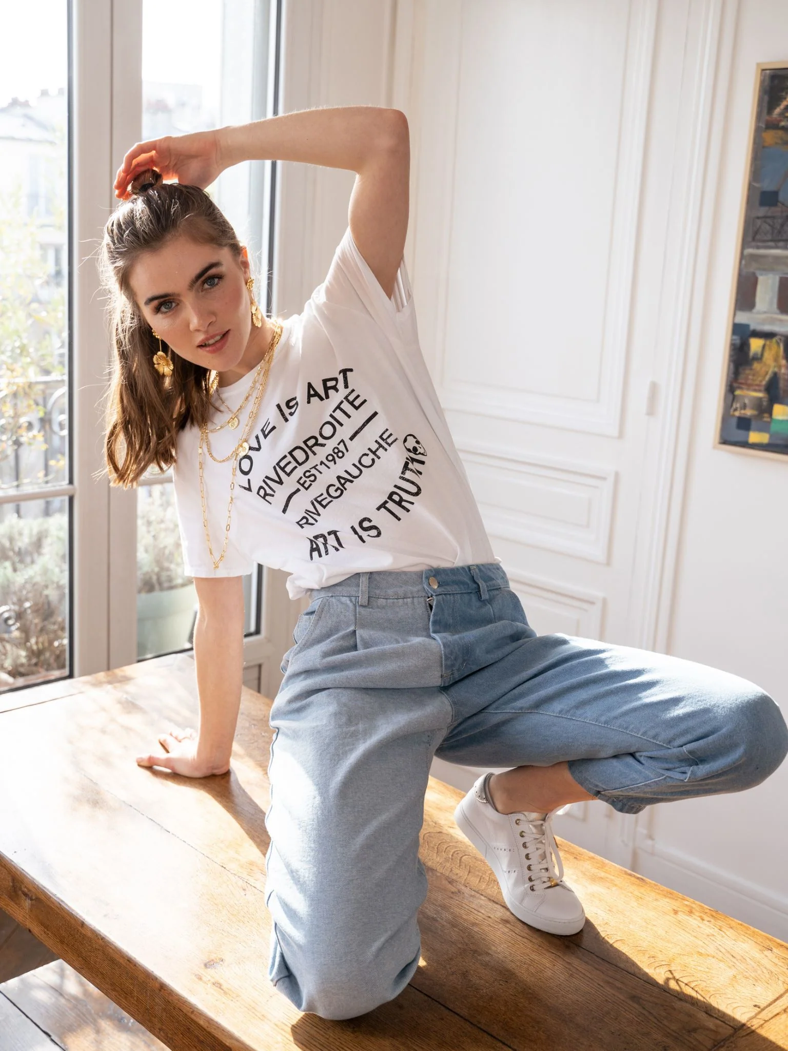 Détails: Modèle slouchy Bicolore bleu clair et bleu foncé Coupe ample Poches latérales Plissures à la base 2 poches à l’arrière Longueur 90 cm Largeur 36 cm Composition: 100% coton Conseil d’entretien: lavage 30°C Émilie mesure 1m70 et porte une taille S